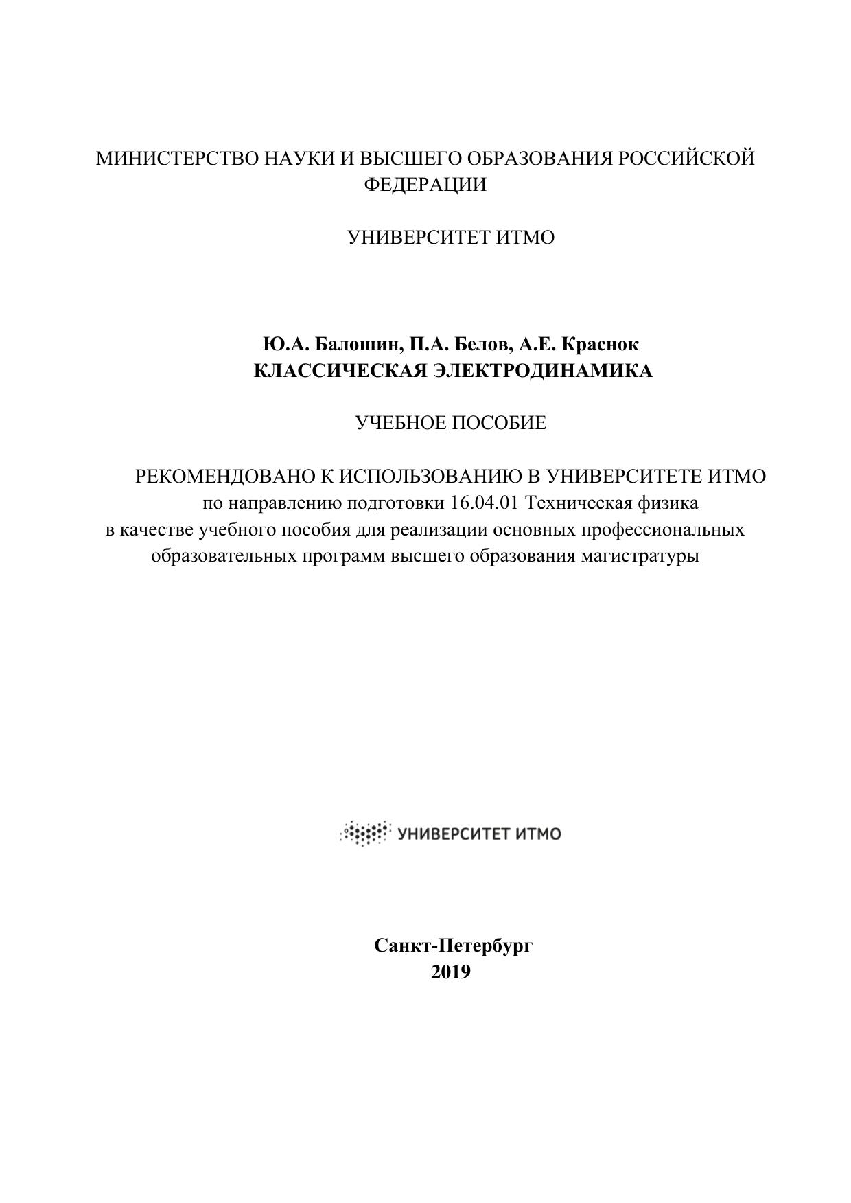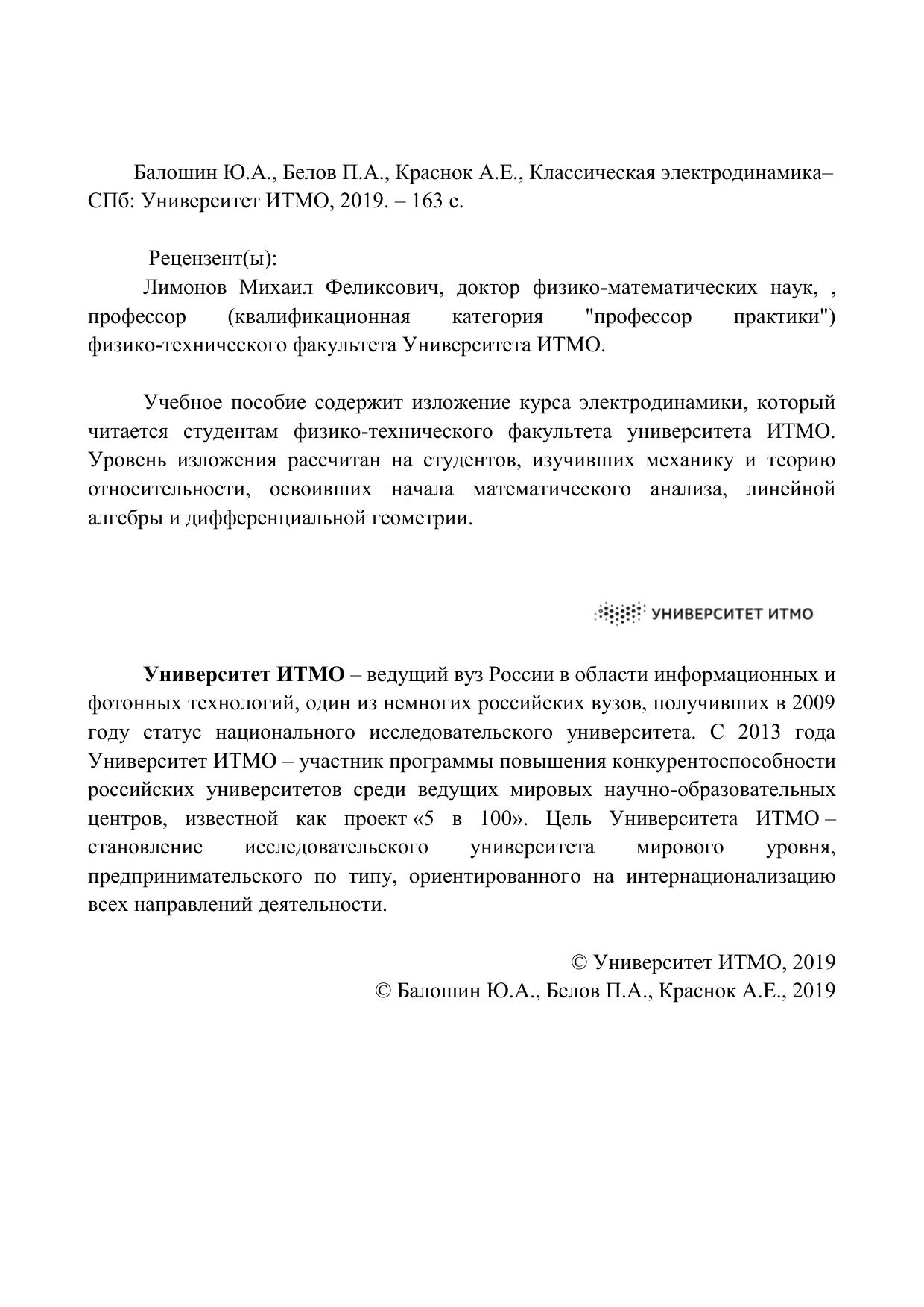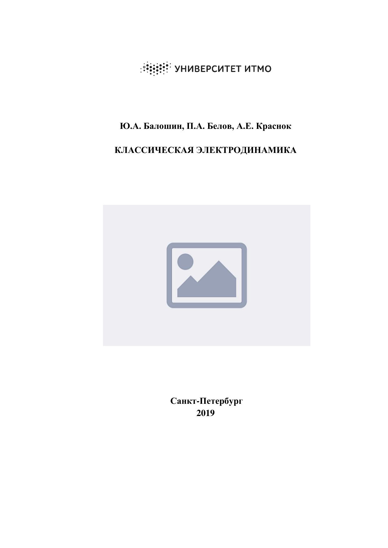 Учебное пособие содержит изложение курса электродинамики, который читается студентам физико-технического факультета университета ИТМО. Уровень изложения рассчитан на студентов, изучивших механику и теорию относительности, освоивших начала математического анализа, линейной алгебры и дифференциальной геометрии.
