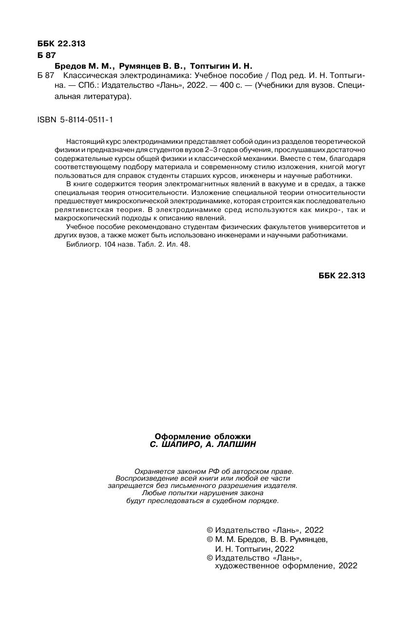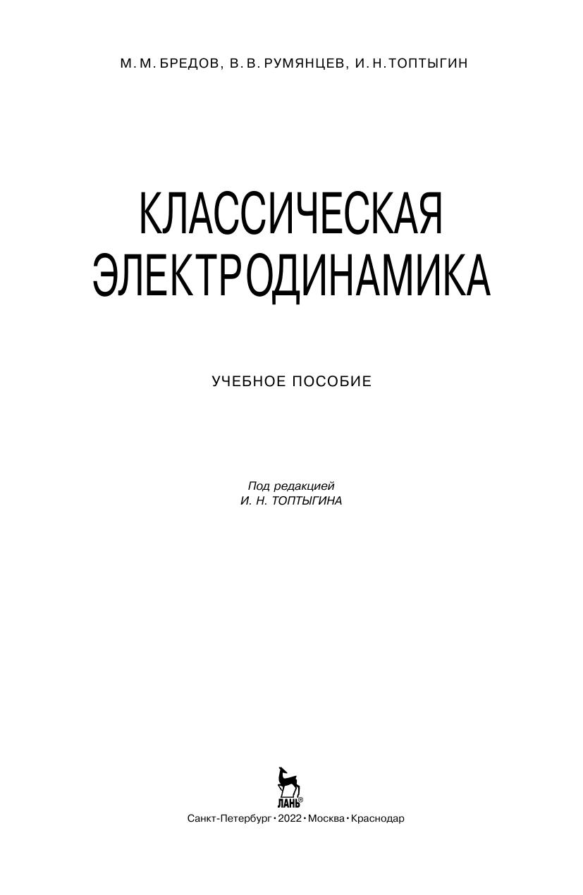 Настоящий курс электродинамики представляет собой один из разделов теоретической физики и предназначен для студентов вузов 2–3 годов обучения, прослушавших достаточно содержательные курсы общей физики и классической механики. Вместе с тем, благодаря соответствующему подбору материала и современному стилю изложения, книгой могут пользоваться для справок студенты старших курсов, инженеры и научные работники. В книге содержится теория электромагнитных явлений в вакууме и в средах, а также специальная теория относительности. Изложение специальной теории относительности предшествует микроскопической электродинамике, которая строится как последовательно релятивистская теория. В электродинамике сред используются как микроскопический, так и макроскопический подходы к описанию явлений. Для студентов физических факультетов университетов и других вузов. Может быть использована инженерами и научными работниками.