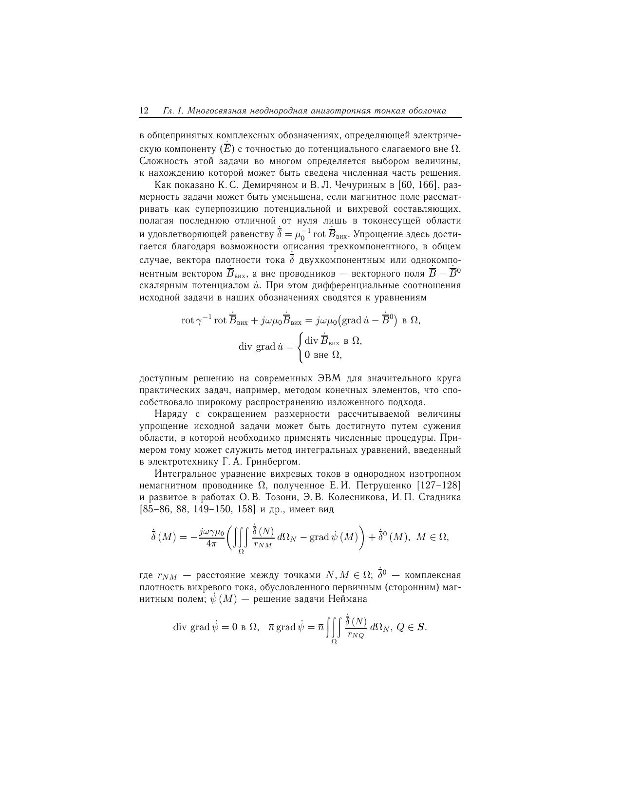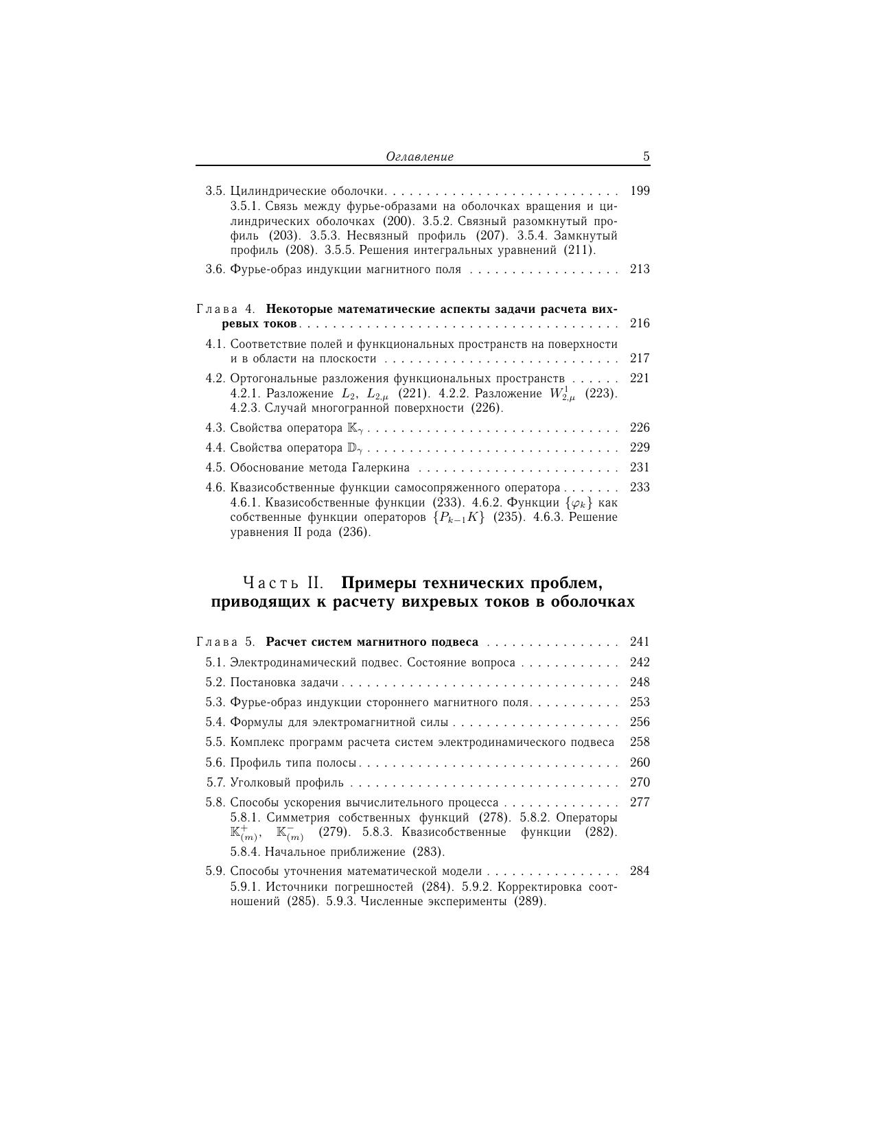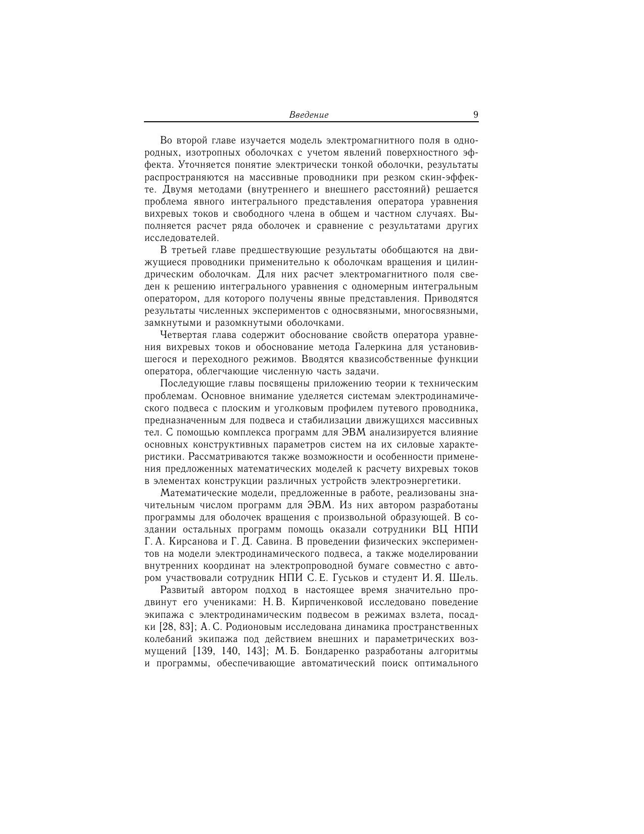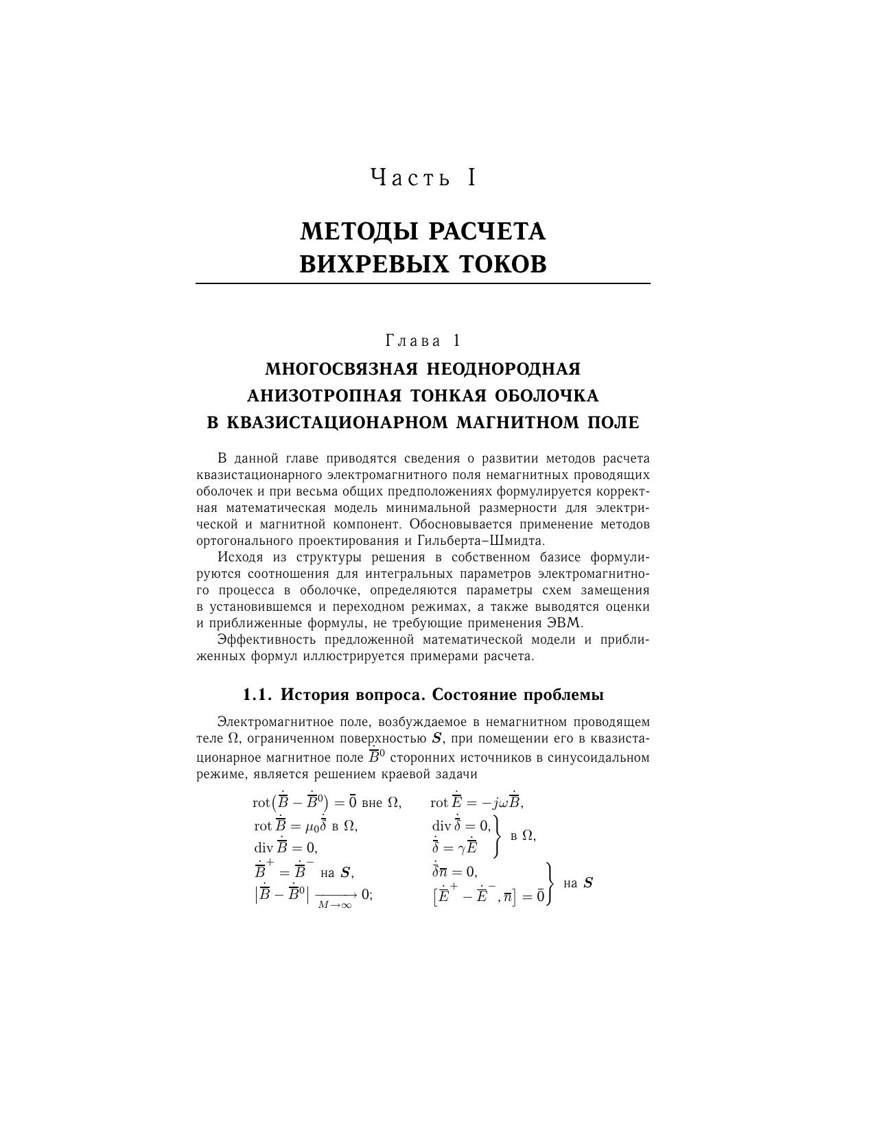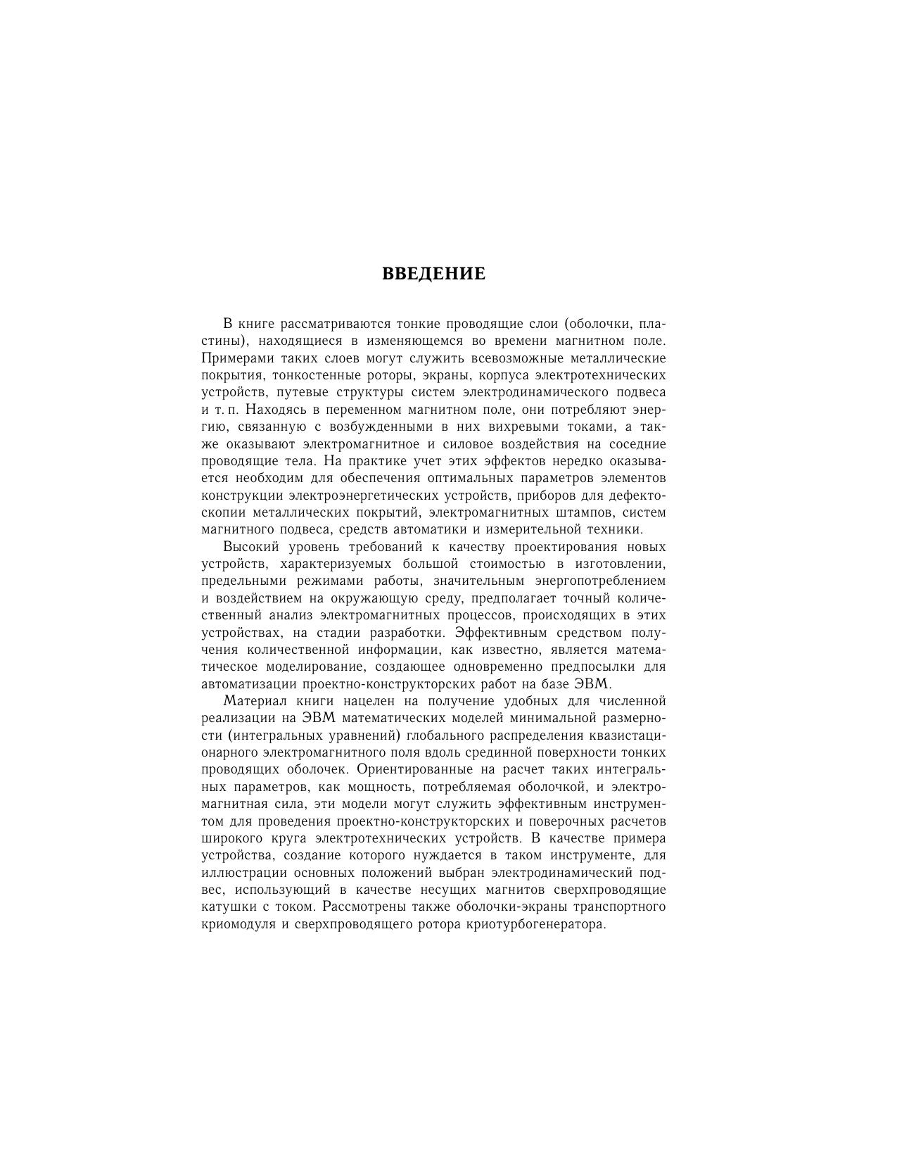 В книге изложены методы расчета квазистационарного электромагнитного поля замкнутых и разомкнутых многосвязных немагнитных оболочек с неоднородной и анизотропной проводимостью. В основу расчета положены замена оболочки проводящей поверхностью и скалярное интегральное уравнение для функции вихревого тока. Значительное внимание уделено явным представлениям оператора интегрального уравнения, исследованию его свойств, оценкам интегральных параметров электромагнитного процесса и приближенным формулам. Рассмотрены установившийся и переходный режимы для неподвижных и движущихся оболочек. Приведены многочисленные примеры расчетов. Эффективность теории демонстрируется задачами о электродинамическом подвесе транспортных средств, о потерях на вихревые токи в оболочках-экранах криотурбогенератора и транспортного криомодуля. Для научных работников и инженеров, специализирующихся в области расчета электромагнитных полей.