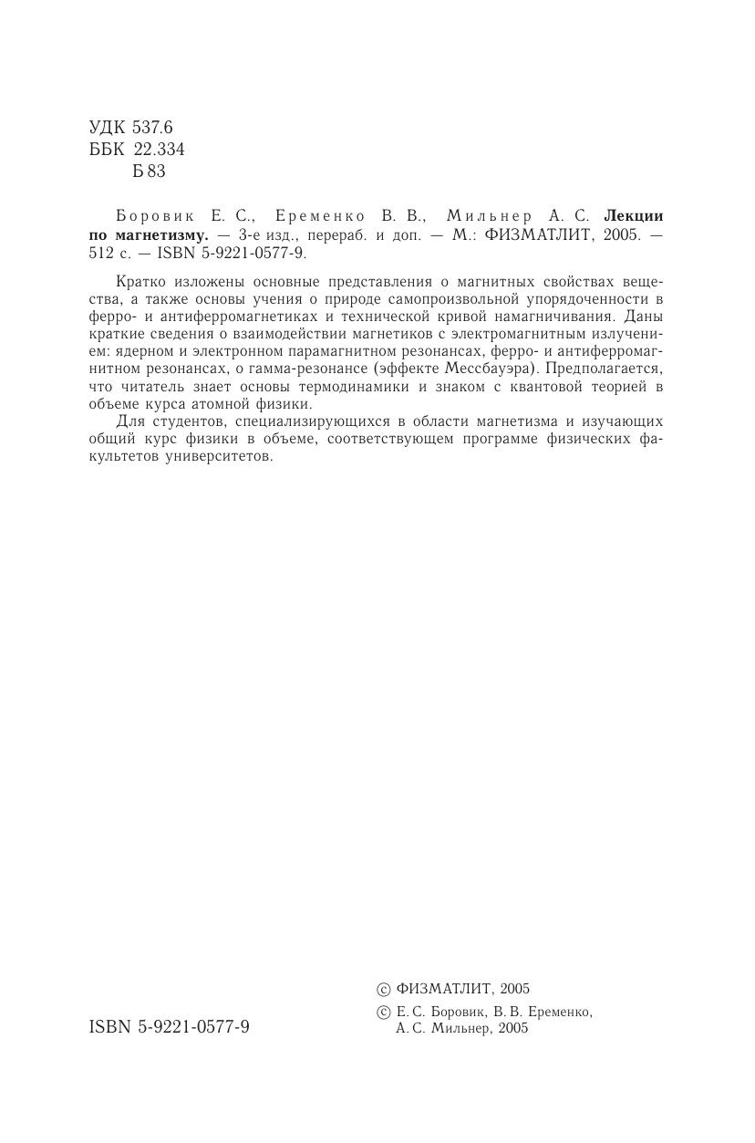 Кратко изложены основные представления о магнитных свойствах вещества, а также основы учения о природе самопроизвольной упорядоченности в ферро- и антиферромагнетиках и технической кривой намагничивания. Даны краткие сведения о взаимодействии магнетиков с электромагнитным излучением: ядерном и электронном парамагнитном резонансах, ферро- и антиферромагнитном резонансах, о гамма-резонансе (эффекте Мессбауэра). Предполагается, что читатель знает основы термодинамики и знаком с квантовой теорией в объеме курса атомной физики.Для студентов, специализирующихся в области магнетизма и изучающих общий курс физики в объеме, соответствующем программе физических факультетов университетов.