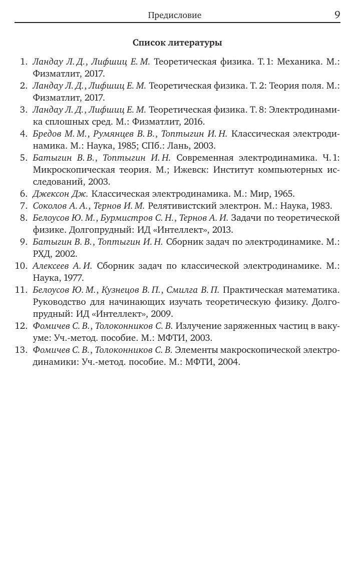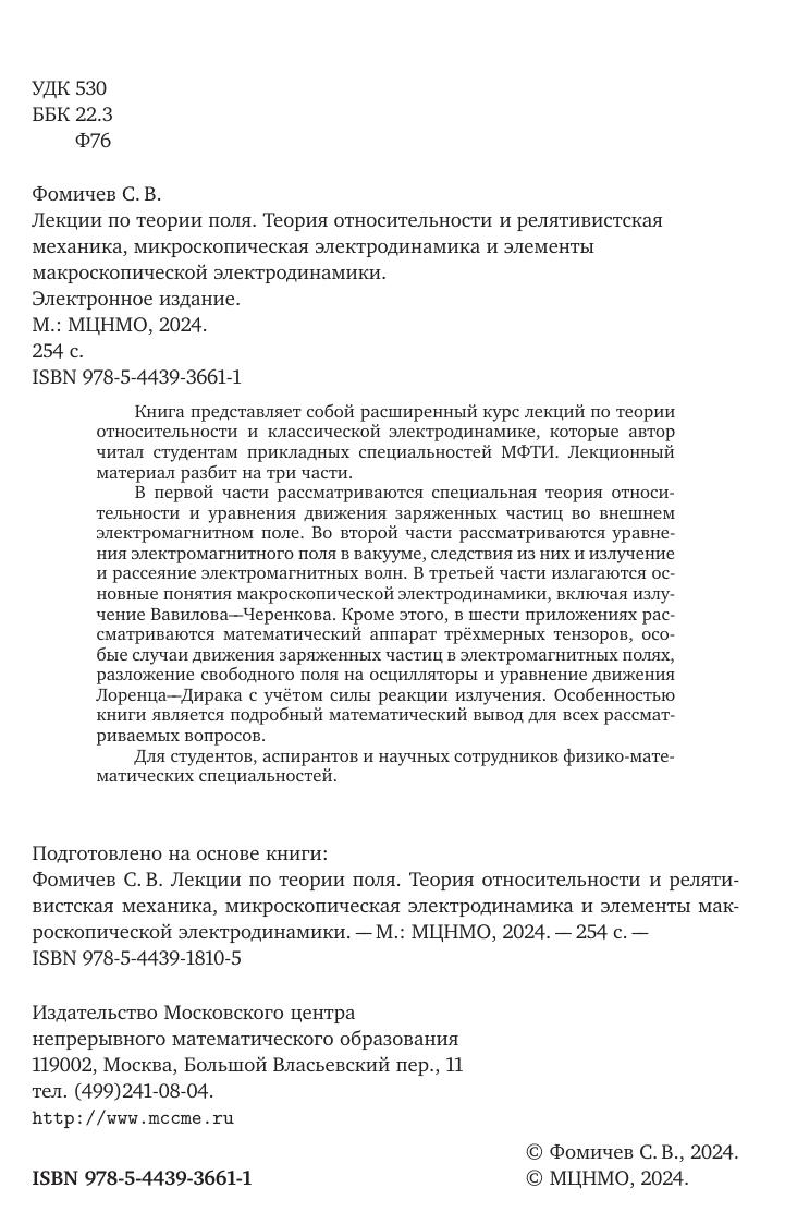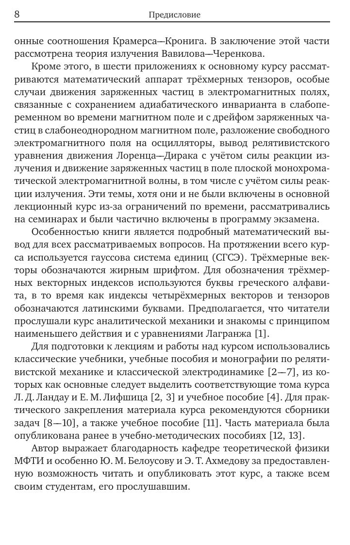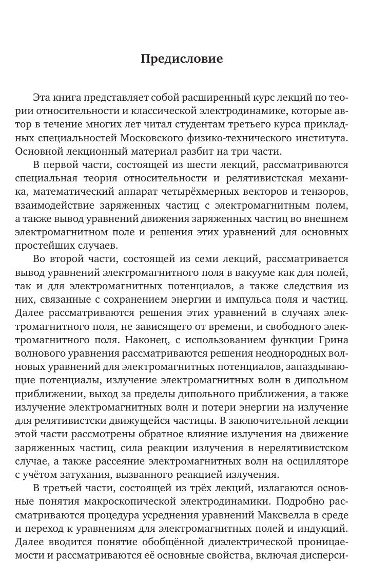 Книга представляет собой расширенный курс лекций по теории относительности и классической электродинамике, которые автор читал студентам прикладных специальностей МФТИ. Лекционный материал разбит на три части. В первой части рассматриваются специальная теория относительности и уравнения движения заряженных частиц во внешнем электромагнитном поле. Во второй части рассматриваются уравнения электромагнитного поля в вакууме, следствия из них и излучение и рассеяние электромагнитных волн. В третьей части излагаются основные понятия макроскопической электродинамики, включая излучение Вавилова––Черенкова. Кроме этого, в шести приложениях рассматриваются математический аппарат трёхмерных тензоров, особые случаи движения заряженных частиц в электромагнитных полях, разложение свободного поля на осцилляторы и уравнение движения Лоренца––Дирака с учётом силы реакции излучения. Особенностью книги является подробный математический вывод для всех рассматриваемых вопросов. Для студентов, аспирантов и научных сотрудников физико-математических специальностей.