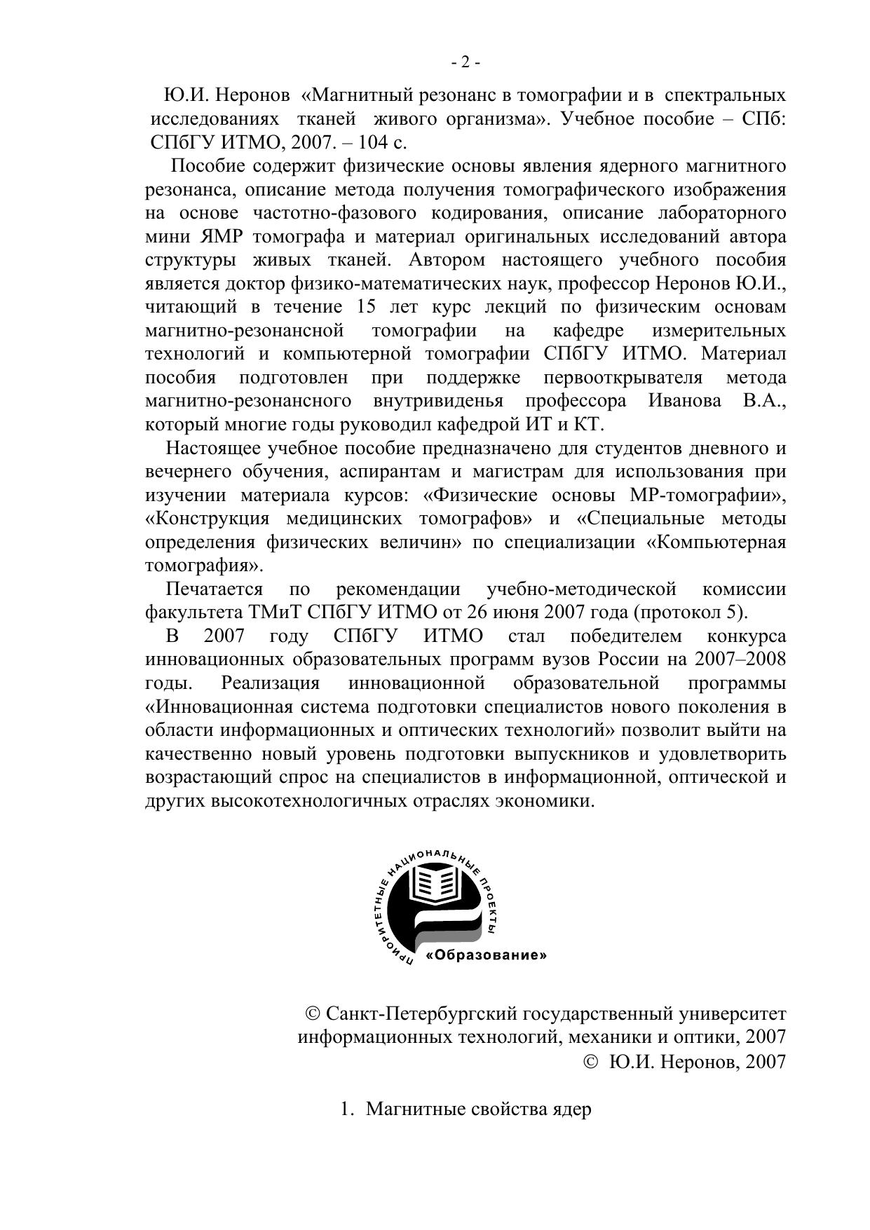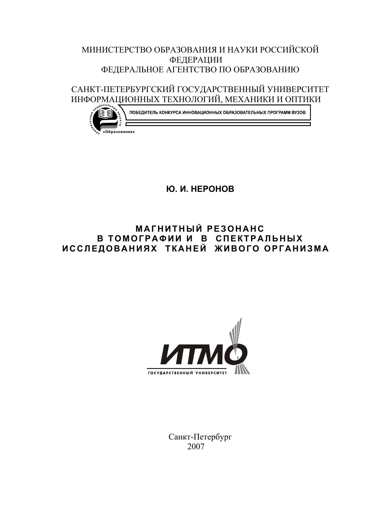 Пособие содержит физические основы явления ядерного магнитного резонанса, описание метода получения томографического изображения на основе частотно-фазового кодирования, описание лабораторного мини ЯМР томографа и материал оригинальных исследований автора структуры живых тканей. Автором настоящего учебного пособия является доктор физико-математических наук, профессор Неронов Ю.И., читающий в течение 15 лет курс лекций по физическим основам магнитно-резонансной томографии на кафедре измерительных технологий и компьютерной томографии СПбГУ ИТМО. Материал пособия подготовлен при поддержке первооткрывателя метода магнитно-резонансного внутривиденья профессора Иванова В.А., который многие годы руководил кафедрой ИТ и КТ. Настоящее учебное пособие предназначено для студентов дневного и вечернего обучения, аспирантам и магистрам для использования при изучении материала курсов: «Физические основы МР-томографии», «Конструкция медицинских томографов» и «Специальные методы определения физических величин» по специализации «Компьютерная томография».