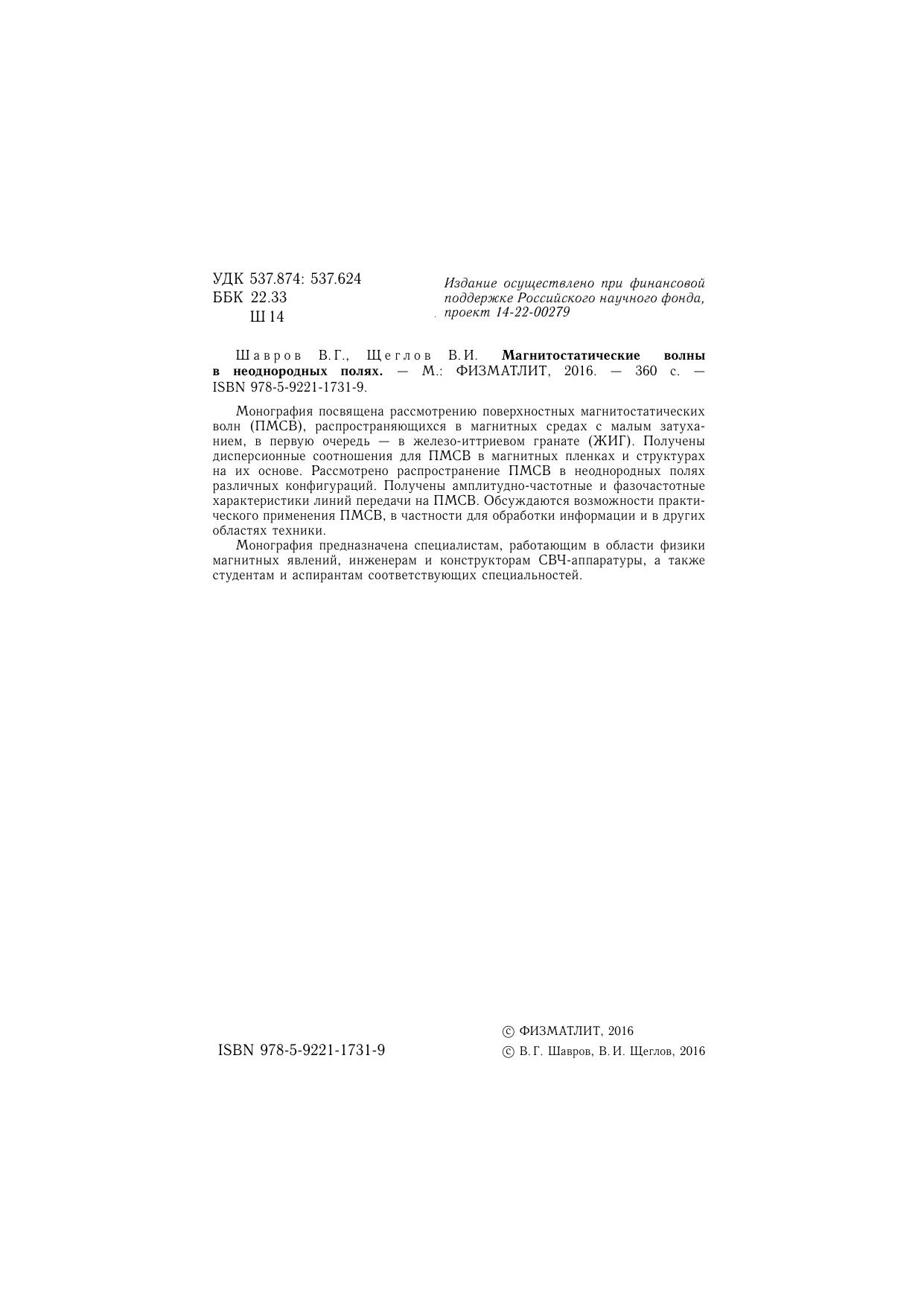 Монография посвящена рассмотрению поверхностных магнитостатических волн (ПМСВ), распространяющихся в магнитных средах с малым затуханием, в первую очередь — в железо-иттриевом гранате (ЖИГ). Получены дисперсионные соотношения для ПМСВ в магнитных пленках и структурах на их основе. Рассмотрено распространение ПМСВ в неоднородных полях различных конфигураций. Получены амплитудно-частотные и фазочастотные характеристики линий передачи на ПМСВ. Обсуждаются возможности практического применения ПМСВ, в частности для обработки информации и в других областях техники. Монография предназначена специалистам, работающим в области физики магнитных явлений, инженерам и конструкторам СВЧ-аппаратуры, а также студентам и аспирантам соответствующих специальностей.