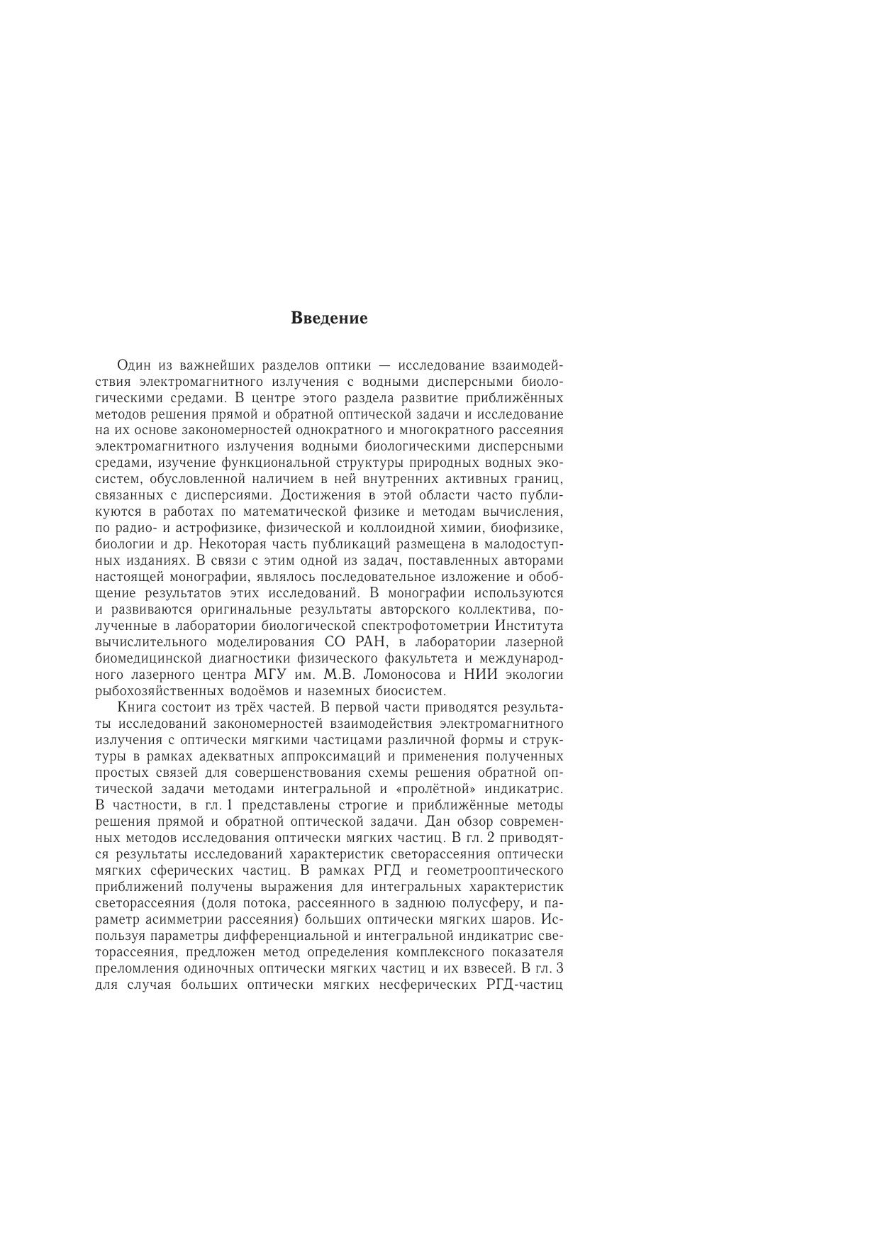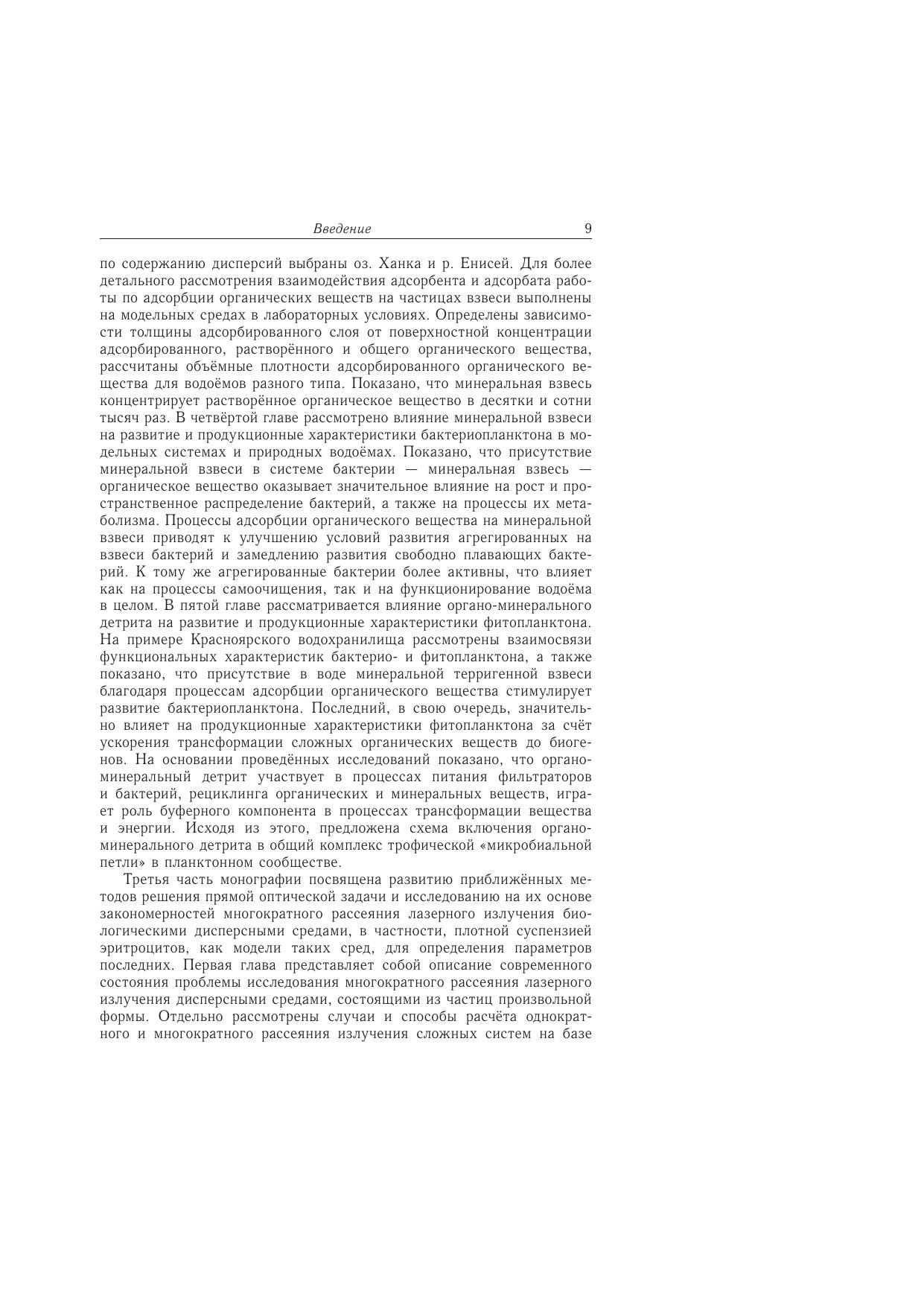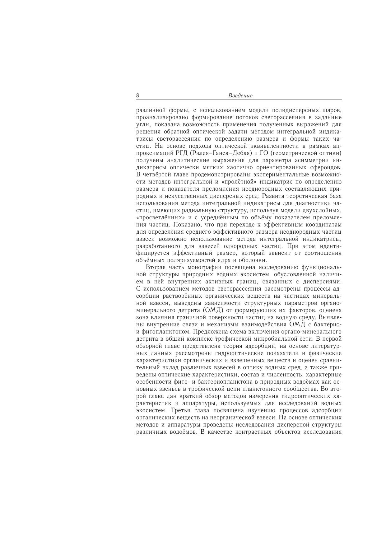 Книга представляет обобщение исследований закономерностей взаимодействия электромагнитного излучения с оптически мягкими частицами различной формы и структуры с целью совершенствования схемы решения обратной оптической задачи методами интегральной и «пролетной» индикатрис однократного светорассеяния на основе полученных аналитических связей. Развиты приближенные методы решения прямой оптической задачи и исследованы на их основе закономерности многократного рассеяния лазерного излучения водными биологическими дисперсными средами, в частности, плотной суспензией эритроцитов как моделью таких сред, для определения параметров последних. Приведены результаты исследования функциональной структуры природных водных экосистем, полученные на основе разработанных схем дешифрирования оптической информации. Рассмотрены процессы адсорбции растворенных органических веществ на частицах минеральной взвеси и формирования органо-минерального детрита (ОМД), выведены зависимости структурных параметров ОМД от формирующих их факторов, оценена зона влияния граничной поверхности частиц на водную среду. Выявлены внутренние связи и механизмы взаимодействия ОМД с бактерио- и фитопланктоном. Предложена схема включения ОМД в общий комплекс трофической микробиальной петли.