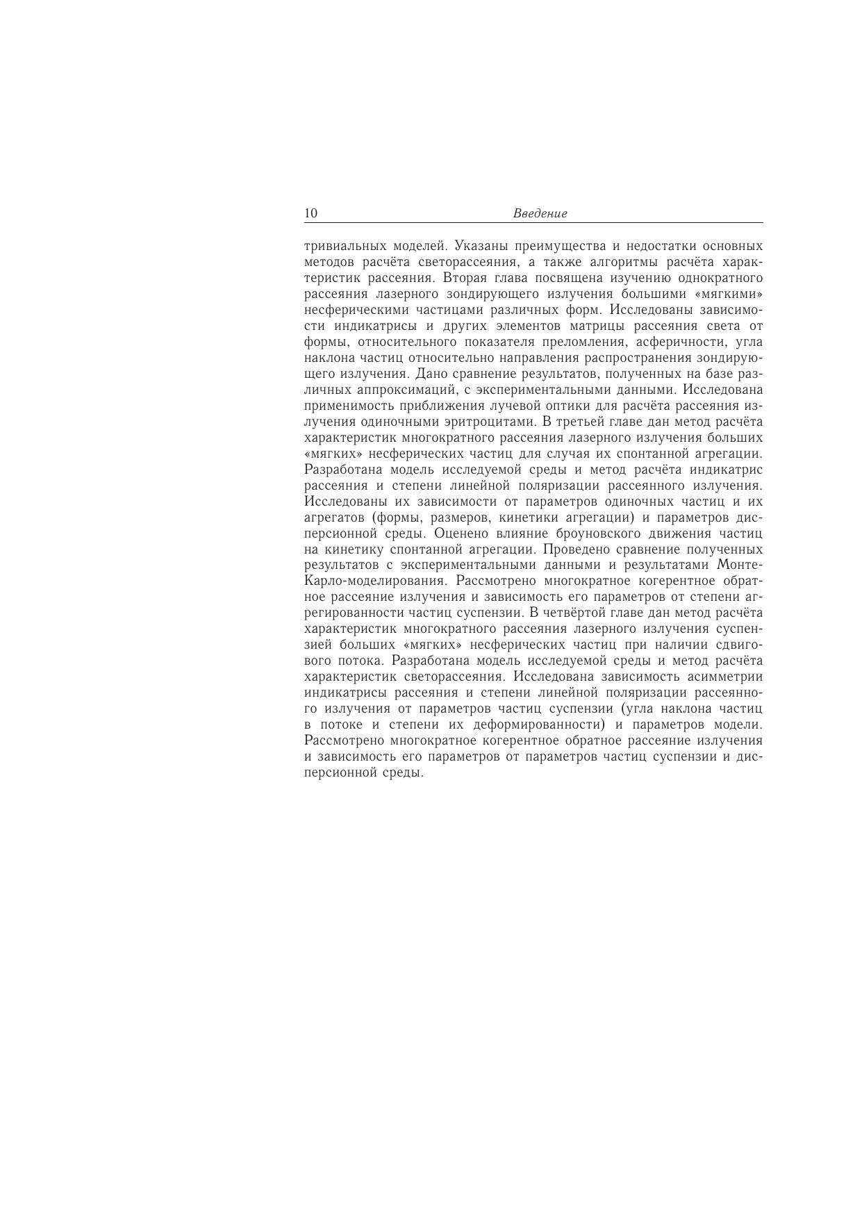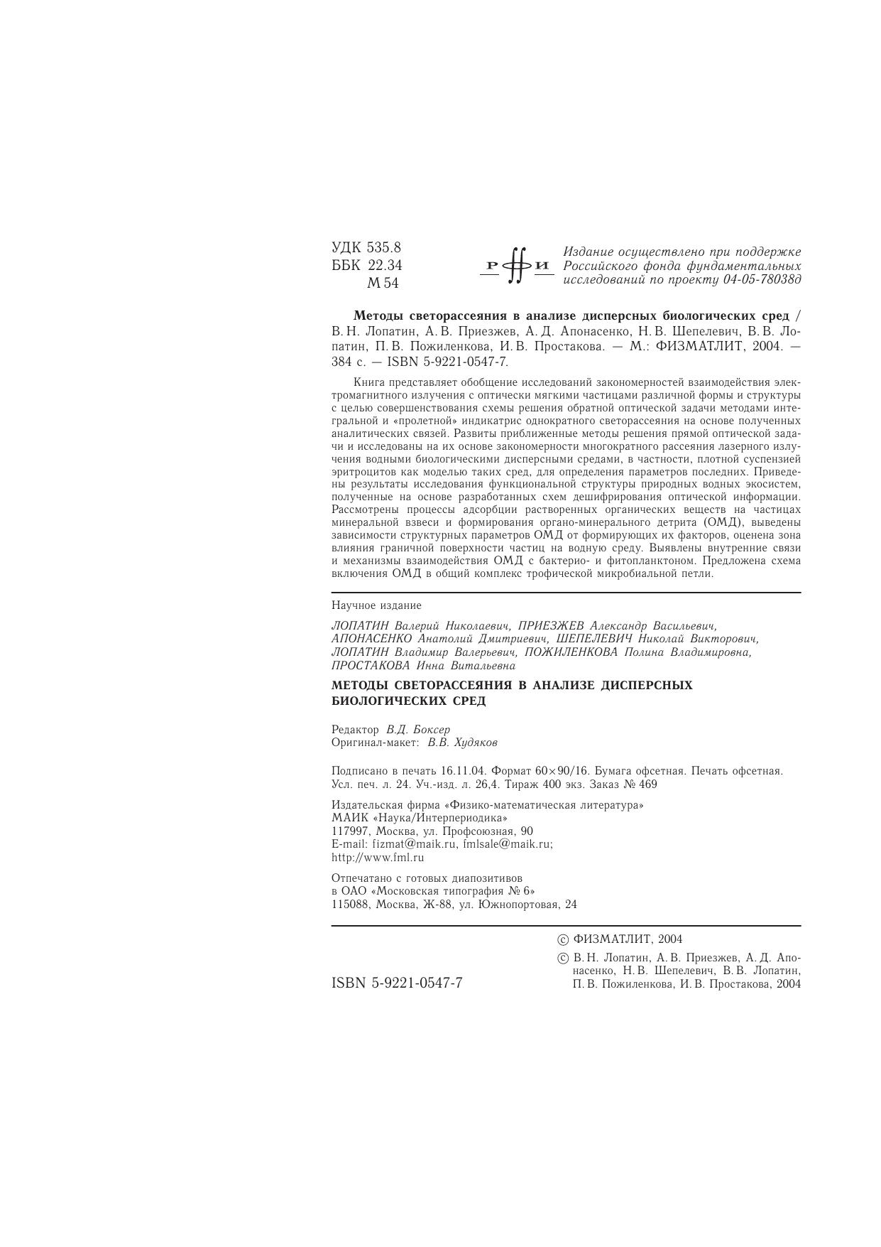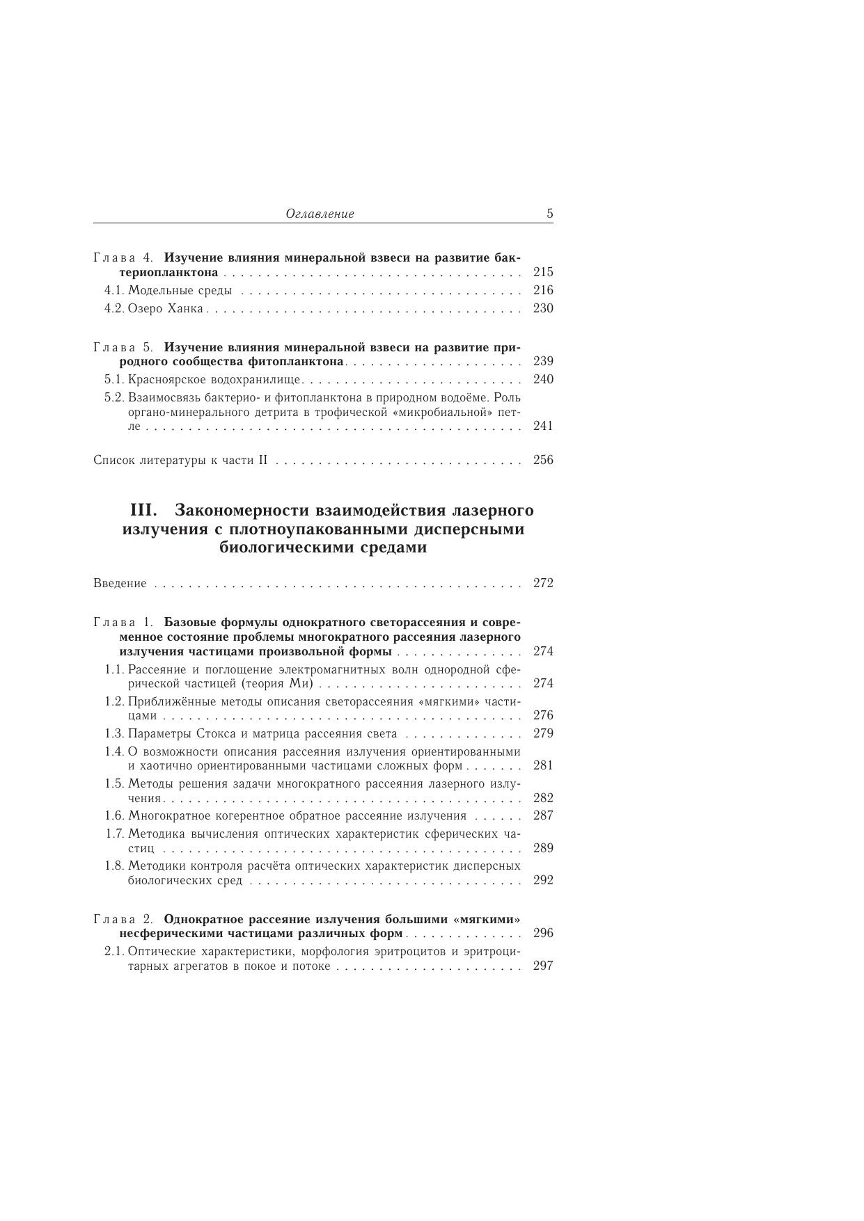 Книга представляет обобщение исследований закономерностей взаимодействия электромагнитного излучения с оптически мягкими частицами различной формы и структуры с целью совершенствования схемы решения обратной оптической задачи методами интегральной и «пролетной» индикатрис однократного светорассеяния на основе полученных аналитических связей. Развиты приближенные методы решения прямой оптической задачи и исследованы на их основе закономерности многократного рассеяния лазерного излучения водными биологическими дисперсными средами, в частности, плотной суспензией эритроцитов как моделью таких сред, для определения параметров последних. Приведены результаты исследования функциональной структуры природных водных экосистем, полученные на основе разработанных схем дешифрирования оптической информации. Рассмотрены процессы адсорбции растворенных органических веществ на частицах минеральной взвеси и формирования органо-минерального детрита (ОМД), выведены зависимости структурных параметров ОМД от формирующих их факторов, оценена зона влияния граничной поверхности частиц на водную среду. Выявлены внутренние связи и механизмы взаимодействия ОМД с бактерио- и фитопланктоном. Предложена схема включения ОМД в общий комплекс трофической микробиальной петли.