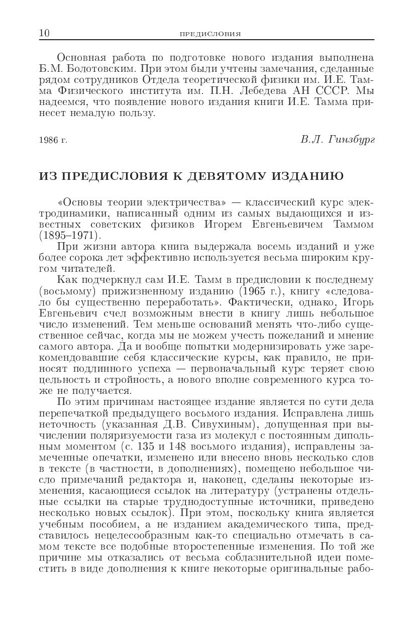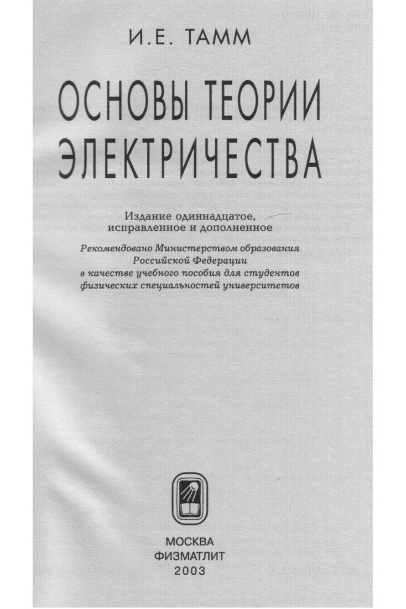 Дано систематическое изложение основных положений теории электричества. Главное внимание уделено физическому содержанию теории. Подготовлено 11-е издание, как предыдущее, без переработки, с тем чтобы дать возможность современному читателю ознакомится именно с оригинальной, фундаментальной в мировой литературе работой академики И.Е.Тамма. Добавлена таблица физических констант, изменено несколько примечаний, обновлены ссылки на литературу и, наконец, исправлены замеченные опечатки.Для студентов физических специальностей вузов, а также научных и инженерно-технических работников.