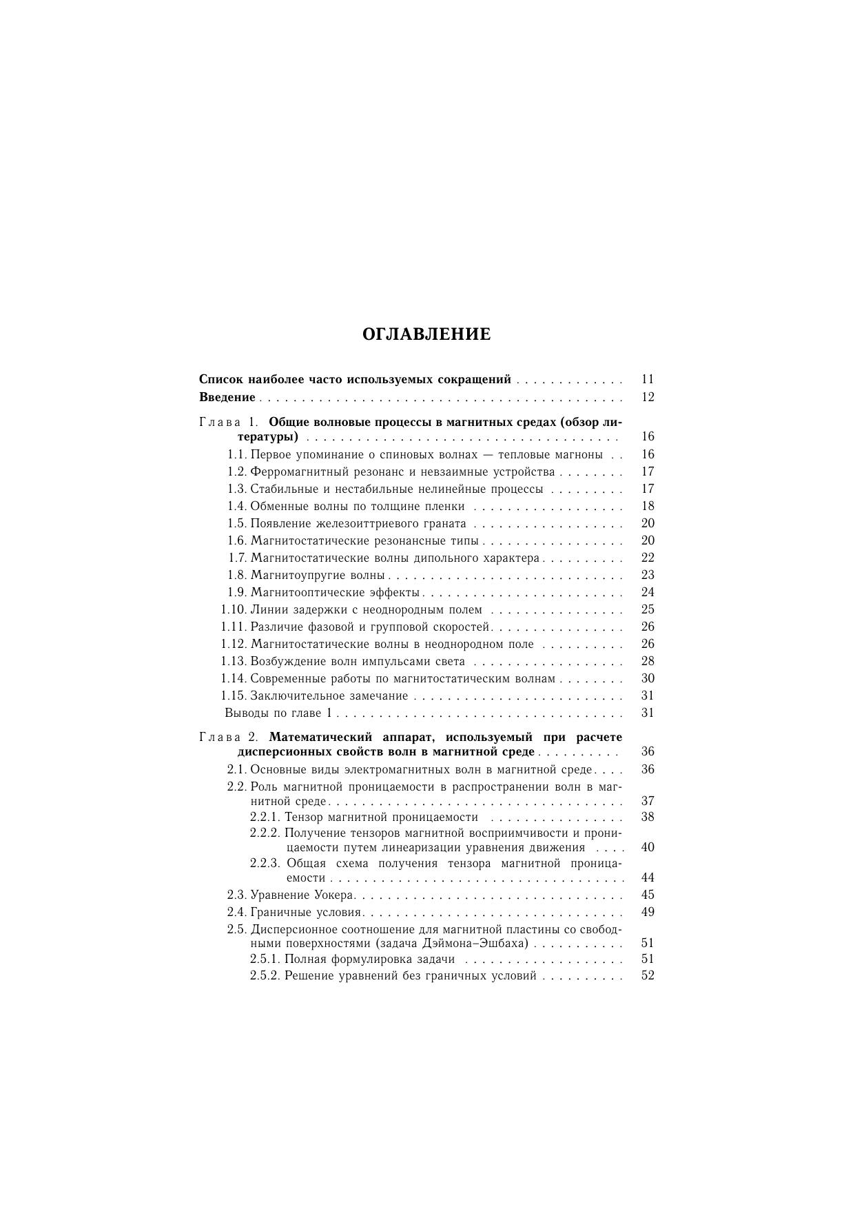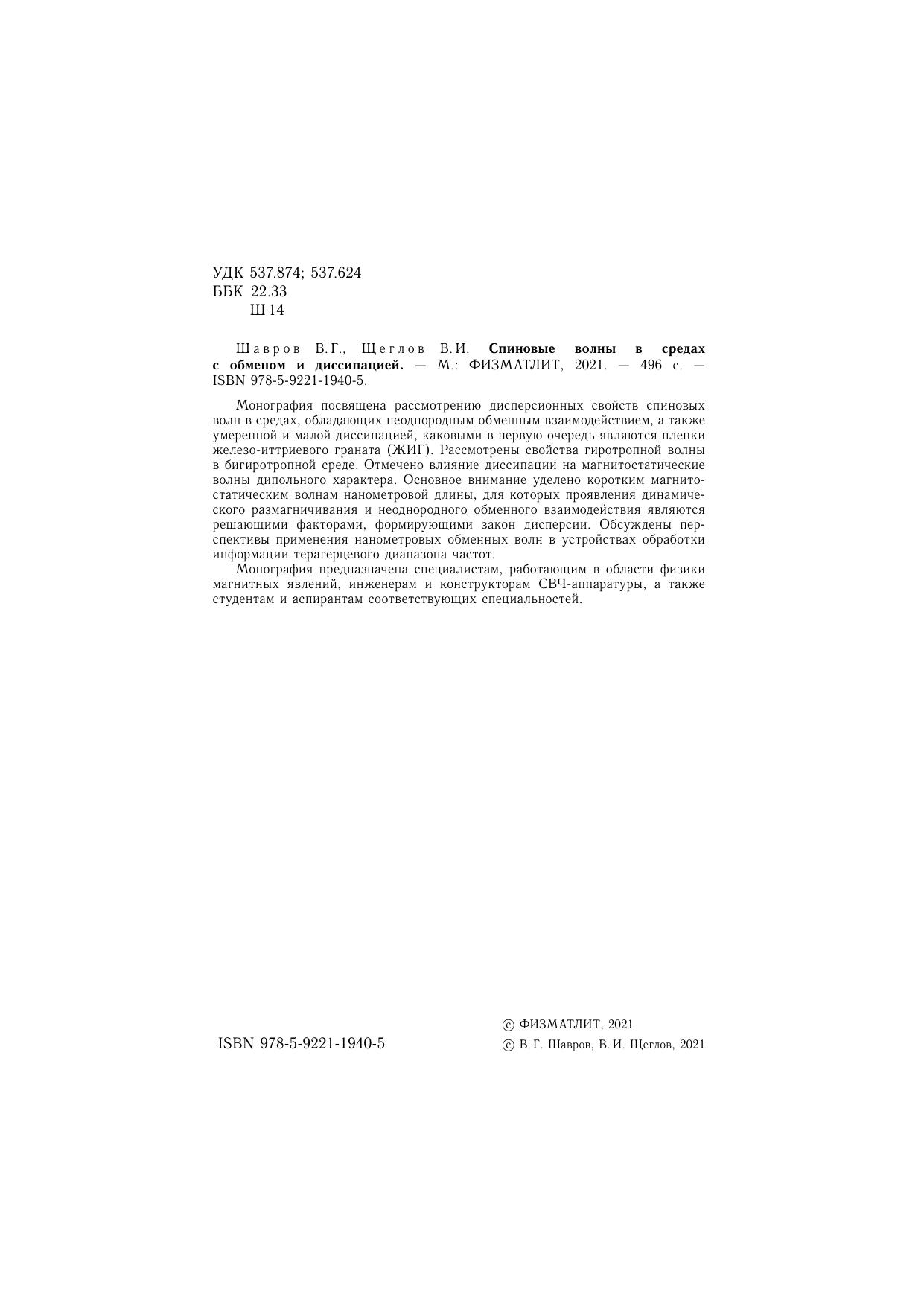 Монография посвящена рассмотрению дисперсионных свойств спиновых волн в средах, обладающих неоднородным обменным взаимодействием, а также умеренной и малой диссипацией, каковыми в первую очередь являют ся пленки железо-иттриевого граната (ЖИГ). Рассмотрены свойства гиротропной волны в бигиротропной среде. Отмечено влияние диссипации на магнитостатические волны дипольного характера. Основное внимание уделено коротким магнитостатическим волнам нанометровой длины, для которых проявления динамического размагничивания и неоднородного обменного взаимодействия являются решающими факторами, формирующими закон дисперсии. Обсуждены перспективы применения нанометровых обменных волн в устройствах обработки информации терагерцевого диапазона частот. Монография предназначена специалистам, работающим в области физики магнитных явлений, инженерам и конструкторам СВЧ-аппаратуры, а также студентам и аспирантам соответствующих специальностей.