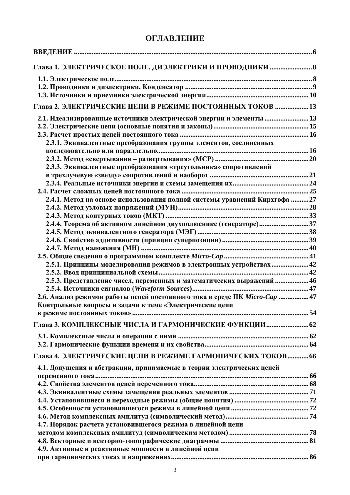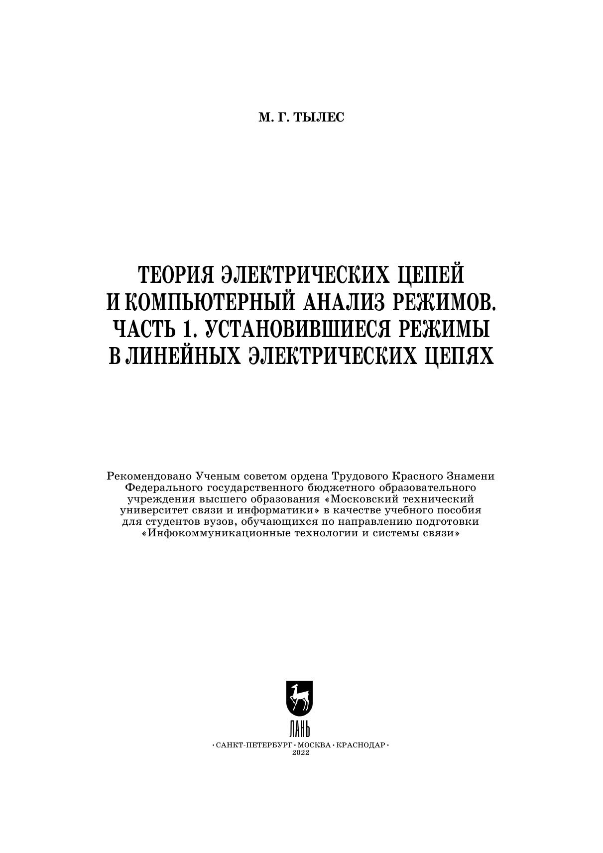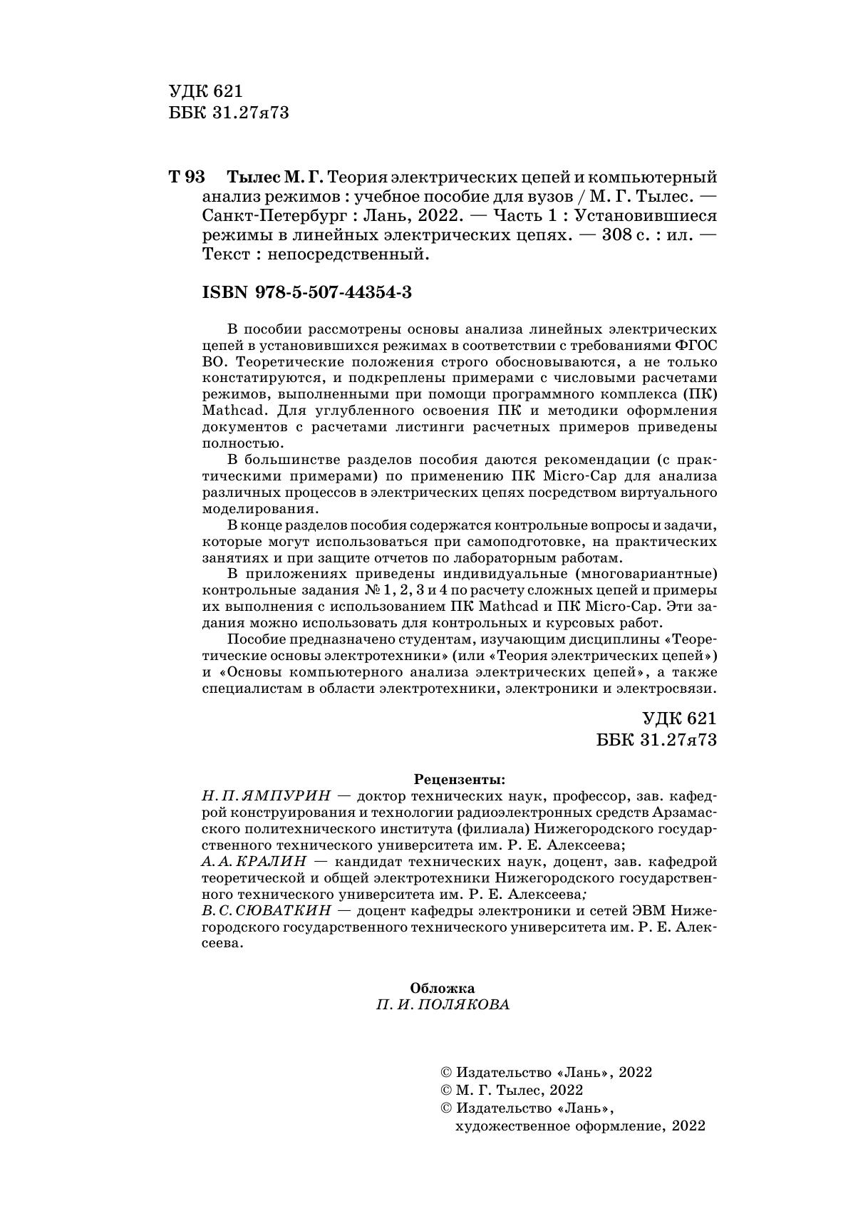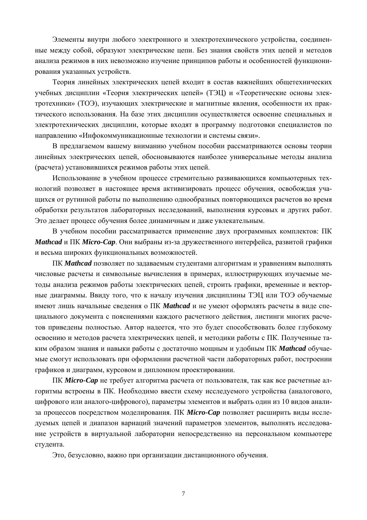 В пособии рассмотрены основы анализа линейных электрических цепей в установившихся режимах в соответствии требованиям ФГОС ВО. Теоретические положения строго обосновываются, а не только констатируются, и подкреплены примерами с числовыми расчетами режимов, выполненными при помощи программного комплекса (ПК) Mathcad. Для углубленного освоения ПК и методики оформления документов с расчетами листинги расчетных примеров приведены полностью. В большинстве разделов пособия даются рекомендации (с практическими примерами) по применению ПК Micro-Cap для анализа различных процессов в электрических цепях посредством виртуального моделирования. В конце разделов пособия содержатся контрольные вопросы и задачи, которые могут использоваться при самоподготовке, на практических занятиях и при защите отчетов по лабораторным работам. В приложениях приведены индивидуальные (многовариантные) контрольные задания № 1, 2, 3 и 4 по расчету сложных цепей и примеры их выполнения с использованием ПК Mathcad и ПК Micro-Cap. Эти задания можно использовать для контрольных и курсовых работ. Пособие предназначено студентам, изучающим дисциплины «Теоретические основы электротехники» (или «Теория электрических цепей») и «Основы компьютерного анализа электрических цепей», а также специалистам в области электротехники, электроники и электросвязи.