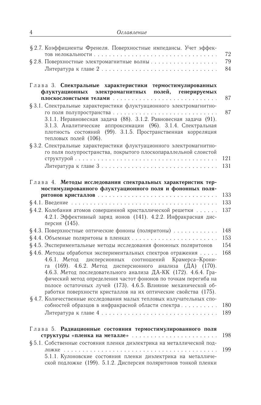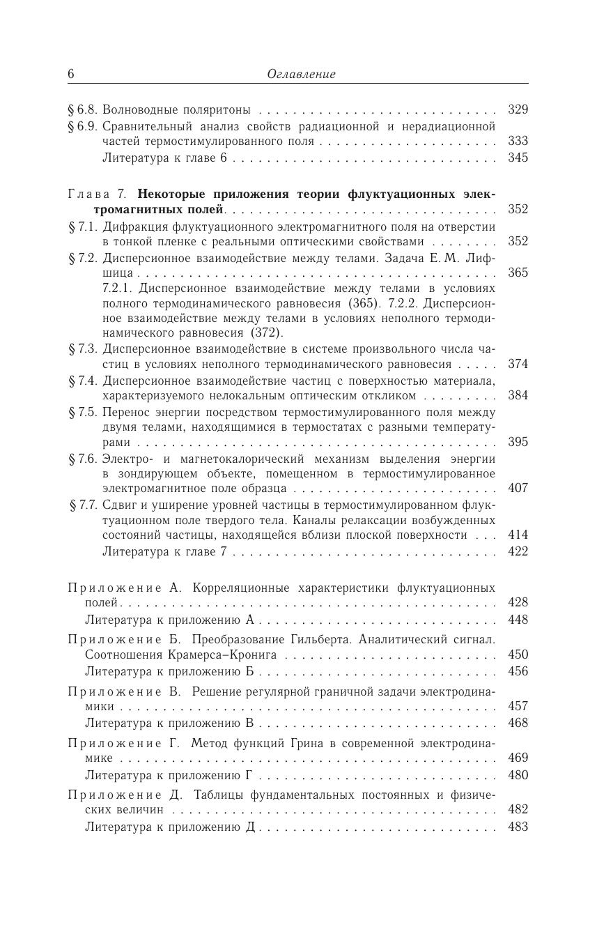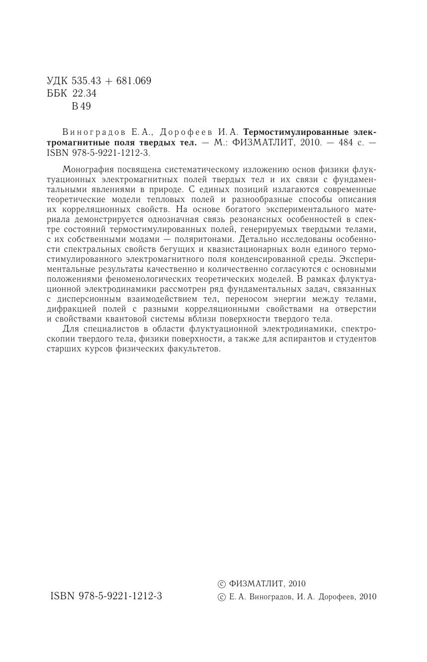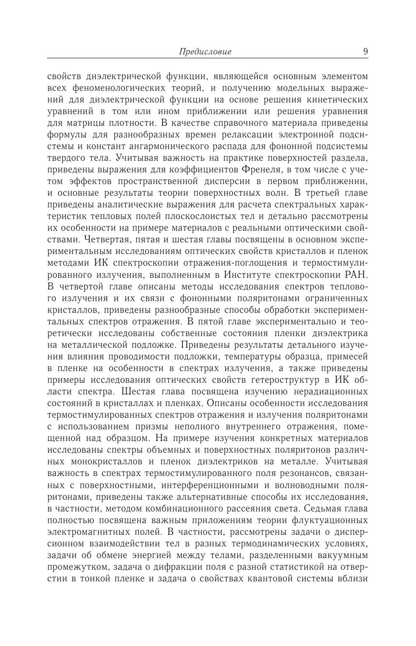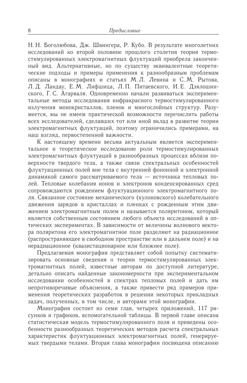 Монография посвящена систематическому изложению основ физики флуктуационных электромагнитных полей твердых тел и их связи с фундаментальными явлениями в природе. С единых позиций излагаются современные теоретические модели тепловых полей и разнообразные способы описания их корреляционных свойств. На основе богатого экспериментального материала демонстрируется однозначная связь резонансных особенностей в спектре состояний термостимулированных полей, генерируемых твердыми телами, с их собственными модами — поляритонами. Детально исследованы особенности спектральных свойств бегущих и квазистационарных волн единого термостимулированного электромагнитного поля конденсированной среды. Экспериментальные результаты качественно и количественно согласуются с основными положениями феноменологических теоретических моделей. В рамках флуктуационной электродинамики рассмотрен ряд фундаментальных задач, связанных с дисперсионным взаимодействием тел, переносом энергии между телами, дифракцией полей с разными корреляционными свойствами на отверстии и свойствами квантовой системы вблизи поверхности твердого тела.Для специалистов в области флуктуационной электродинамики, спектроскопии твердого тела, физики поверхности, а также для аспирантов и студентов старших курсов физических факультетов.