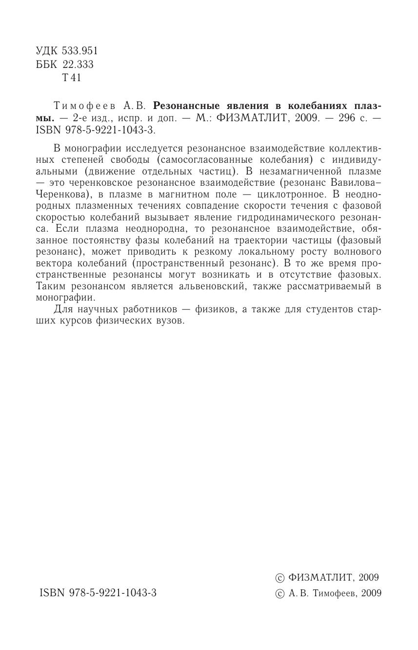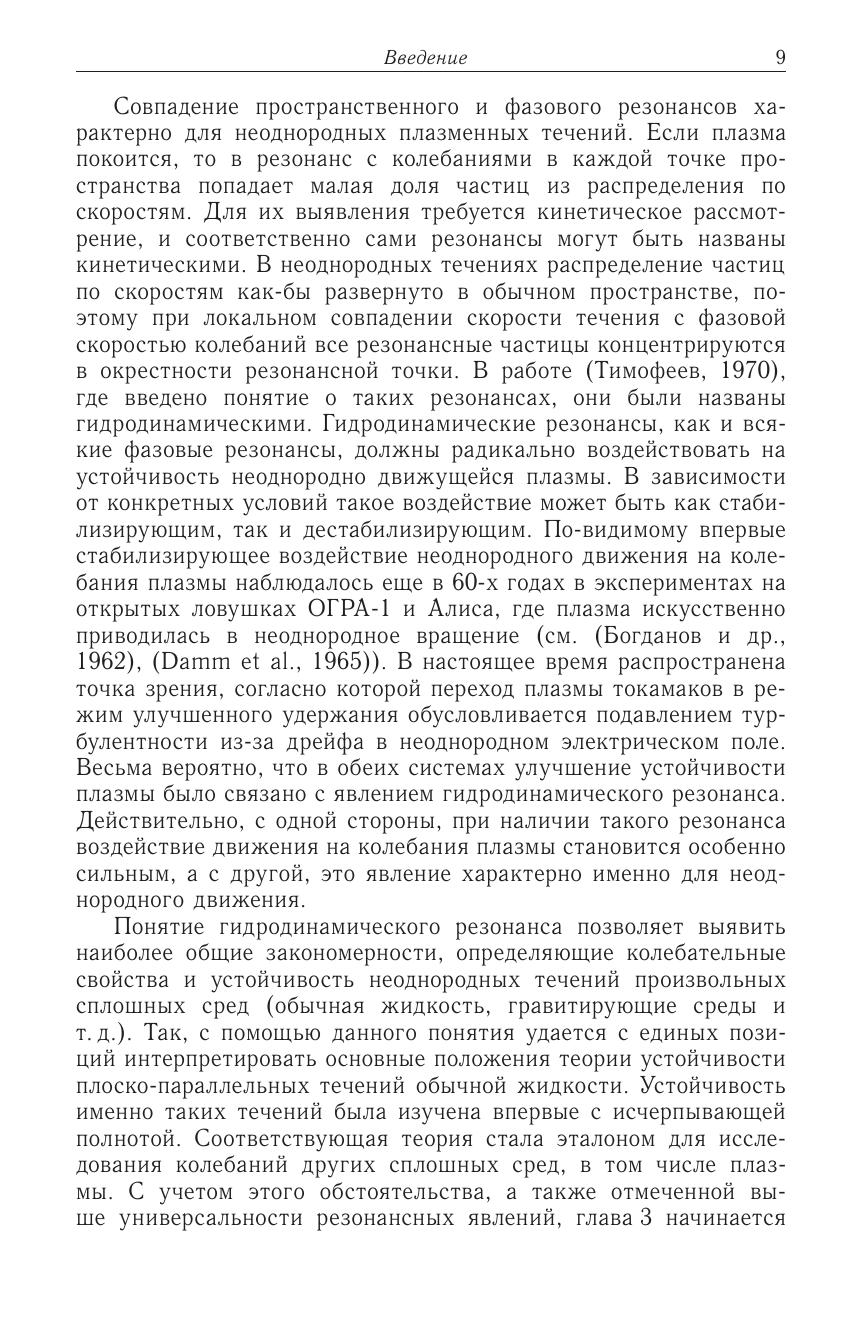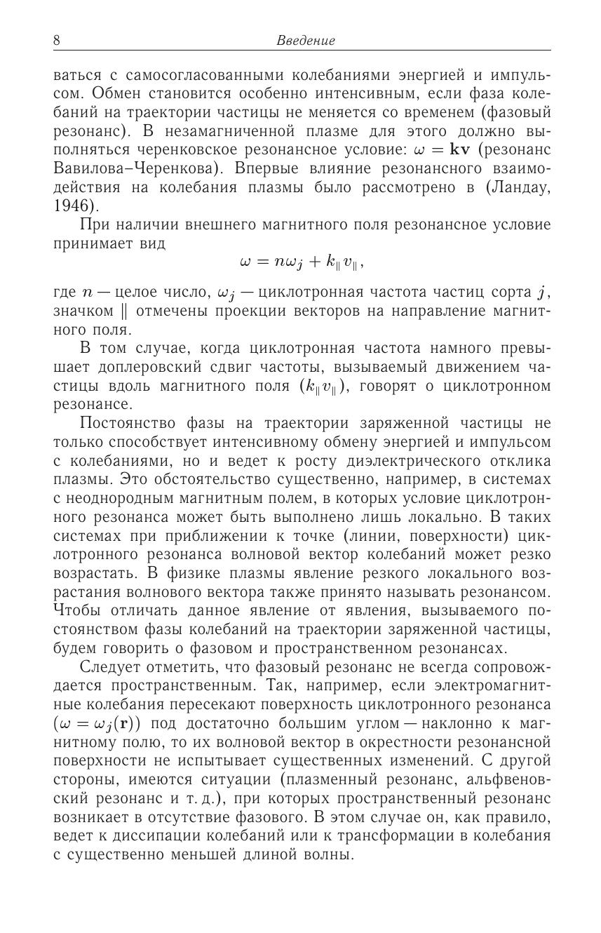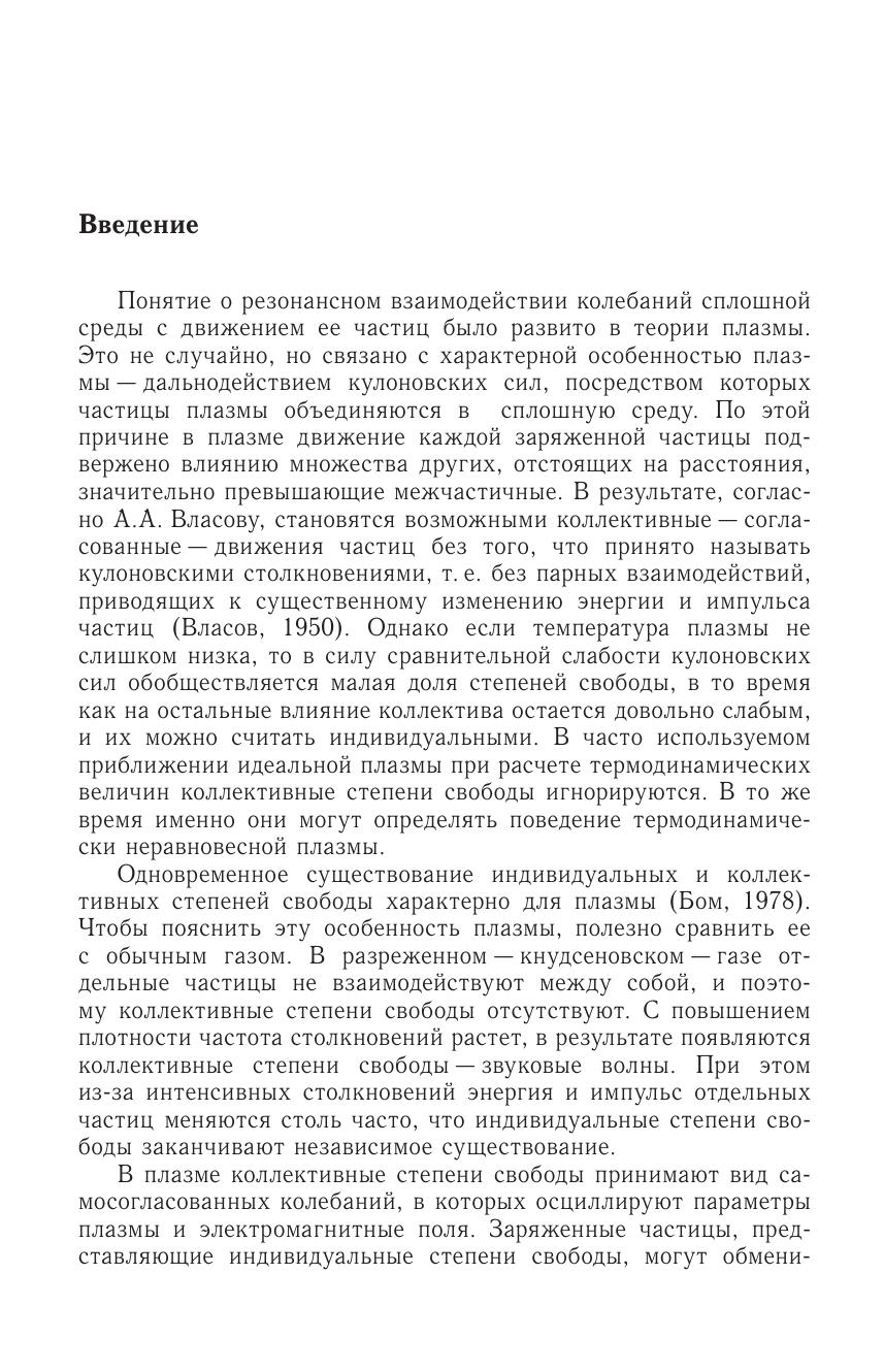 В монографии исследуется резонансное взаимодействие коллективных степеней свободы (самосогласованные колебания) с индивидуальными (движение отдельных частиц). В незамагниченной плазме — это черенковское резонансное взаимодействие (резонанс Вавилова–Черенкова), в плазме в магнитном поле — циклотронное. В неоднородных плазменных течениях совпадение скорости течения с фазовой скоростью колебаний вызывает явление гидродинамического резонанса. Если плазма неоднородна, то резонансное взаимодействие, обязанное постоянству фазы колебаний на траектории частицы (фазовый резонанс), может приводить к резкому локальному росту волнового вектора колебаний (пространственный резонанс). В то же время пространственные резонансы могут возникать и в отсутствие фазовых. Таким резонансом является альвеновский, также рассматриваемый в монографии.Для научных работников — физиков, а также для студентов старших курсов физических вузов.