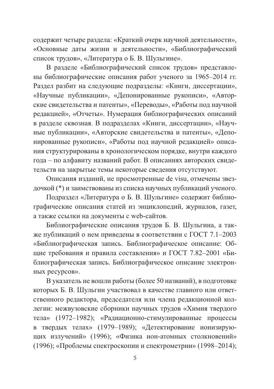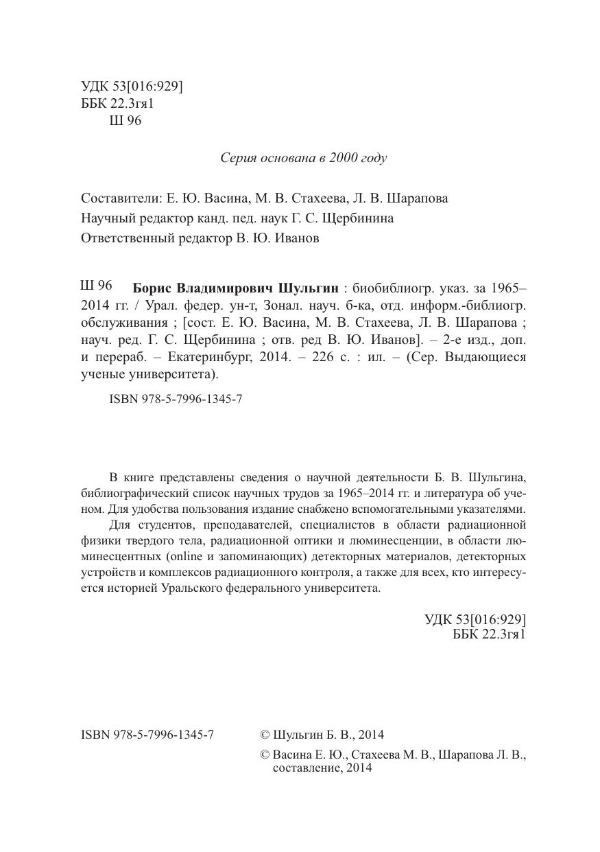 В книге представлены сведения о научной деятельности Б. В. Шульгина, библиографический список научных трудов за 1965-2014 гг. и литература об ученом. Для удобства пользования издание снабжено вспомогательными указателями. Для студентов, преподавателей, специалистов в области радиационной физики твердого тела, радиационной оптики и люминесценции, в области люминесцентных (online и запоминающих) детекторных материалов, детекторных устройств и комплексов радиационного контроля, а также для всех, кто интересуется историей Уральского федерального университета.
