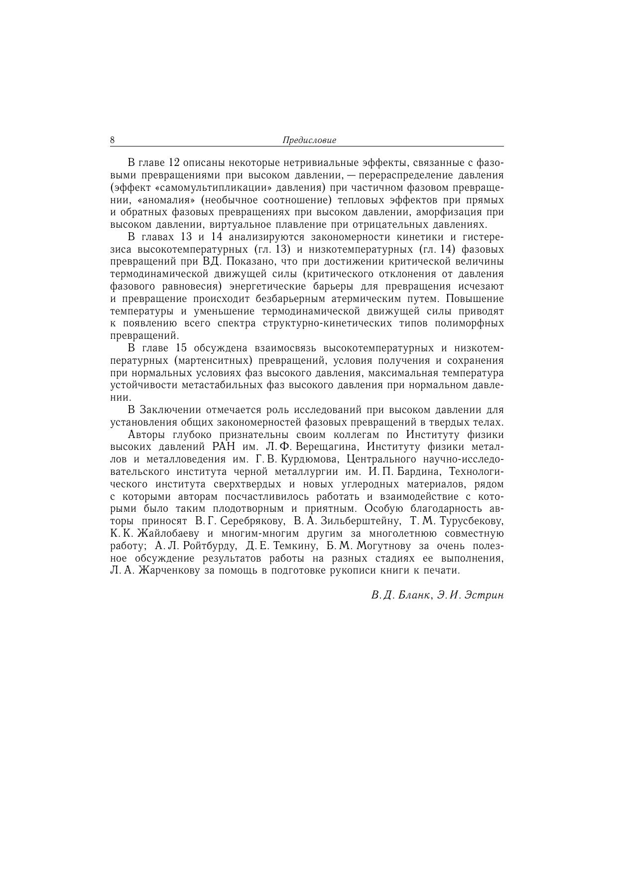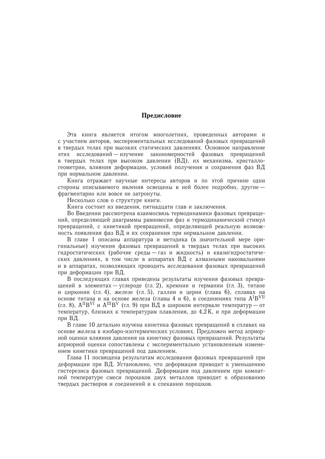 Книга посвящена проблеме фазовых превращений в твердых телах при высоком давлении (ВД). Рассмотрены следующие вопросы: фазовые равновесия при ВД в элементах (углероде, кремнии, германии, титане, цирконии, железе, галлии, церии), в соединениях типа AIBVII, AIIBVI, AIIIBV, в сплавах на основе железа влияние деформации на фазовые превращения при ВД кинетика и гистерезис высокотемпературных и низкотемпературных превращений при ВД условия получения и сохранения фаз ВД. Для специалистов в области физики твердого тела, физического материаловедения, перподавателей, аспирантов и студентов соответствующих специальностей.