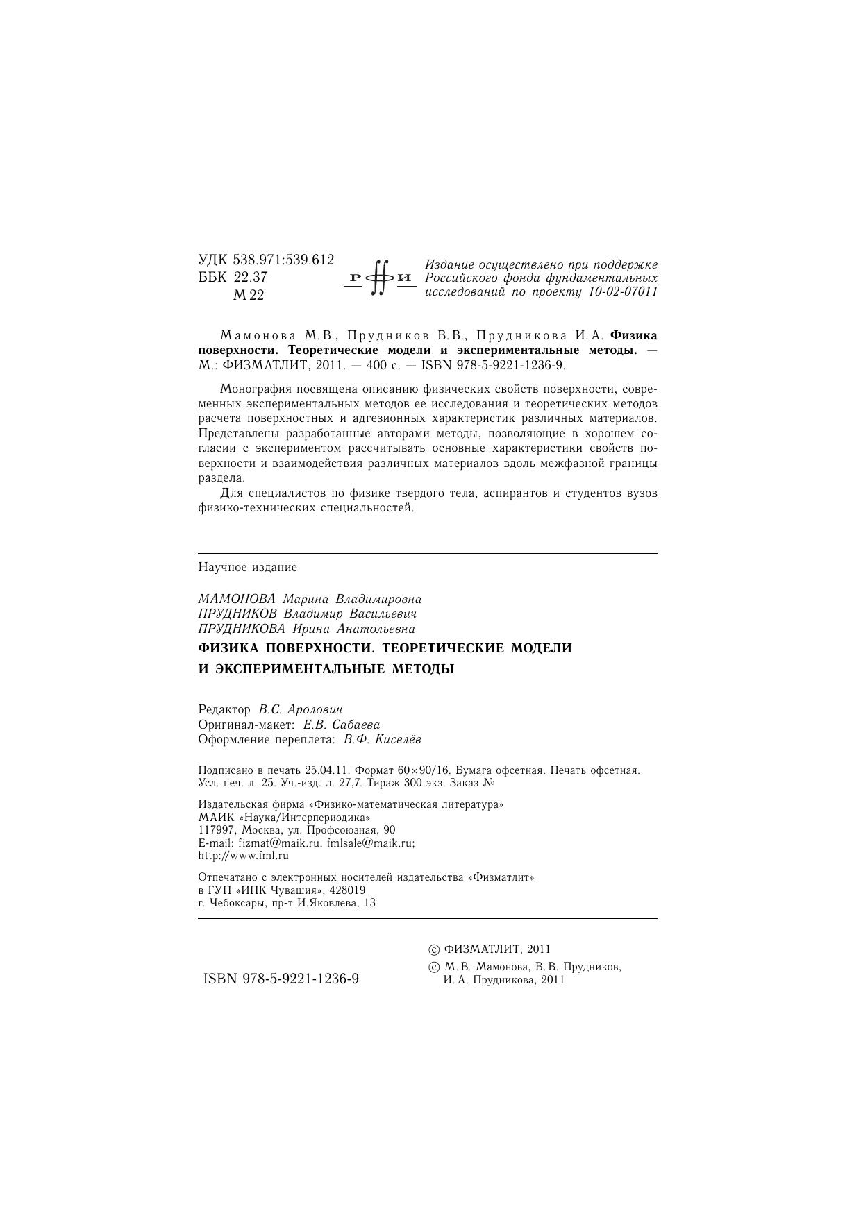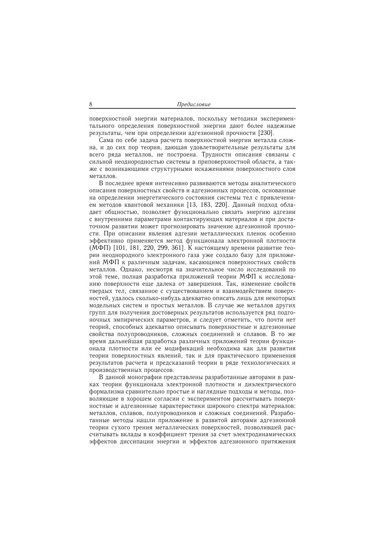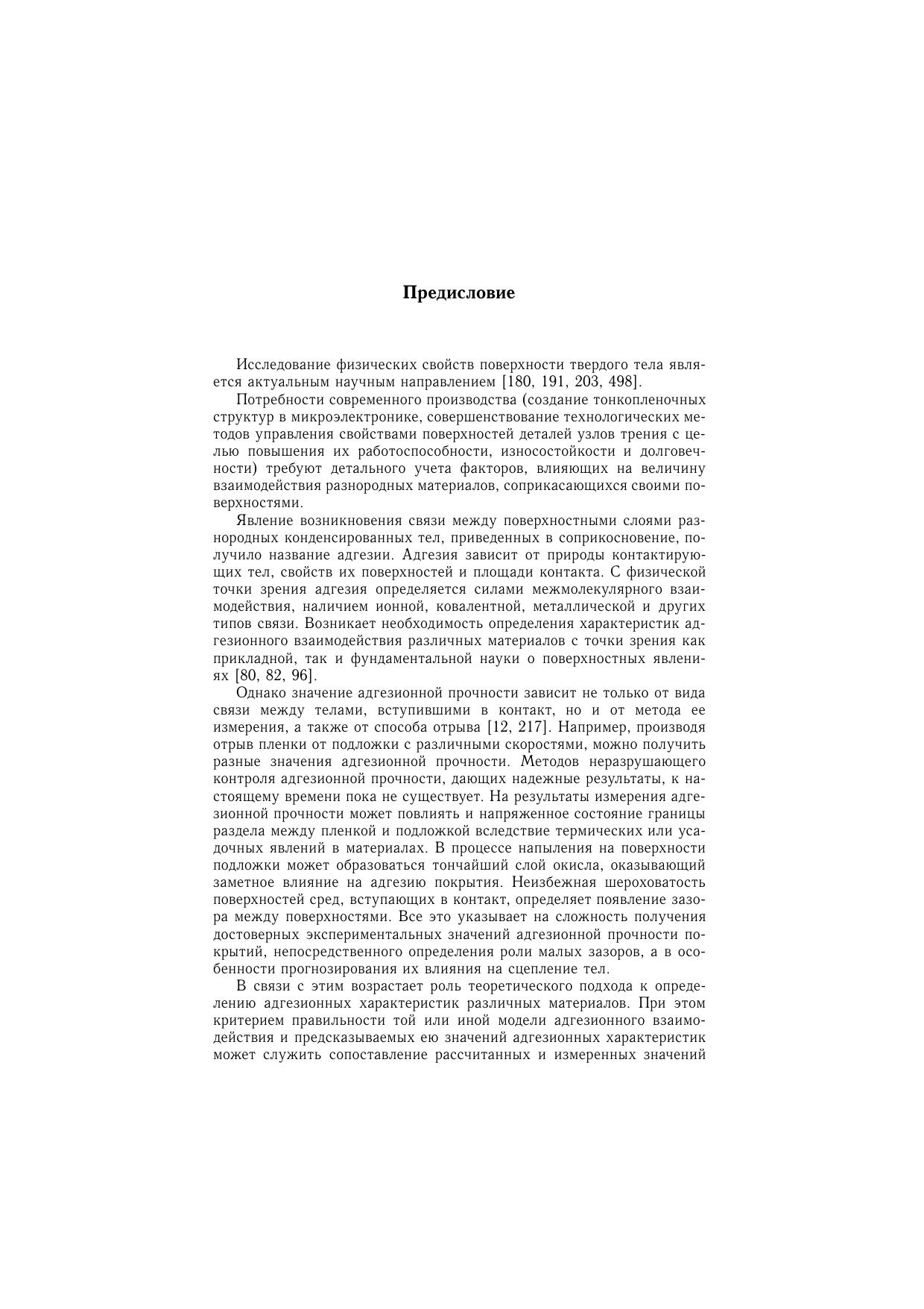 Монография посвящена описанию физических свойств поверхности, современных экспериментальных методов ее исследования и теоретических методов расчета поверхностных и адгезионных характеристик различных материалов. Представлены разработанные авторами методы, позволяющие в хорошем согласии с экспериментом рассчитывать основные характеристики свойств поверхности и взаимодействия различных материалов вдоль межфазной границы раздела. Для специалистов по физике твердого тела, аспирантов и студентов вузов физико-технических специальностей.