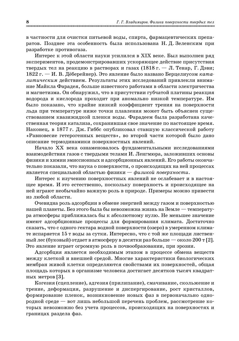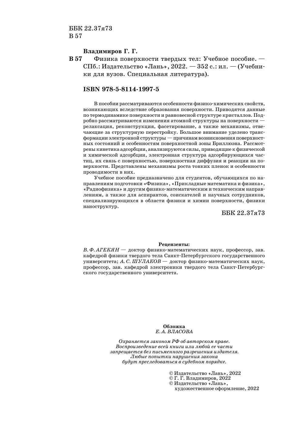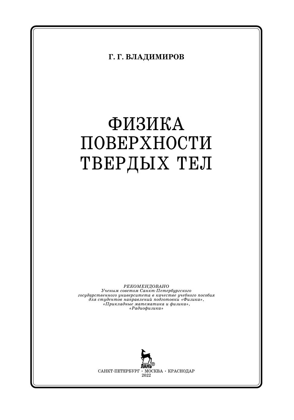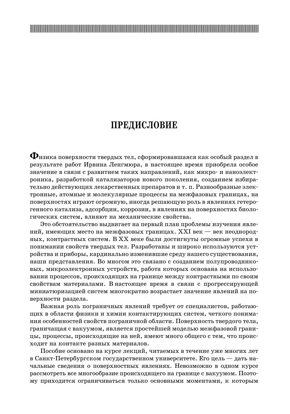 В пособии рассматриваются особенности физико-химических свойств, возникающих вследствие образования поверхности. Приводятся данные по термодинамике поверхности и равновесной структуре кристаллов. Подробно рассматриваются изменения атомной структуры на поверхности — релаксация, реконструкция, фасетирование, а также механизмы, отвечающие за структурную перестройку. Большое внимание уделено трансформации электронной структуры — причинам возникновения поверхностных состояний и особенностям поверхностной зоны Бриллюэна. Рассмотрены кинетика адсорбции, анализируются силы, приводящие к физической и химической адсорбции, электронная структура адсорбирующихся частиц, их связь с поверхностью, поверхностная диффузия и реакции на поверхности. Представлены механизмы роста тонких пленок и особенности проводимости в них. Учебное пособие предназначено для студентов, обучающихся по направлениям подготовки «Физика», «Прикладные математика и физика», «Радиофизика» и другим физико-математическим и техническим направлениям, а также для аспирантов, соискателей и научных сотрудников, специализирующихся в области физики и химии поверхности, физики наноструктур.
