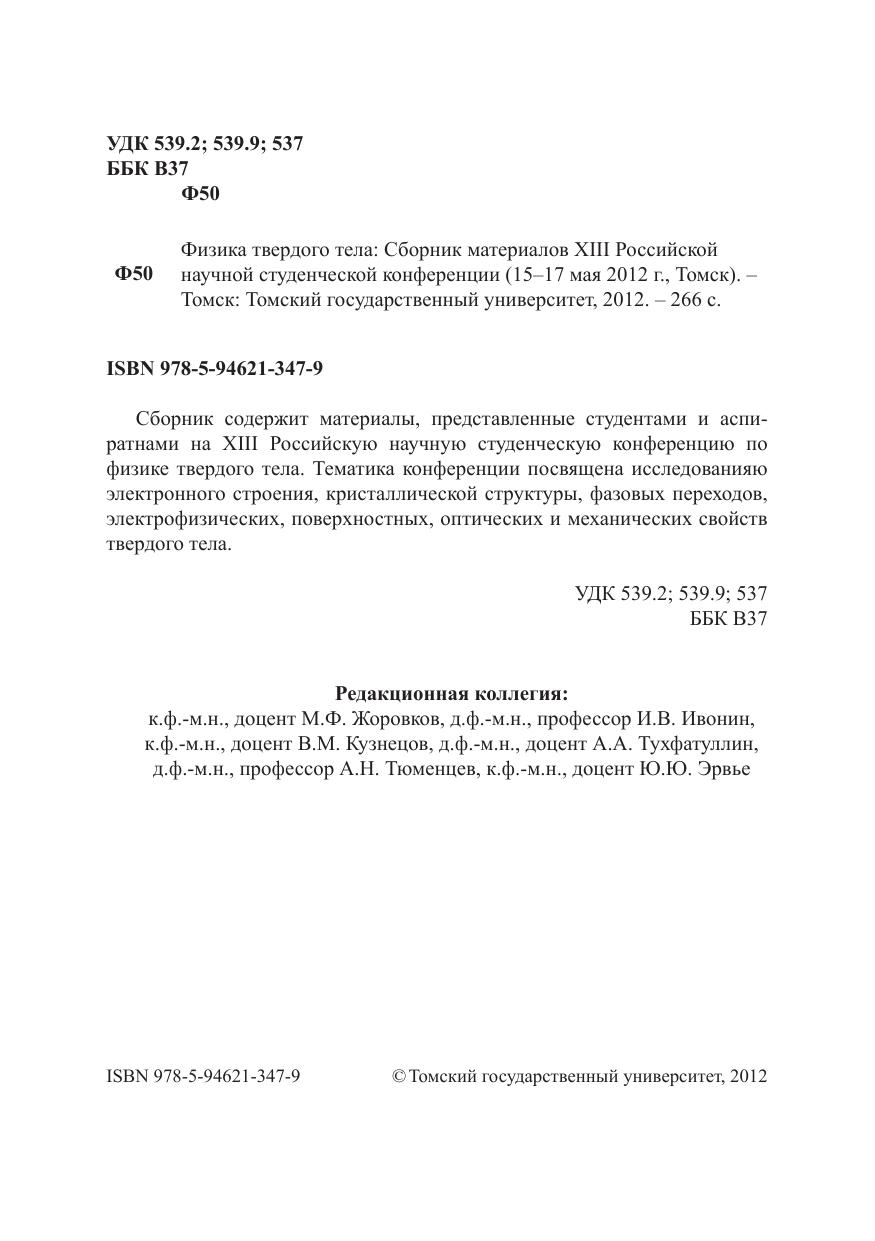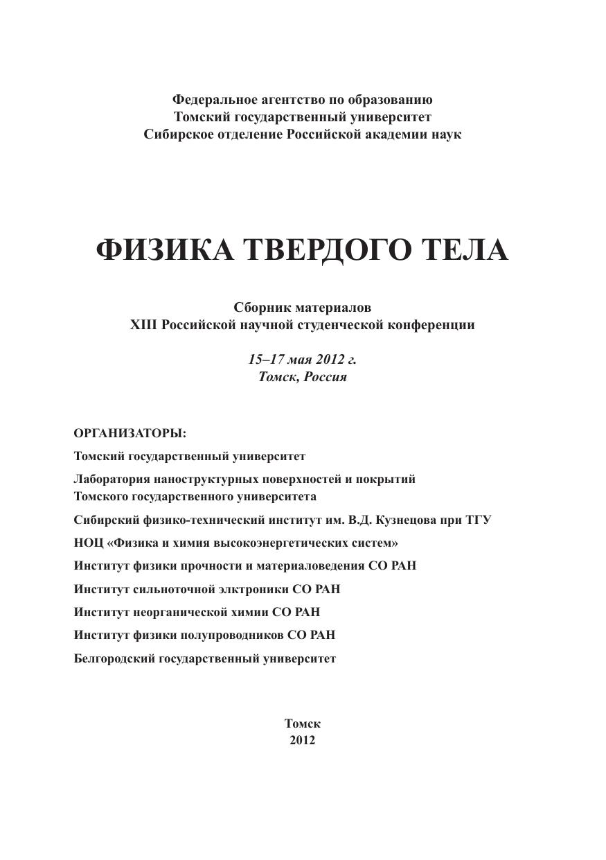Сборник содержит материалы, представленные студентами и аспиратнами на XIII Российскую научную студенческую конференцию по физике твердого тела. Тематика конференции посвящена исследованияю электронного строения, кристаллической структуры, фазовых переходов, электрофизических, поверхностных, оптических и механических свойств твердого тела.