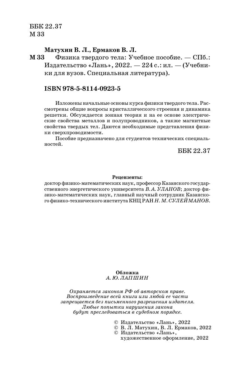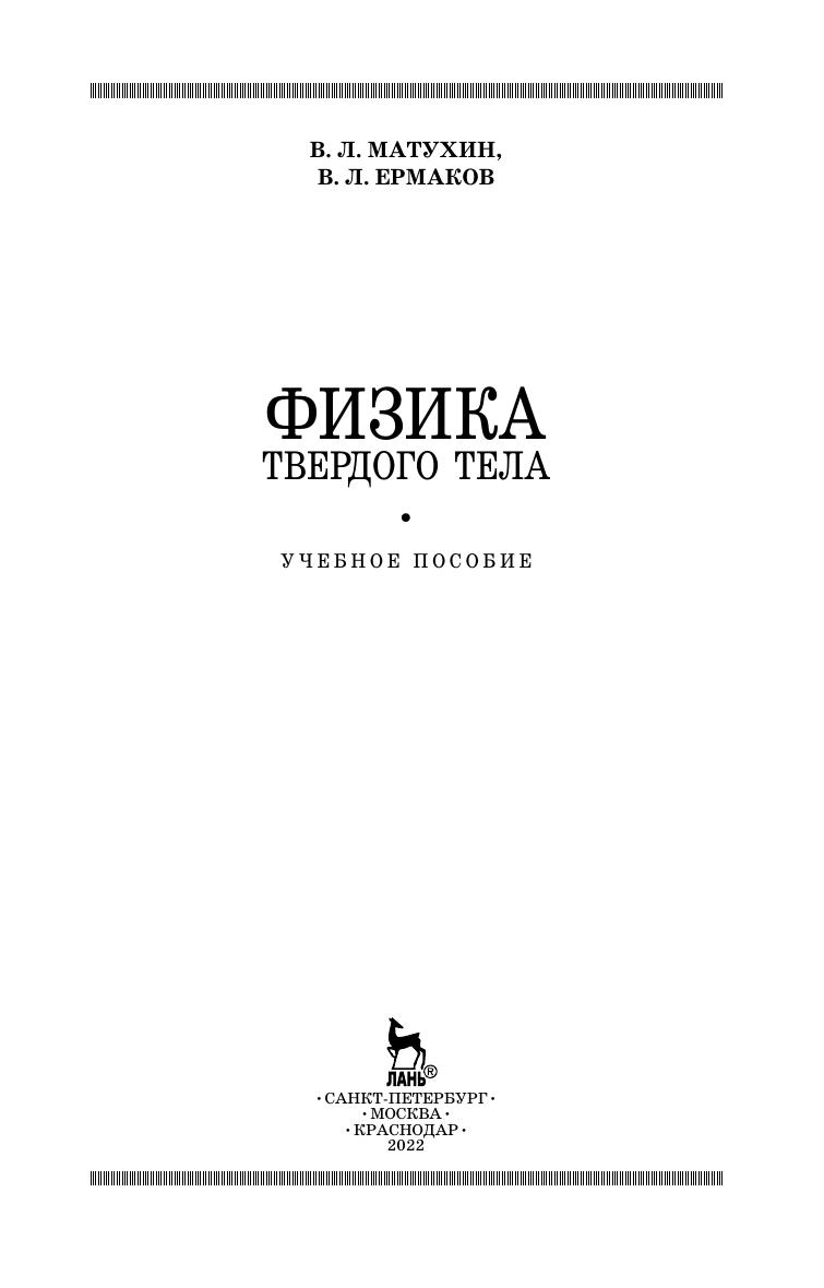 Изложены начальные основы курса физики твердого тела. Рассмотрены общие вопросы кристаллического строения и динамика решетки. Обсуждается зонная теория и на ее основе электрические свойства металлов и полупроводников, а также магнитные свойства твердых тел. Даются необходимые представления физики сверхпроводимости. Пособие предназначено для студентов технических специальностей.