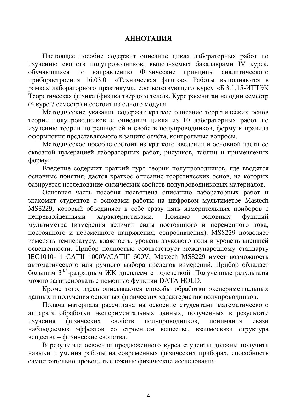 В учебно–методическом пособии представлен цикл лабораторных работ по изучению свойств полупроводников с использованием физических методов и современной приборной базы. Пособие предназначено для бакалавров, обучающихся по направлению 223200 «Техническая физика» Физические принципы аналитического приборостроения. Методические указания содержат краткое изложение основ физики полупроводников, теории погрешностей, способов измерения параметров среды, расчёта основных параметров полупроводников и правила составления итоговых отчётов.