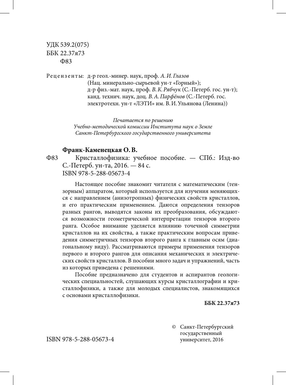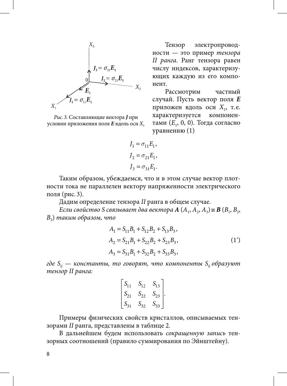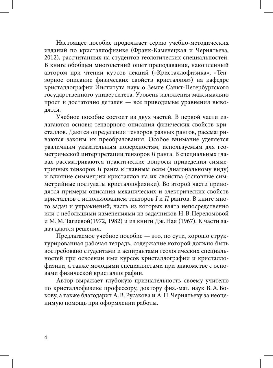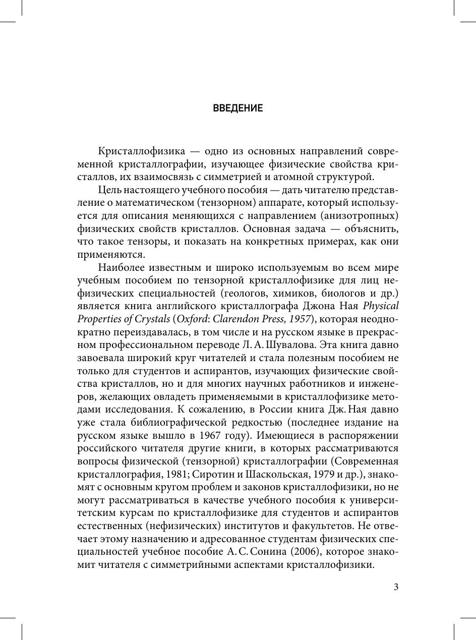 Настоящее пособие знакомит читателя с математическим (тензорным) аппаратом, который используется для изучения меняющихся с направлением (анизотропных) физических свойств кристаллов, и его практическим применением. Даются определения тензоров разных рангов, выводятся законы их преобразования, обсуждаются возможности геометрической интерпретации тензоров второго ранга. Особое внимание уделяется влиянию точечной симметрии кристаллов на их свойства, а также практическим вопросам приведения симметричных тензоров второго ранга к главным осям (диагональному виду). Рассматриваются примеры применения тензоров первого и второго рангов для описания механических и электрических свойств кристаллов. В пособии много задач и упражнений, часть из которых приведена с решениями.
