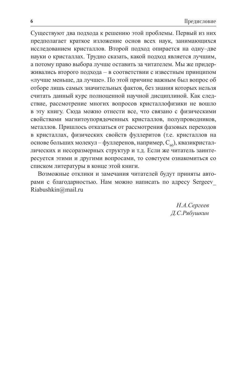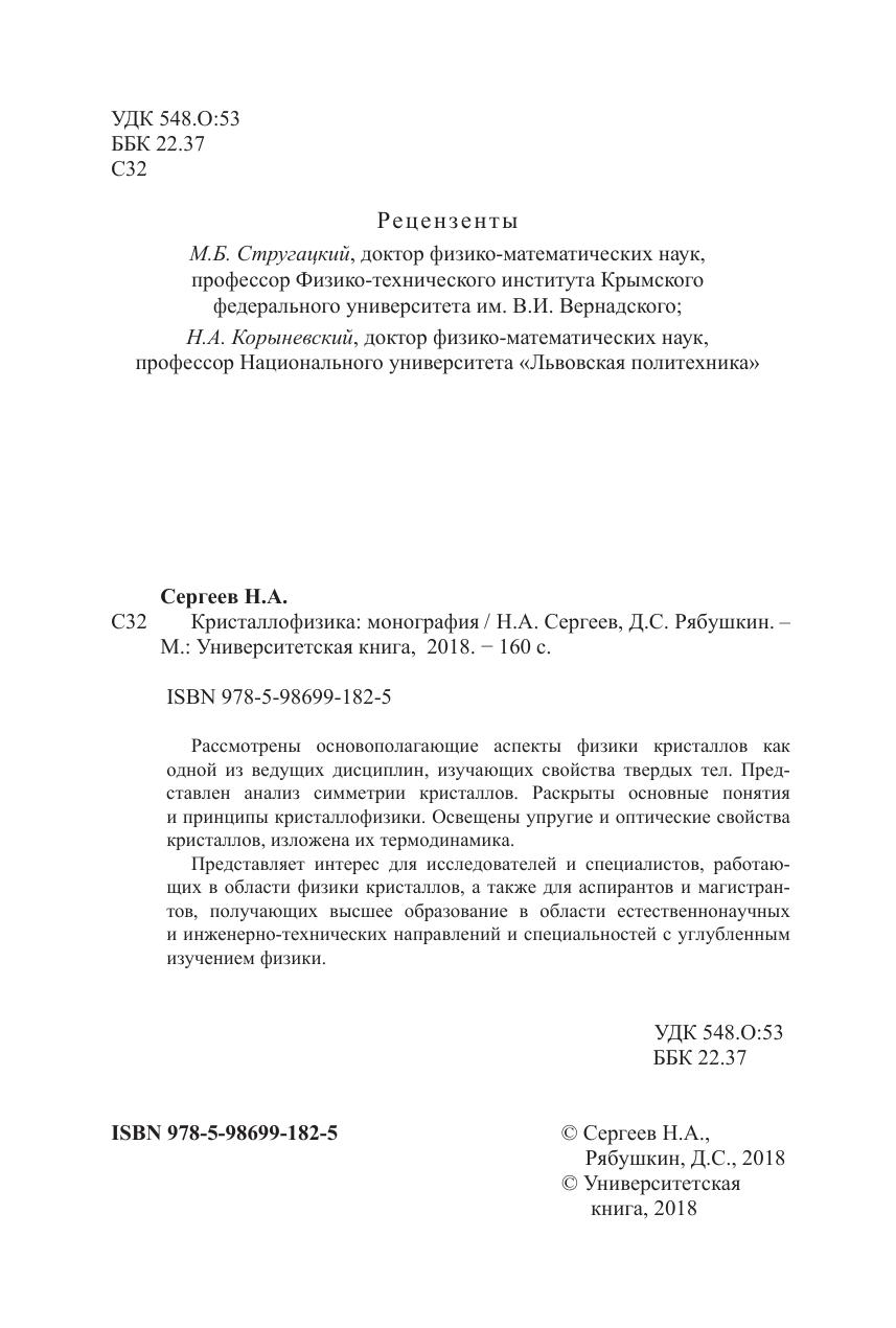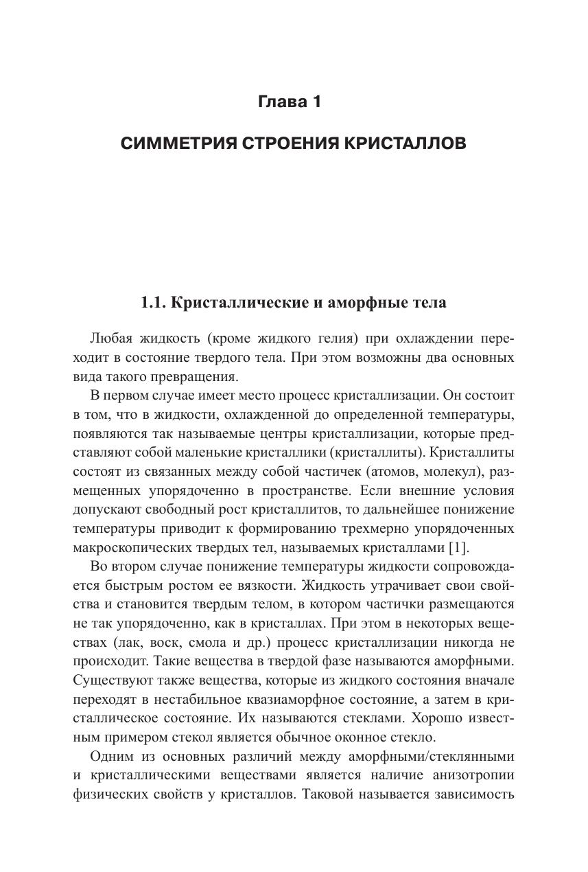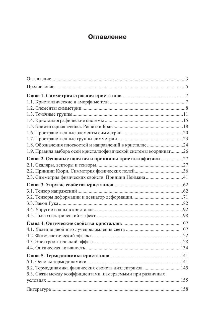 Рассмотрены основополагающие аспекты физики кристаллов как одной из ведущих дисциплин, изучающих свойства твердых тел. Представлен анализ симметрии кристаллов. Раскрыты основные понятия и принципы кристаллофизики. Освещены упругие и оптические свойства кристаллов, изложена их термодинамика. Представляет интерес для исследователей и специалистов, работающих в области физики кристаллов, а также для аспирантов и магистрантов, получающих высшее образование в области естественнонаучных и инженерно-технических направлений и специальностей с углубленным изучением физики.