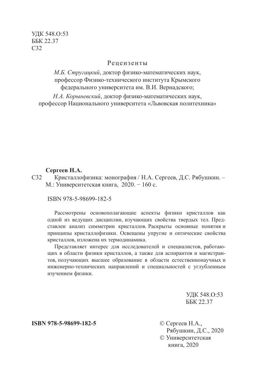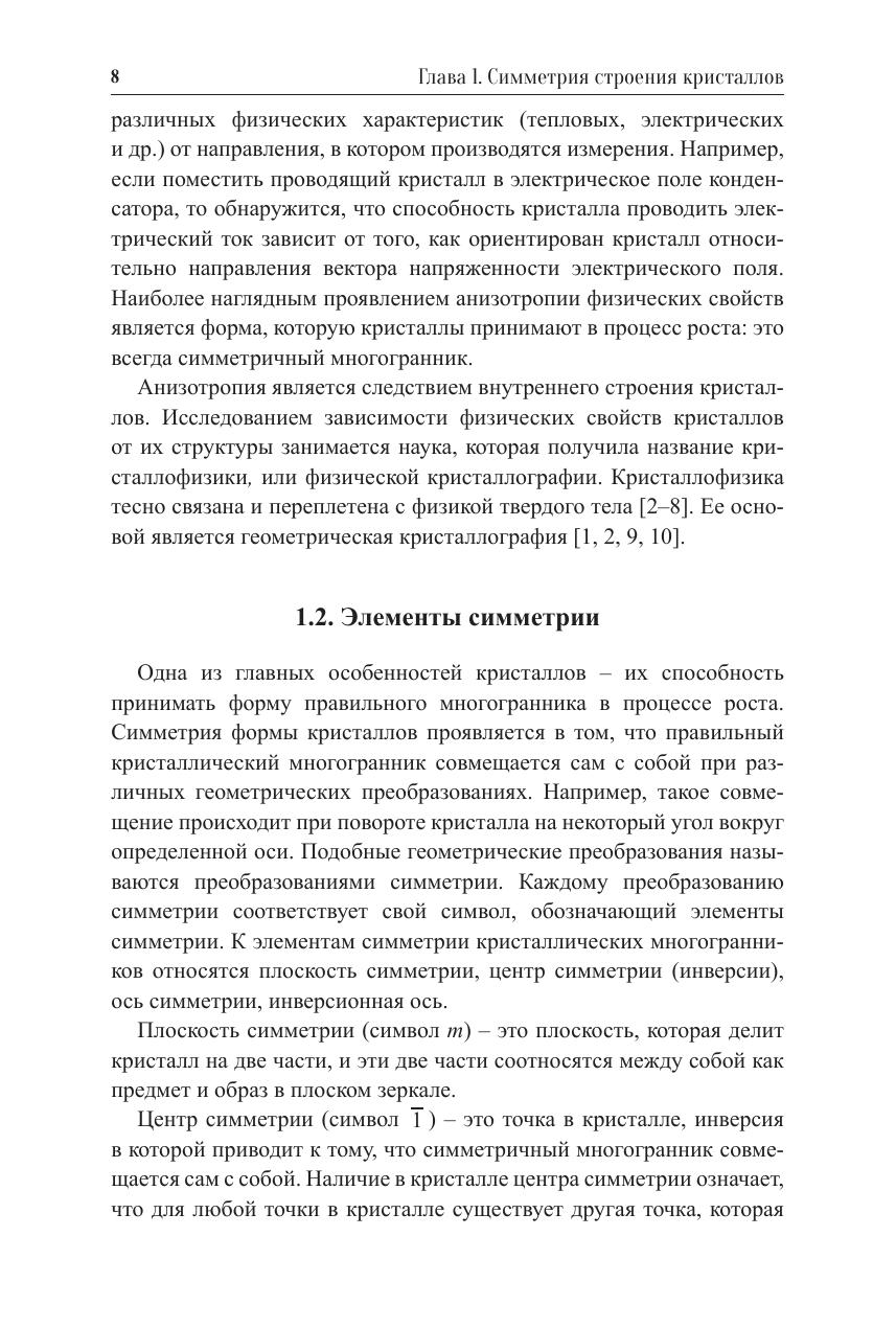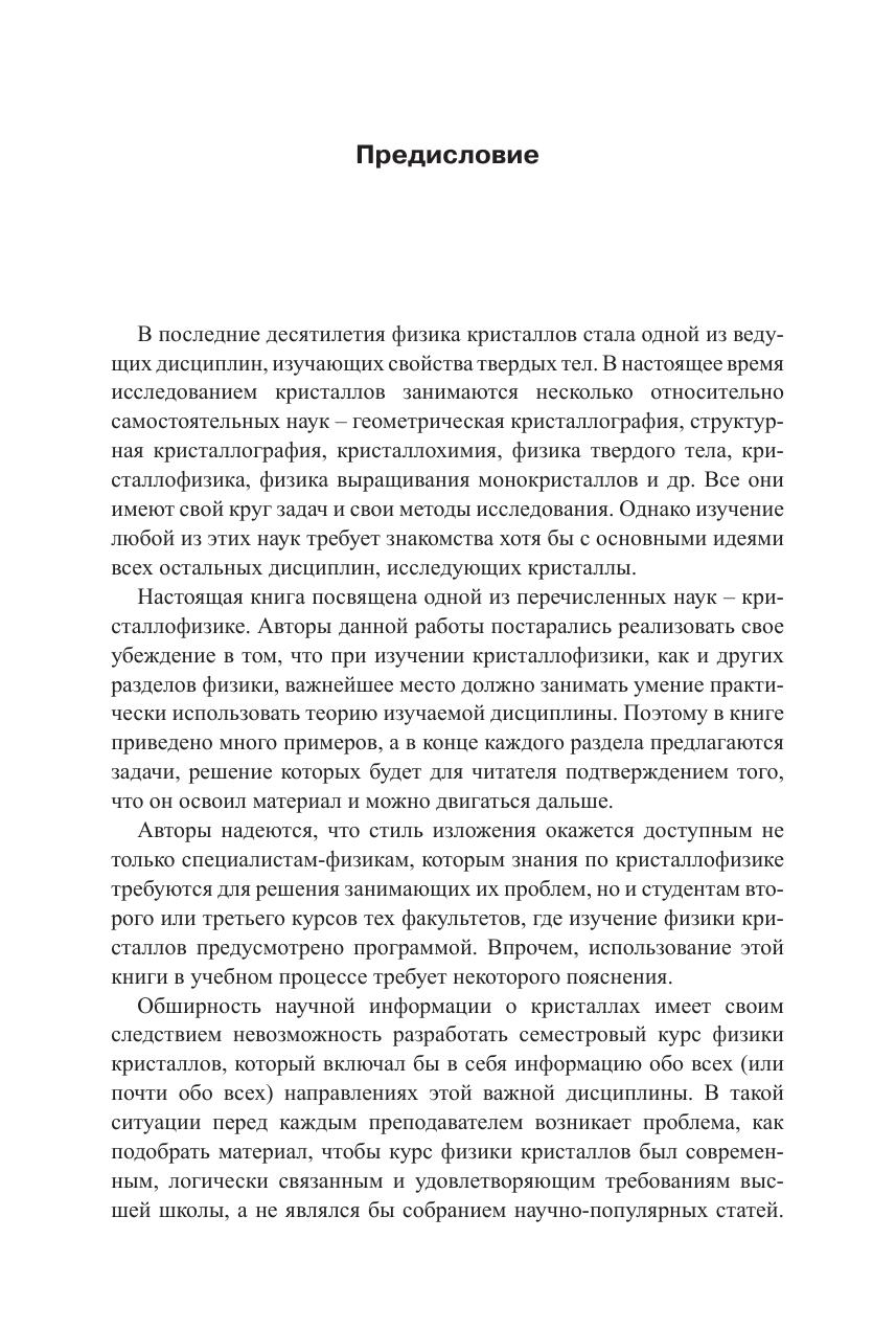 Рассмотрены основополагающие аспекты физики кристаллов как одной из ведущих дисциплин, изучающих свойства твердых тел. Представлен анализ симметрии кристаллов. Раскрыты основные понятия и принципы кристаллофизики. Освещены упругие и оптические свойства кристаллов, изложена их термодинамика. Представляет интерес для исследователей и специалистов, работающих в области физики кристаллов, а также для аспирантов и магистрантов, получающих высшее образование в области естественнонаучных и инженерно-технических направлений и специальностей с углубленным изучением физики.
