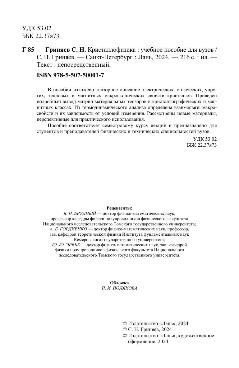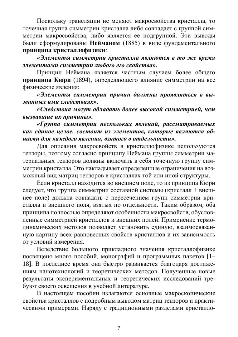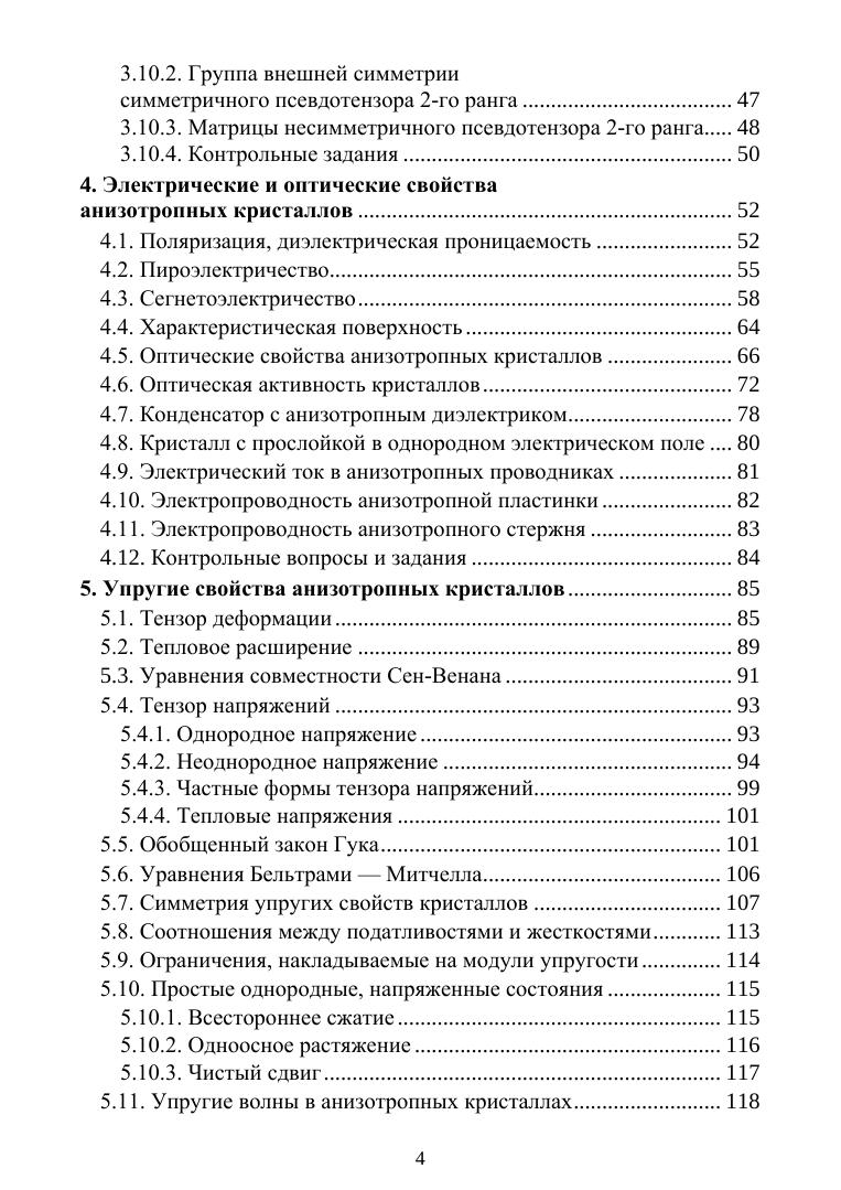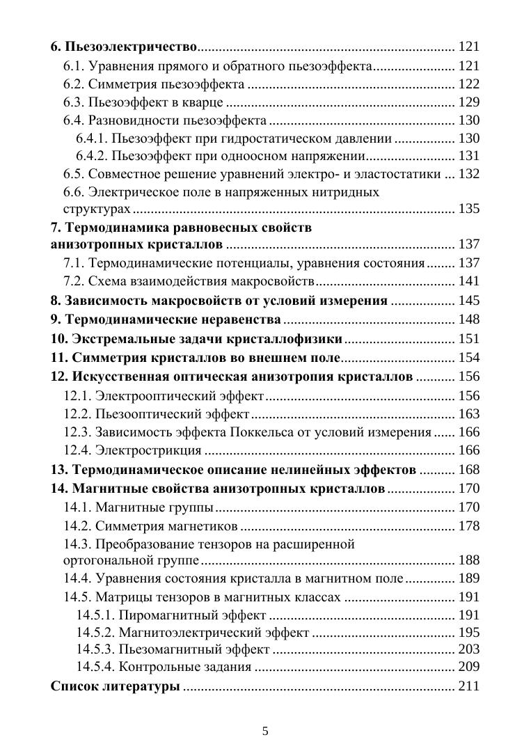 В пособии изложено тензорное описание электрических, оптических, упругих, тепло-вых и магнитных макроскопических свойств кристаллов. Приведен подробный вывод матриц материальных тензоров в кристаллографических и магнитных классах. Из термодинамического анализа определена взаимосвязь макросвойств и их зависимость от условий измерения. Рассмотрены новые материалы, перспективные для практического использования. Пособие соответствует семестровому курсу лекций и предназначено для студентов и преподавателей физических и технических специальностей вузов.