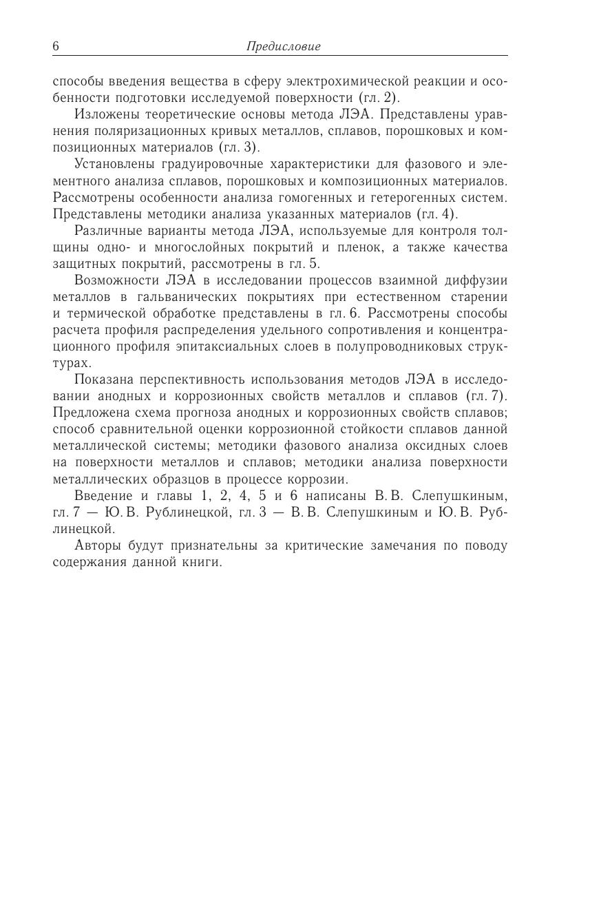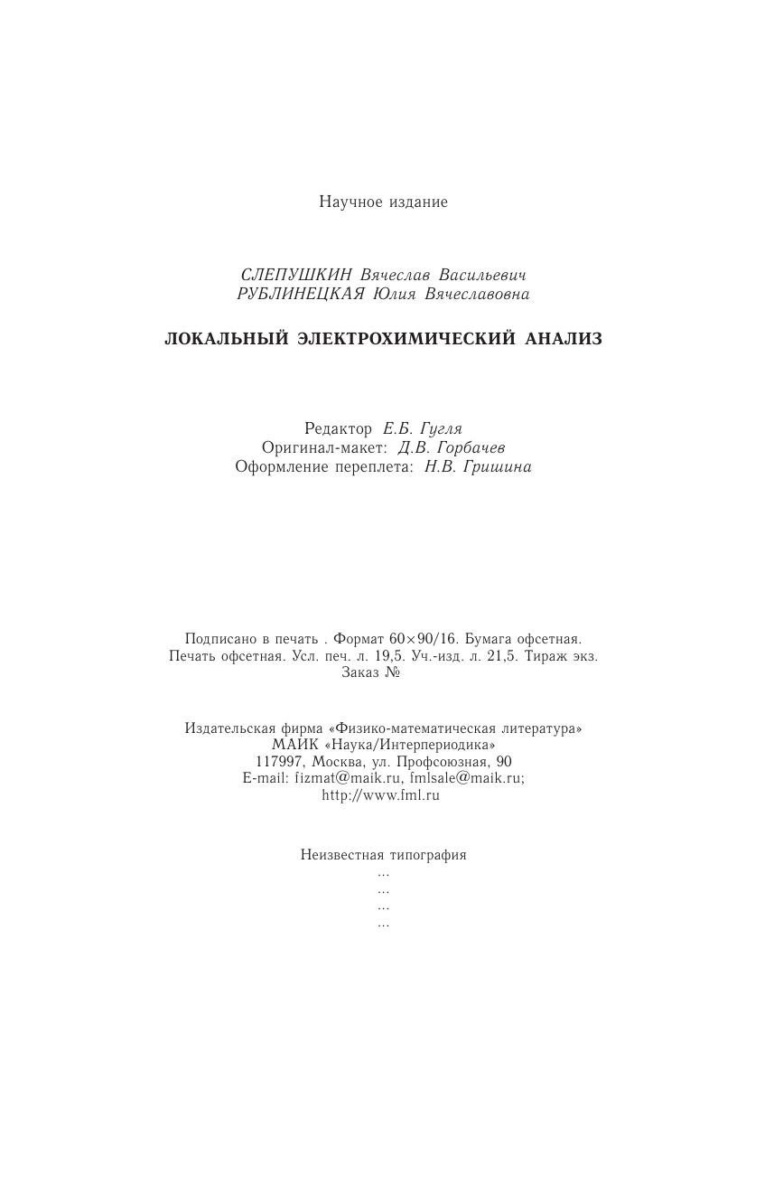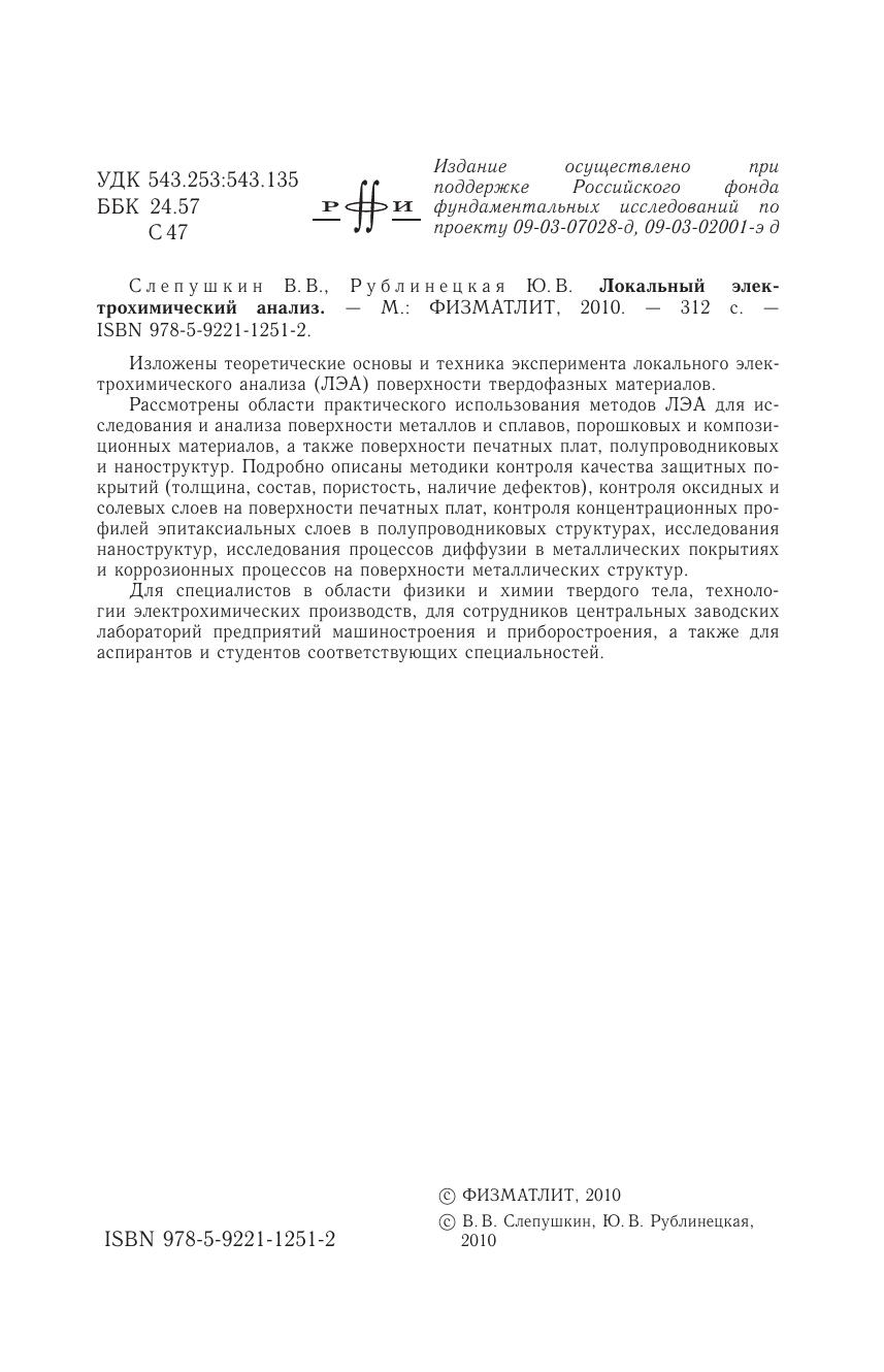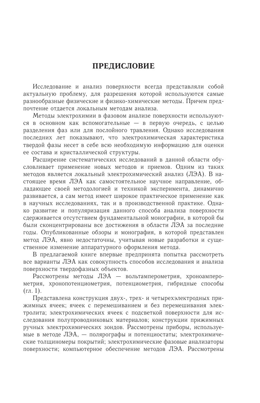 Изложены теоретические основы и техника эксперимента локального электрохимического анализа (ЛЭА) поверхности твердофазных материалов. Рассмотрены области практического использования методов ЛЭА для исследования и анализа поверхности металлов и сплавов, порошковых и композиционных материалов, а также поверхности печатных плат, полупроводниковых и наноструктур. Подробно описаны методики контроля качества защитных покрытий (толщина, состав, пористость, наличие дефектов), контроля оксидных и солевых слоев на поверхности печатных плат, контроля концентрационных профилей эпитаксиальных слоев в полупроводниковых структурах, исследования наноструктур, исследования процессов диффузии в металлических покрытиях и коррозионных процессов на поверхности металлических структур.Для специалистов в области физики и химии твердого тела, технологии электрохимических производств, для сотрудников центральных заводских лабораторий предприятий машиностроения и приборостроения, а также для аспирантов и студентов соответствующих специальностей.