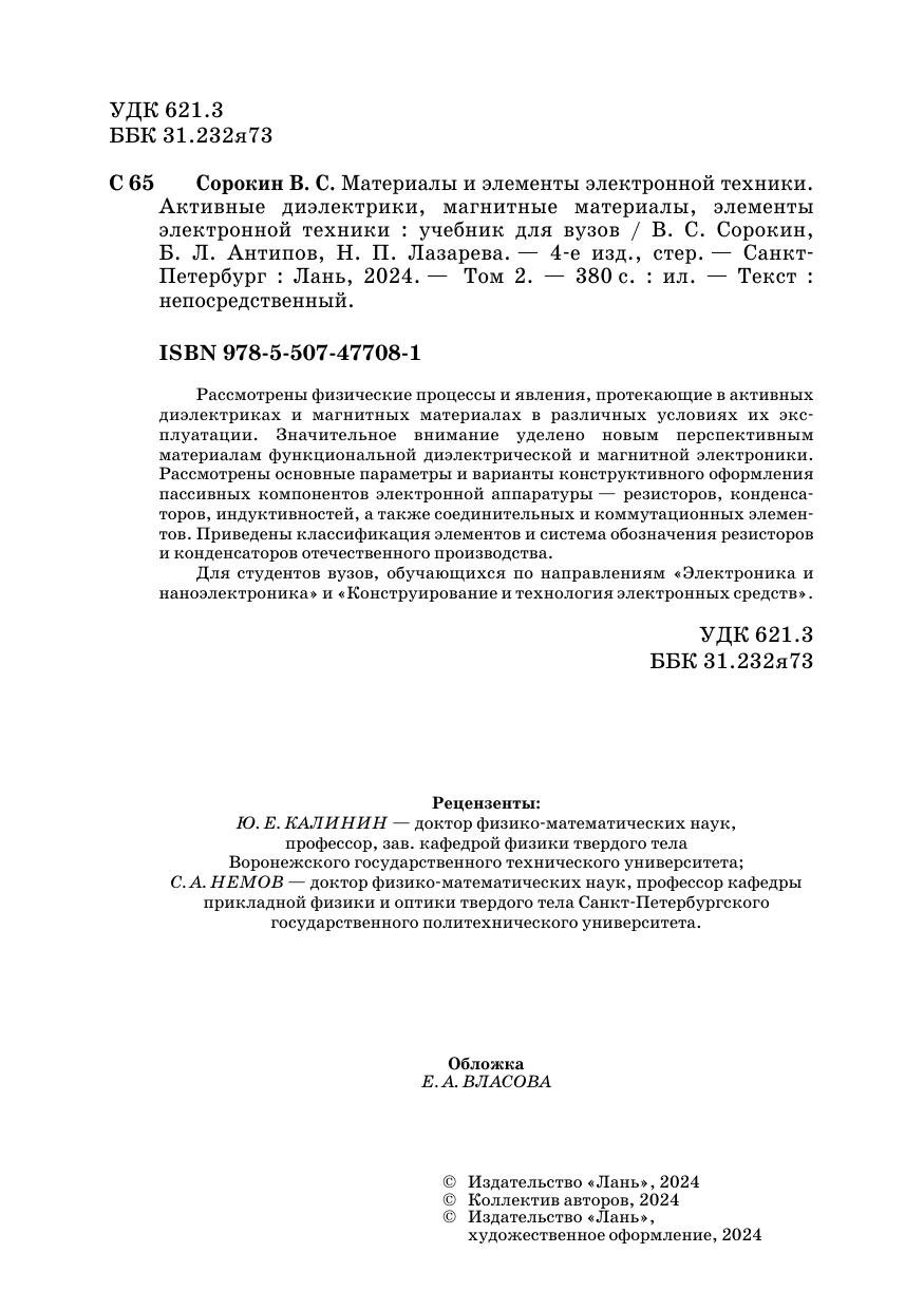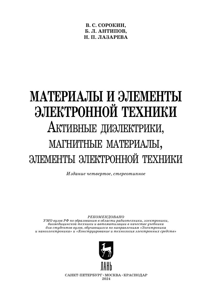 Рассмотрены физические процессы и явления, протекающие в активных диэлектриках и магнитных материалах в различных условиях их эксплуатации. Значительное внимание уделено новым перспективным материалам функциональной диэлектрической и магнитной электроники. Рассмотрены основные параметры и варианты конструктивного оформления пассивных компонентов электронной аппаратуры - резисторов, конденсаторов, индуктивностей, а также соединительных и коммутационных элементов. Приведены классификация элементов и система обозначения резисторов и конденсаторов отечественного производства. Для студентов вузов.