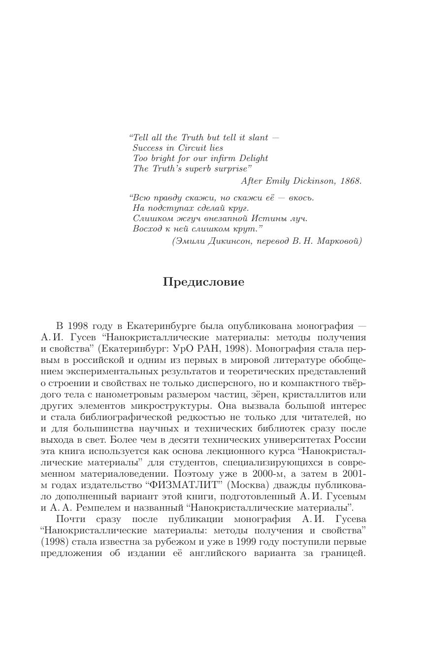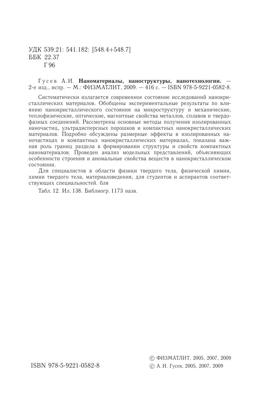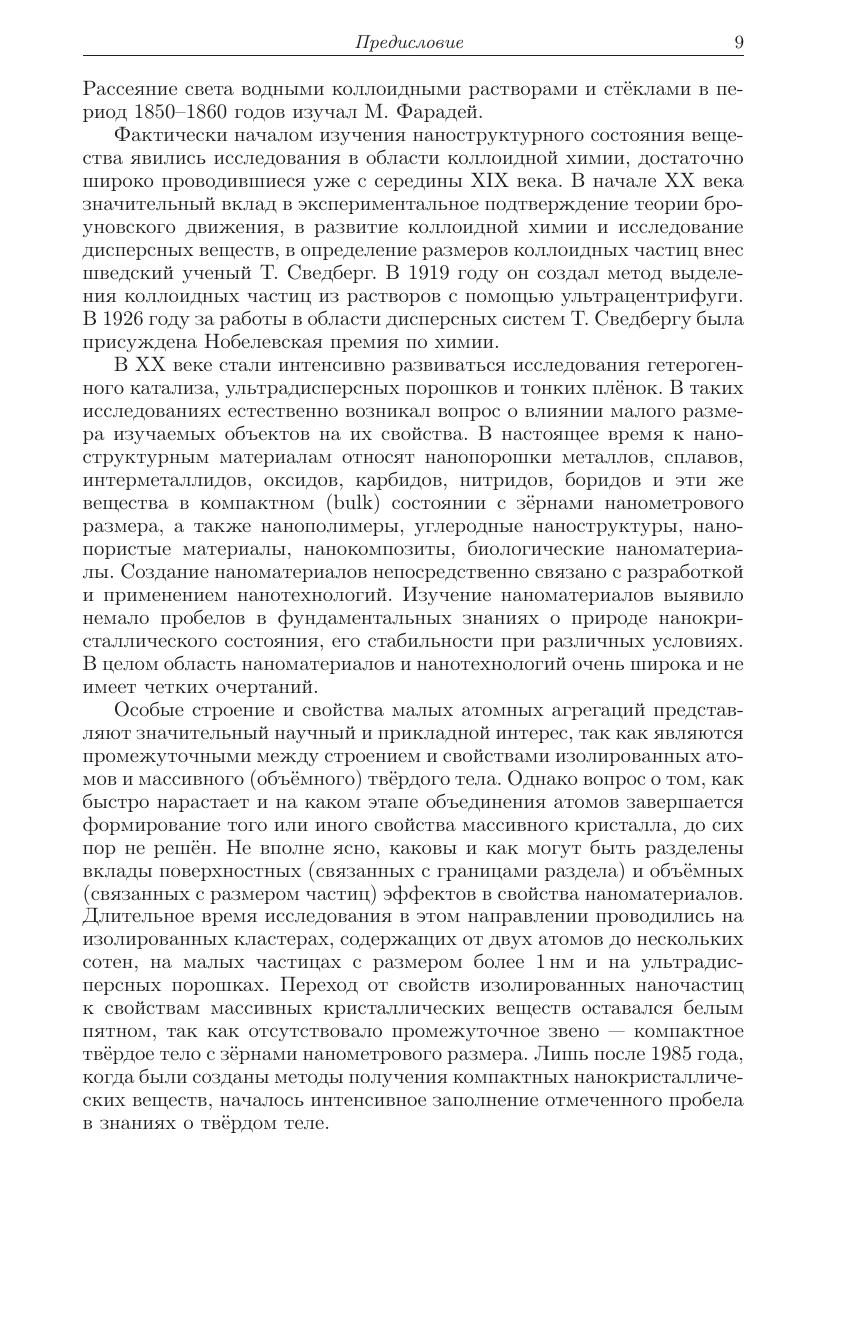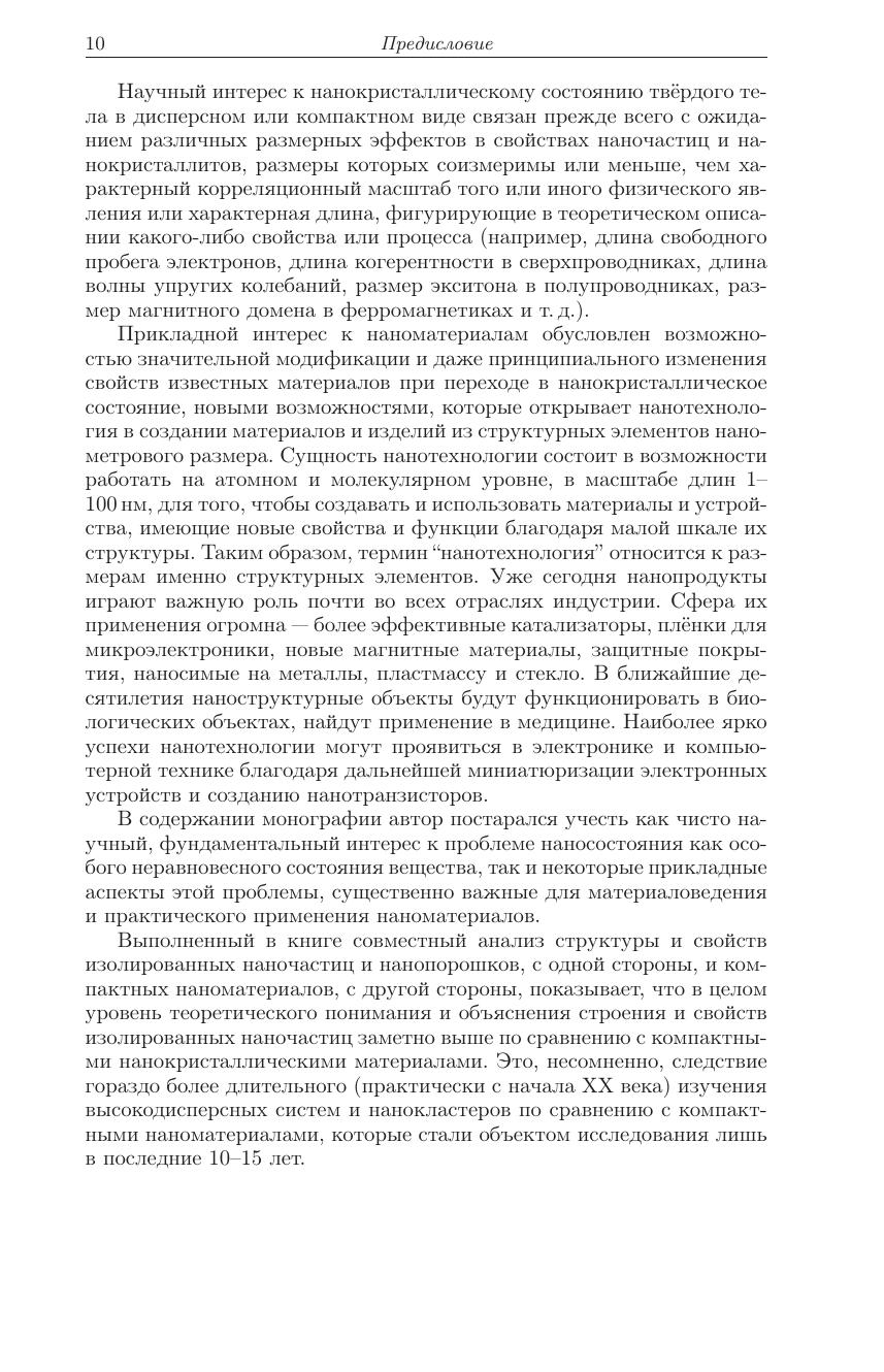 Систематически излагается современное состояние исследований нанокристаллических материалов. Обобщены экспериментальные результаты по влиянию нанокристаллического состояния на микроструктуру и механические, теплофизические, оптические, магнитные свойства металлов, сплавов и твердо-фазных соединений. Рассмотрены основные методы получения изолированных наночастиц, ультрадисперсных порошков и компактных нанокристаллических материалов. Подробно обсуждены размерные эффекты в изолированных наночастицах и компактных нанокристаллических материалах, показана важная роль границ раздела в формировании структуры и свойств компактных наноматериалов. Проведен анализ модельных представлений, объясняющих особенности строения и аномальные свойства веществ в нанокристаллическом состоянии.Для специалистов в области физики твердого тела, физической химии, химии твердого тела, материаловедения, для студентов и аспирантов соответствующих специальностей.