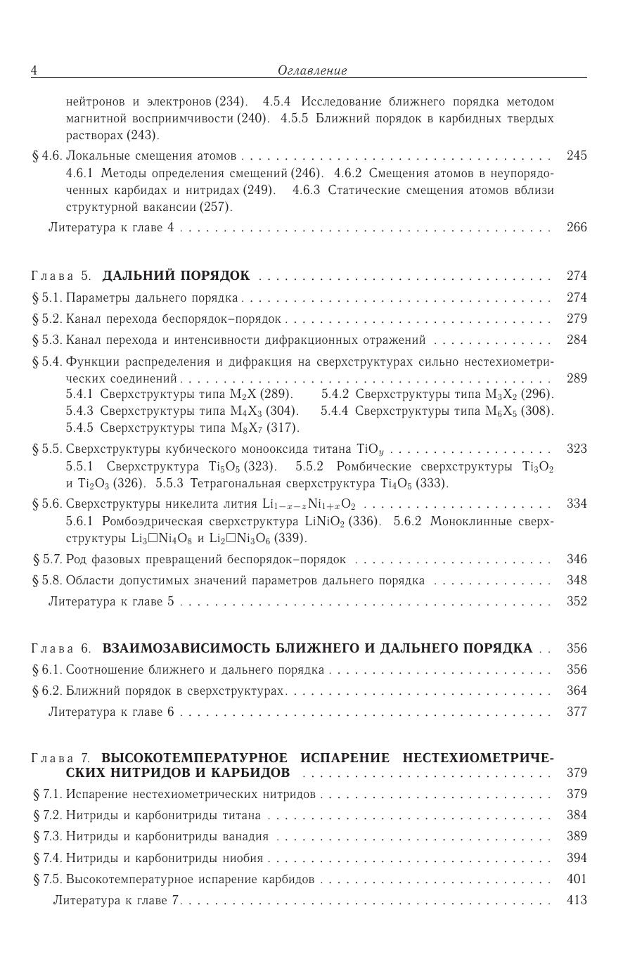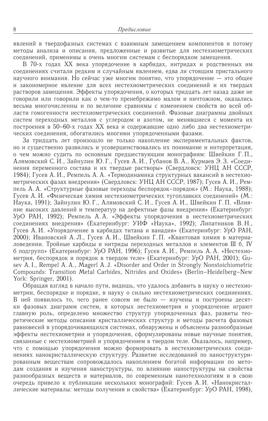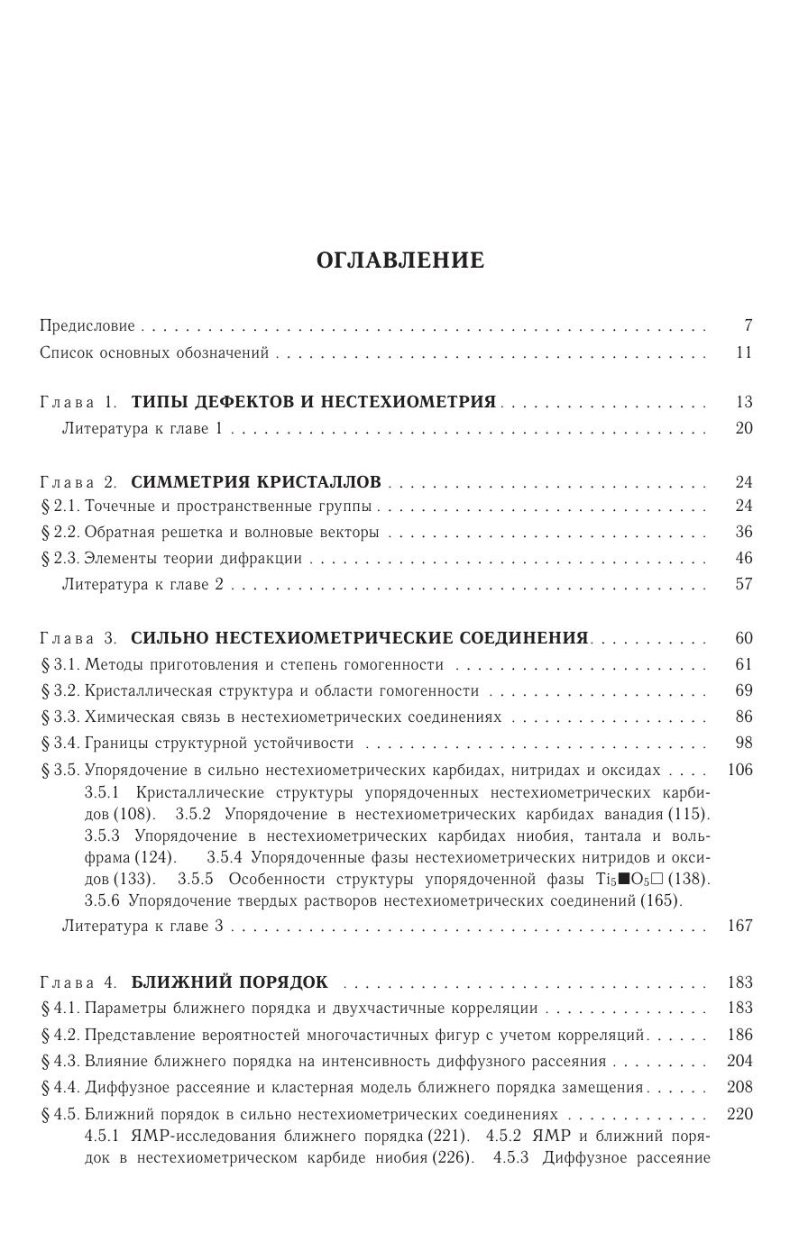 Нестехиометрия, обусловленная наличием структурных вакансий, широко распространена в твердофазных соединениях и создает предпосылки для неупорядоченного или упорядоченного распределения атомов и вакансий. Упорядочение и разупорядочение возможныв любых системах с замещением. К ним относятся рассматриваемые в книге сильно нестехиометрические соединения (карбиды, нитриды, оксиды переходных металлов и родственные им тройные соединения внедрения), металлические сплавыи твердые растворы замещения. Изложено современное состояние исследований структурных фазовых переходов порядокбеспорядок в нестехиометрических соединениях. Приведен обширный экспериментальный материал по структуре и свойствам неупорядоченной и упорядоченных фаз нестехиометрических соединений, соотношению между ближним и дальним порядком в упорядочивающихся сплавах, твердых растворах и нестехиометрических соединениях. Подробно рассмотрены результатысимм етрийного анализа превращений беспорядок-порядок, описаны основные методы расчета фазовых равновесий в системах с нестехиометрией, приведеныре зультатыра счетов равновесных фазовых диаграмм упорядочивающихся систем. Даны исчерпывающий анализ и объяснение влияния упорядочения на различные свойства сильно нестехиометрических соединений. Для специалистов в области теории фазовых превращений в твердом теле, в области физики и химии твердого тела и теоретического материаловедения.