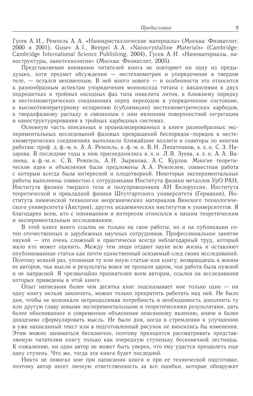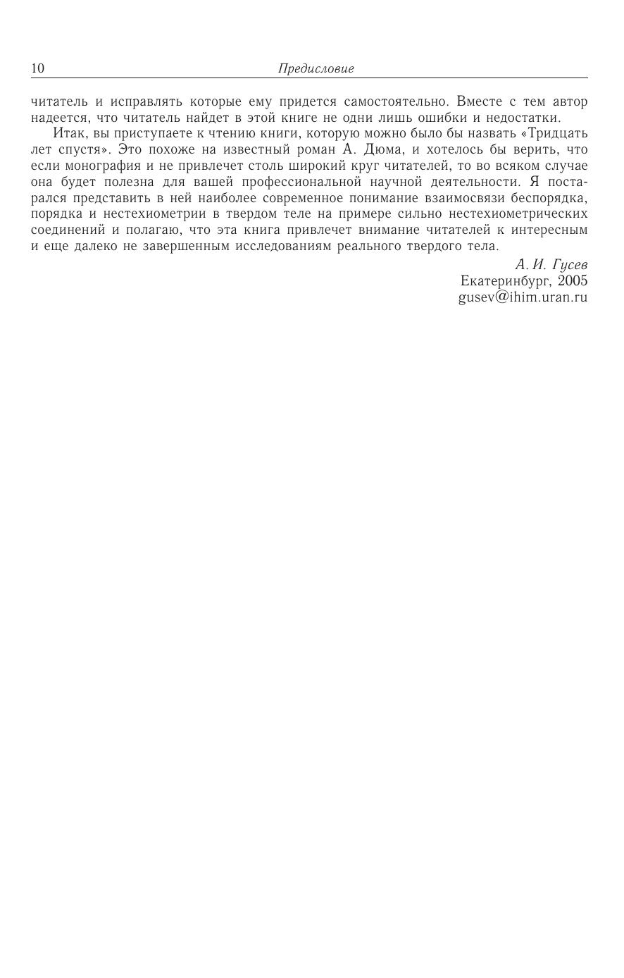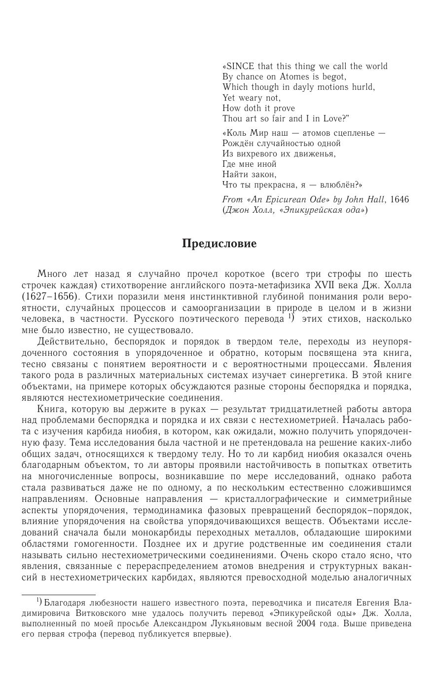 Нестехиометрия, обусловленная наличием структурных вакансий, широко распространена в твердофазных соединениях и создает предпосылки для неупорядоченного или упорядоченного распределения атомов и вакансий. Упорядочение и разупорядочение возможныв любых системах с замещением. К ним относятся рассматриваемые в книге сильно нестехиометрические соединения (карбиды, нитриды, оксиды переходных металлов и родственные им тройные соединения внедрения), металлические сплавыи твердые растворы замещения. Изложено современное состояние исследований структурных фазовых переходов порядокбеспорядок в нестехиометрических соединениях. Приведен обширный экспериментальный материал по структуре и свойствам неупорядоченной и упорядоченных фаз нестехиометрических соединений, соотношению между ближним и дальним порядком в упорядочивающихся сплавах, твердых растворах и нестехиометрических соединениях. Подробно рассмотрены результатысимм етрийного анализа превращений беспорядок-порядок, описаны основные методы расчета фазовых равновесий в системах с нестехиометрией, приведеныре зультатыра счетов равновесных фазовых диаграмм упорядочивающихся систем. Даны исчерпывающий анализ и объяснение влияния упорядочения на различные свойства сильно нестехиометрических соединений. Для специалистов в области теории фазовых превращений в твердом теле, в области физики и химии твердого тела и теоретического материаловедения.
