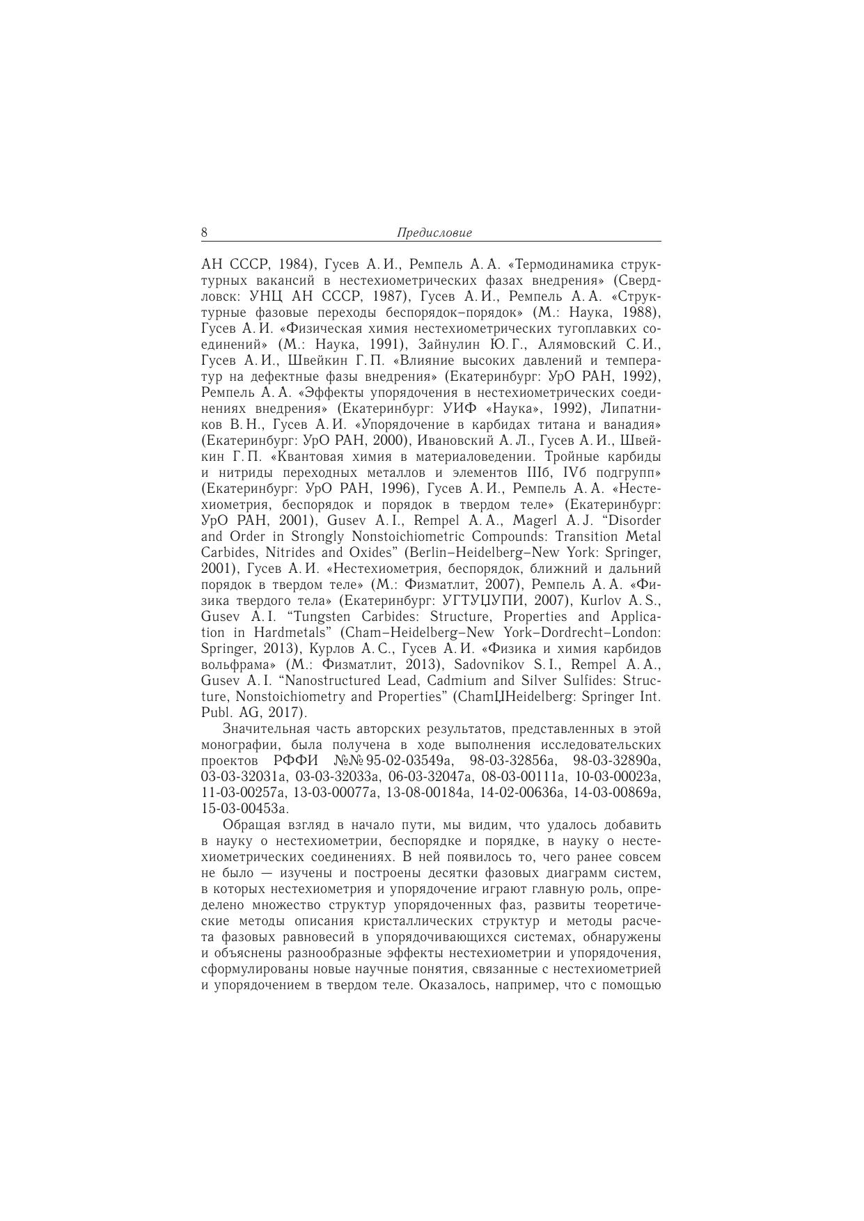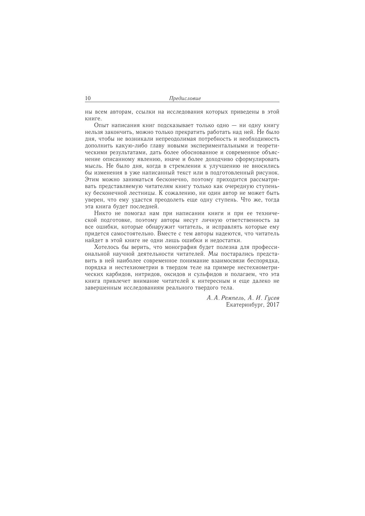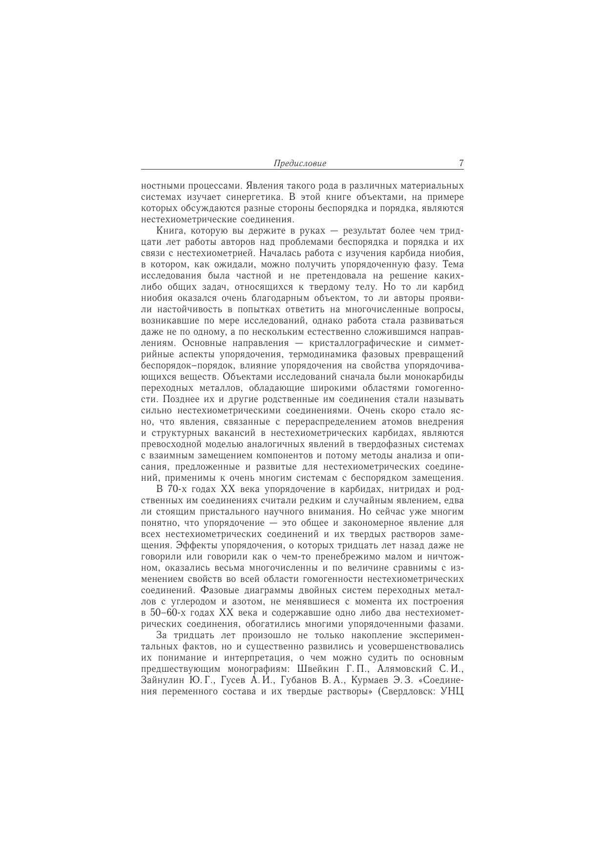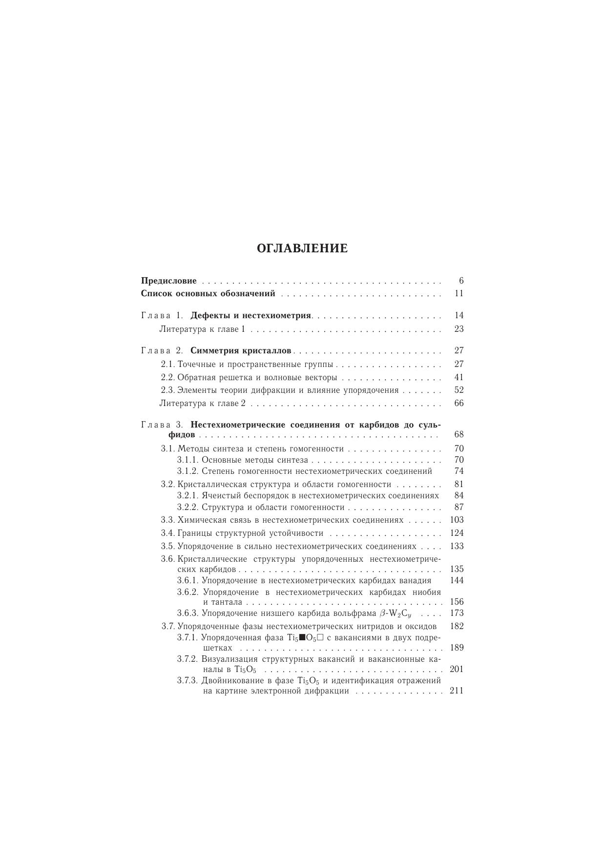 Основное содержание книги связано со всесторонним обсуждением явлений нестехиометрии, беспорядка и порядка в твердом теле. Нестехиометрия, обусловленная наличием структурных вакансий, широко распространена в твердофазных соединениях и создает предпосылки для неупорядоченного или упорядоченного распределения атомов и вакансий. Упорядочение и разупорядочение возможны в любых системах с замещением. К ним относятся рассматриваемые в книге нестехиометрические соединения (карбиды, нитриды, оксиды, сульфиды, родственные им тройные соединения внедрения), металлические сплавы и твердые растворы замещения. Приведен обширный экспериментальный материал по структуре неупорядоченной и упорядоченных фаз нестехиометрических соединений, соотношению между ближним и дальним порядком в нестехиометрических соединениях. Подробно рассмотрены результаты симметрийного анализа превращений беспорядок–порядок. Монография рассчитана на специалистов в области теории фазовых превращений в твердом теле, физики и химии твердого тела и теоретического материаловедения.
