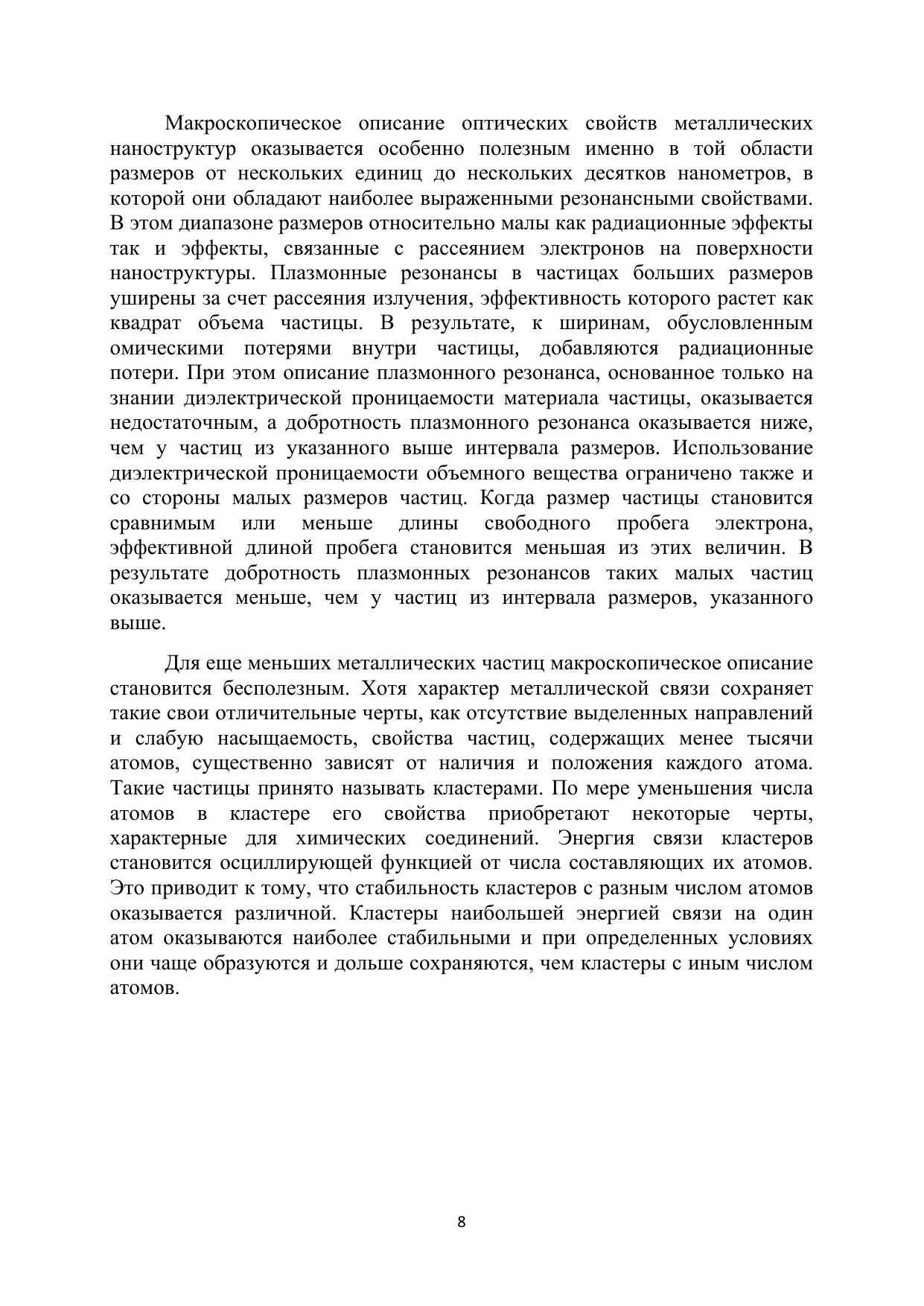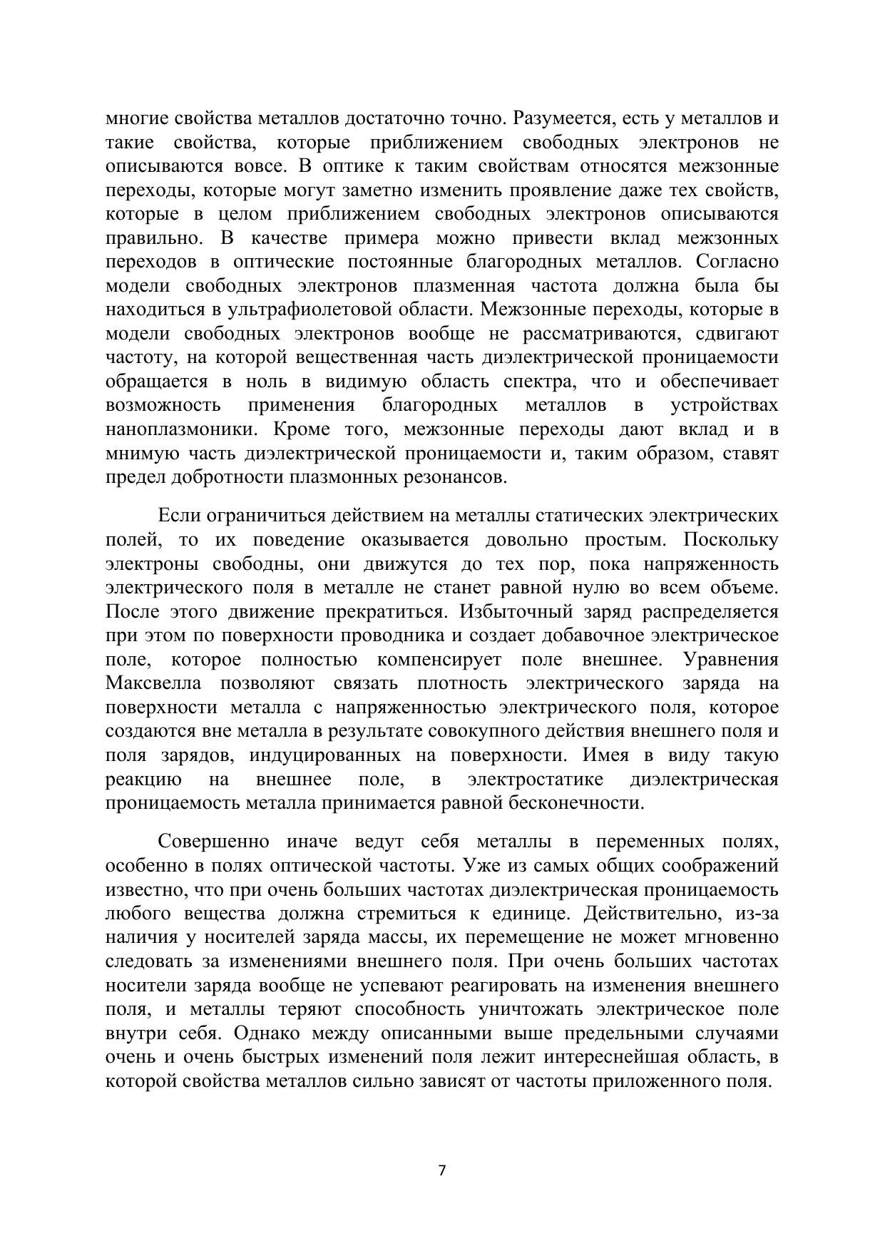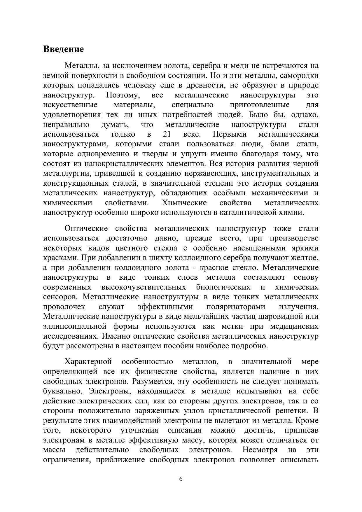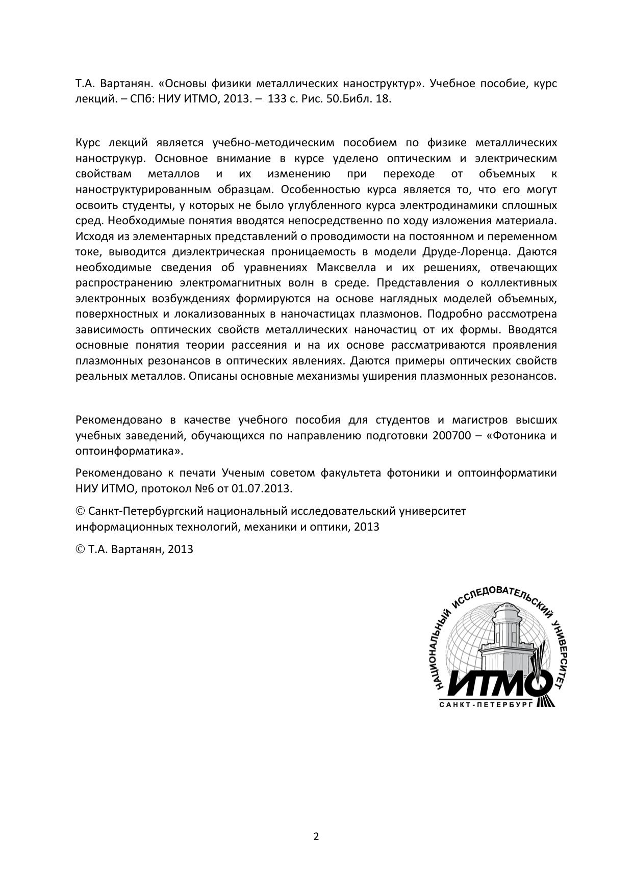 Курс лекций является учебно-методическим пособием по физике металлических нанострукур. Основное внимание в курсе уделено оптическим и электрическим свойствам металлов и их изменению при переходе от объемных к наноструктурированным образцам. Особенностью курса является то, что его могут освоить студенты, у которых не было углубленного курса электродинамики сплошных сред. Необходимые понятия вводятся непосредственно по ходу изложения материала. Исходя из элементарных представлений о проводимости на постоянном и переменном токе, выводится диэлектрическая проницаемость в модели Друде-Лоренца. Даются необходимые сведения об уравнениях Максвелла и их решениях, отвечающих распространению электромагнитных волн в среде. Представления о коллективных электронных возбуждениях формируются на основе наглядных моделей объемных, поверхностных и локализованных в наночастицах плазмонов. Подробно рассмотрена зависимость оптических свойств металлических наночастиц от их формы. Вводятся основные понятия теории рассеяния и на их основе рассматриваются проявления плазмонных резонансов в оптических явлениях. Даются примеры оптических свойств реальных металлов. Описаны основные механизмы уширения плазмонных резонансов.