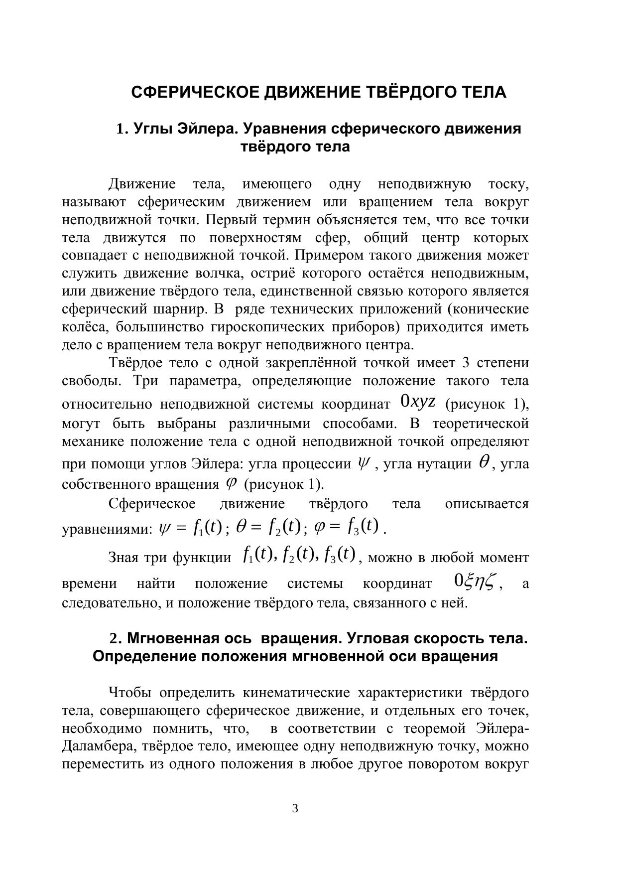 Приводятся методические указания для исследования сферического движения твердых тел, подробно рассматриваются примеры исследования движения тел с одной неподвижной точкой. Для студентов направлений 141200, 190600, 220700, 151000, 140700 всех форм обучения.