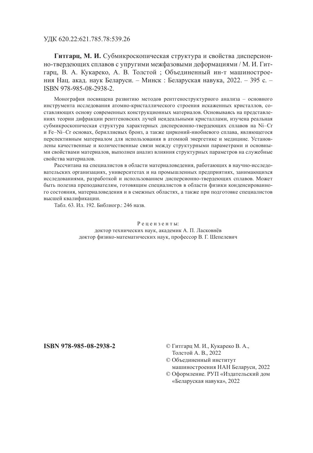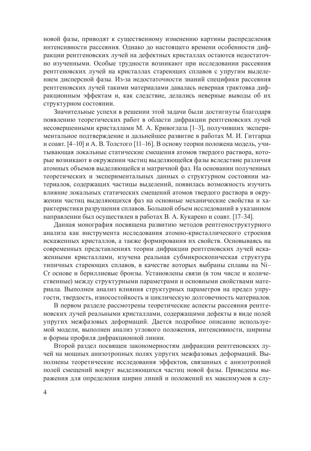 Монография посвящена развитию методов рентгеноструктурного анализа – основного инструмента исследования атомно-кристаллического строения искаженных кристаллов, составляющих основу современных конструкционных материалов. Основываясь на представлениях теории дифракции рентгеновских лучей неидеальными кристаллами, изучена реальная субмикроскопическая структура характерных дисперсионно-твердеющих сплавов на Ni–Cr и Fe–Ni–Cr основах, бериллиевых бронз, а также цирконий-ниобиевого сплава, являющегося перспективным материалом для использования в атомной энергетике и медицине. Установлены качественные и количественные связи между структурными параметрами и основными свойствами материалов, выполнен анализ влияния структурных параметров на служебные свойства материалов.