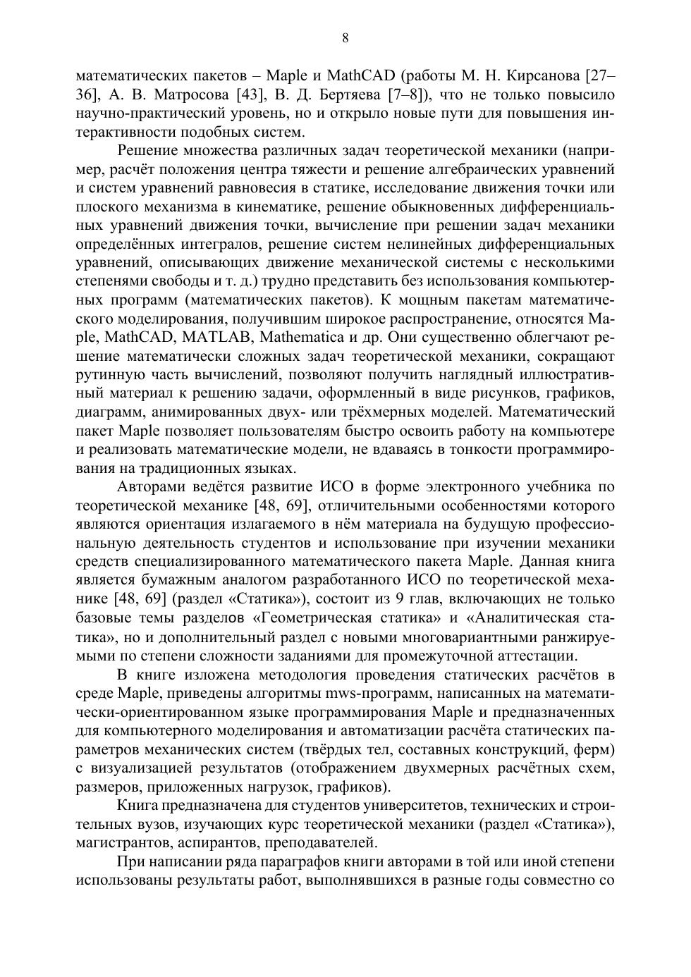 Изложены основы теории по разделу «Статика» в объёме требований программ по курсу «Теоретическая механика» для технических специальностей высшего профессионального образования, приведены задания разного уровня сложности, методические указания с примерами выполнения этих заданий и программы для их решения в среде Maple.
