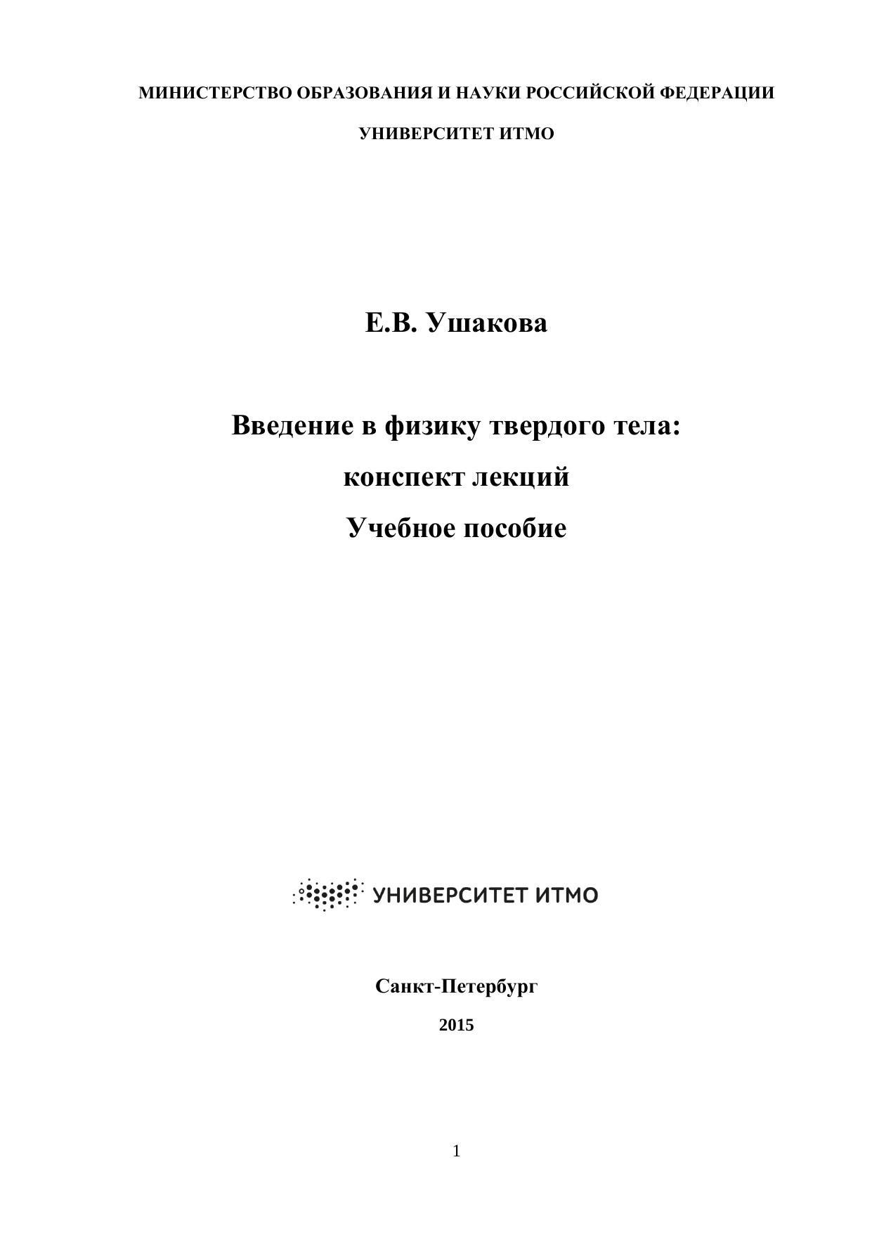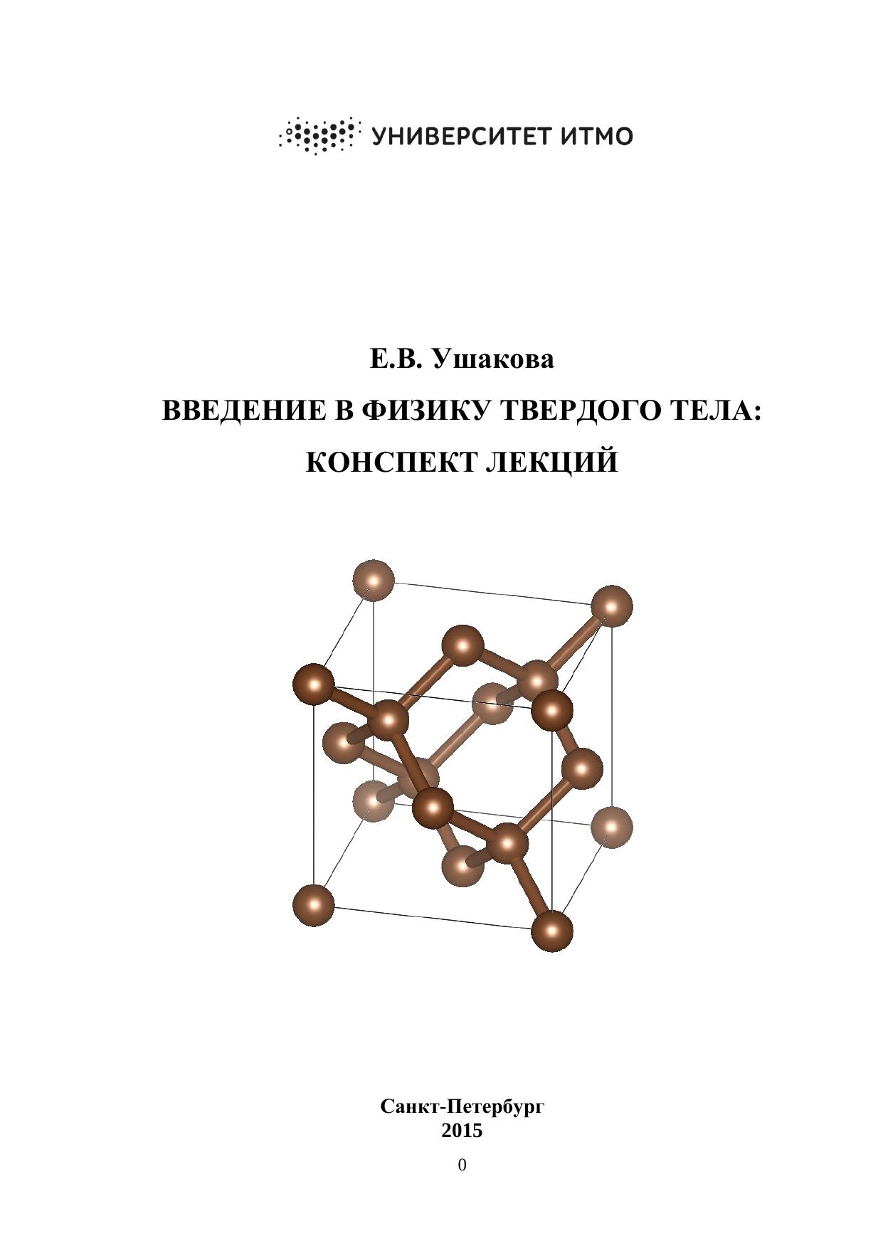 Дисциплина «Введение в физику твердого тела» относится к профессиональному циклу дисциплин профилей подготовки «Оптика наноструктур» и «Физика наноструктур». В данном курсе изложен круг вопросов, составляющих основы физики твердого тела, дано описание основных типов кристаллических решеток, рассмотрены типы и силы связи в кристаллах, строение колебательной подсистемы твердых тел, дано общее представление о теории упругости и дефектах в кристаллах. Учебное пособие предназначено для обучения бакалавров по направлению 12.03.03 «Фотоника и оптоинформатика». Материал может быть рекомендован для студентов начальных курсов физико-технических специальностей.