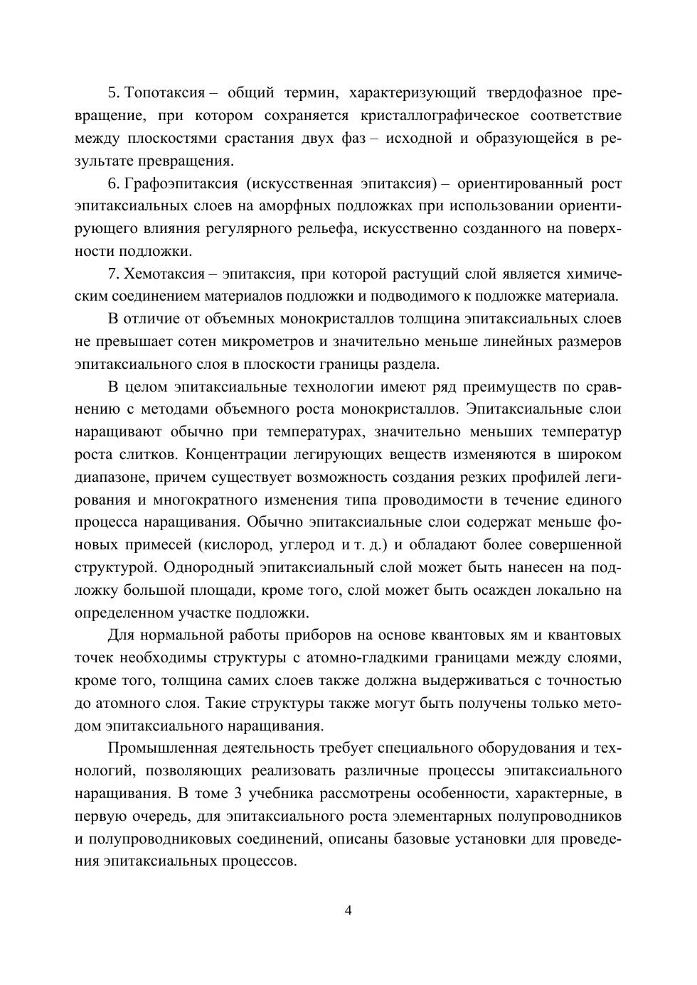 Представлены основные виды эпитаксиальных технологий. Рассмотрено конструктивное оформление и основные параметры наиболее распространенных видов эпитаксиального роста. Сформулированы требования к эпитаксиальным подложкам и описаны основные этапы их подготовки для эпитаксии. Рассмотрены особенности зародышеобразования в гетерогенных системах. Представлена классификация видов и механизмов эпитаксии. Структурные особенности эпитаксиальных систем классифицируются на основе бикристаллографического подхода, с привлечением понятий о метрическом и симметрийном несоответствии компонентов эпитаксиальной пары. Рассмотрена методика идентификации ориентационных соотношений в гетероэпитаксиальных системах, основные источники упругих напряжений и механизмы их релаксации. Учебник предназначен для бакалавров, обучающихся по направлениям «Электроника и наноэлектроника» и «Нанотехнологии и микросистемная техника». Может быть полезен для аспирантов и научных сотрудников, специализирующихся в проблематике эпитаксиальных технологий.