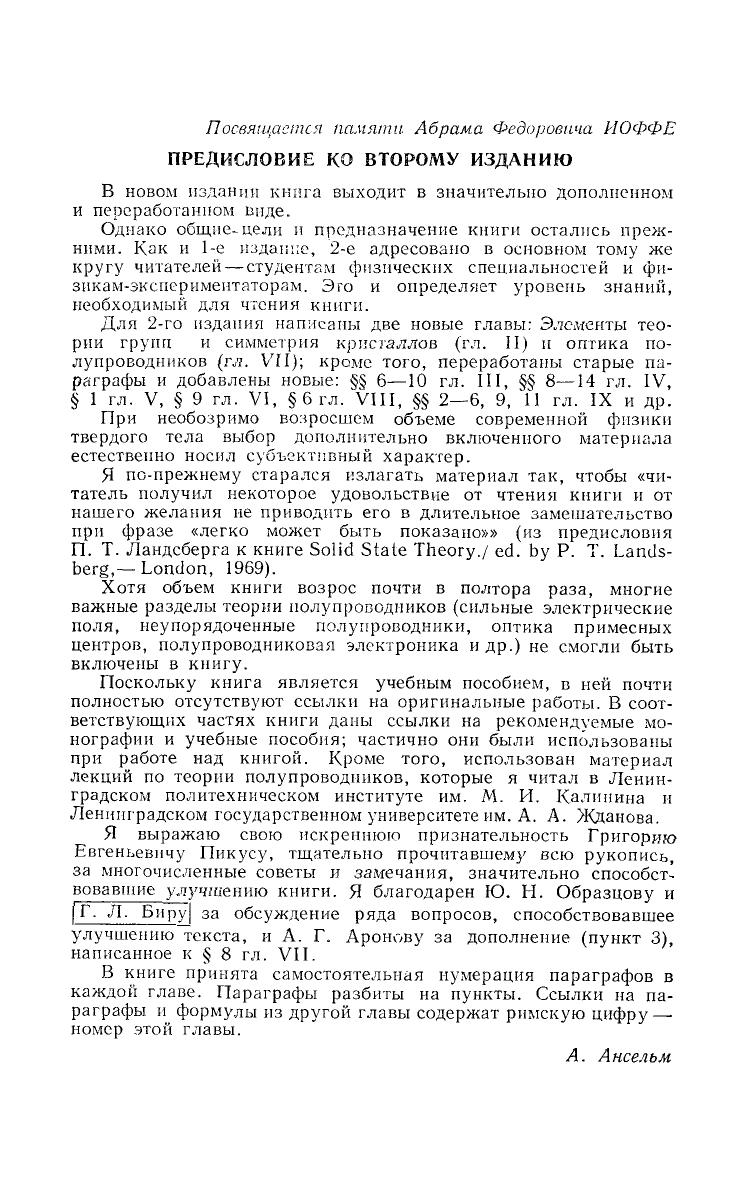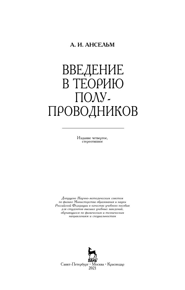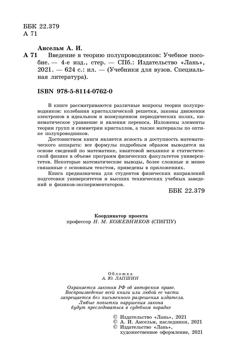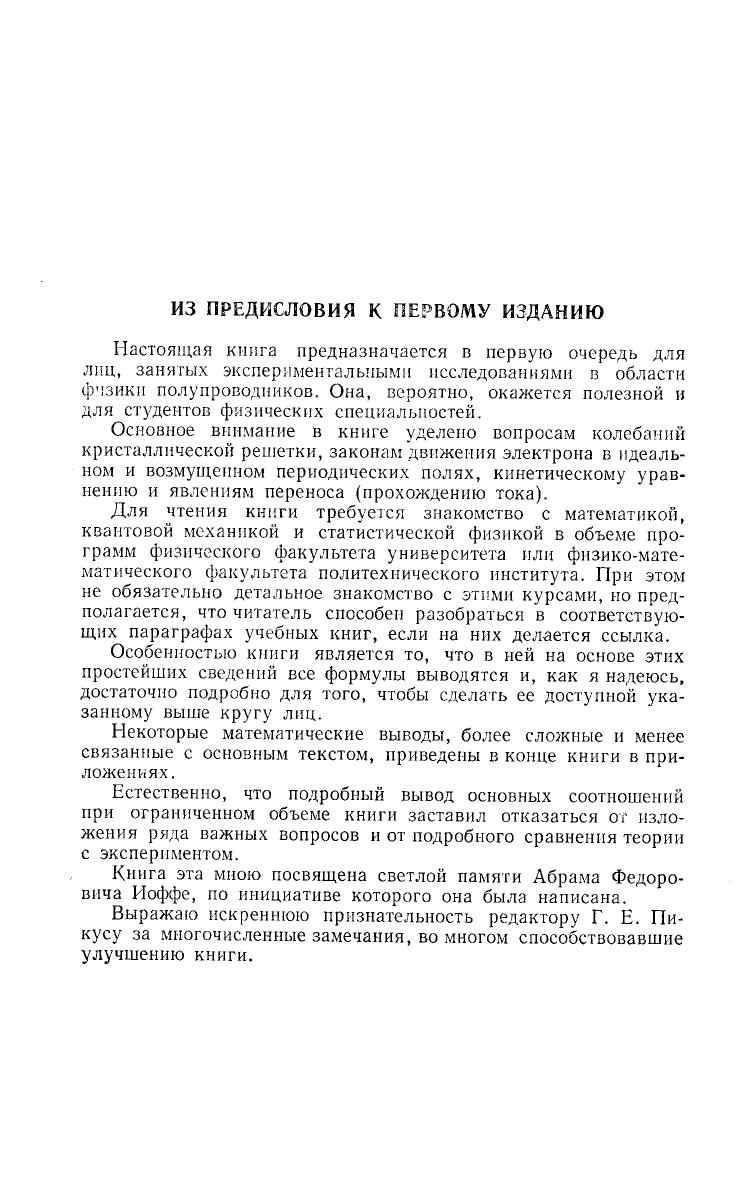 В книге рассматриваются различные вопросы теории полупроводников: колебания кристаллической решетки, законы движения электронов в идеальном и возмущенном периодических полях, кинематическое уравнение и явления переноса. Изложены элементы теории групп и симметрии кристаллов, а также материалы по оптике полупроводников. Достоинством книги является ясность и доступность математического аппарата: все формулы подробным образом выводятся на основе сведений по математике, квантовой механике и статистической физике в объеме программ физических факультетов университетов. Некоторые математические выводы, более сложные и менее связанные с основным текстом, приведены в приложениях. Книга предназначена для студентов физических специальностей университетов и высших технических учебных заведений и физиков-экспериментаторов.