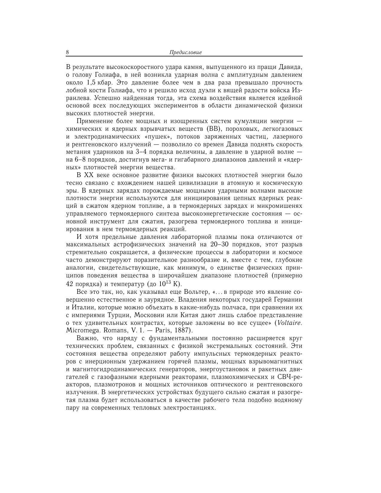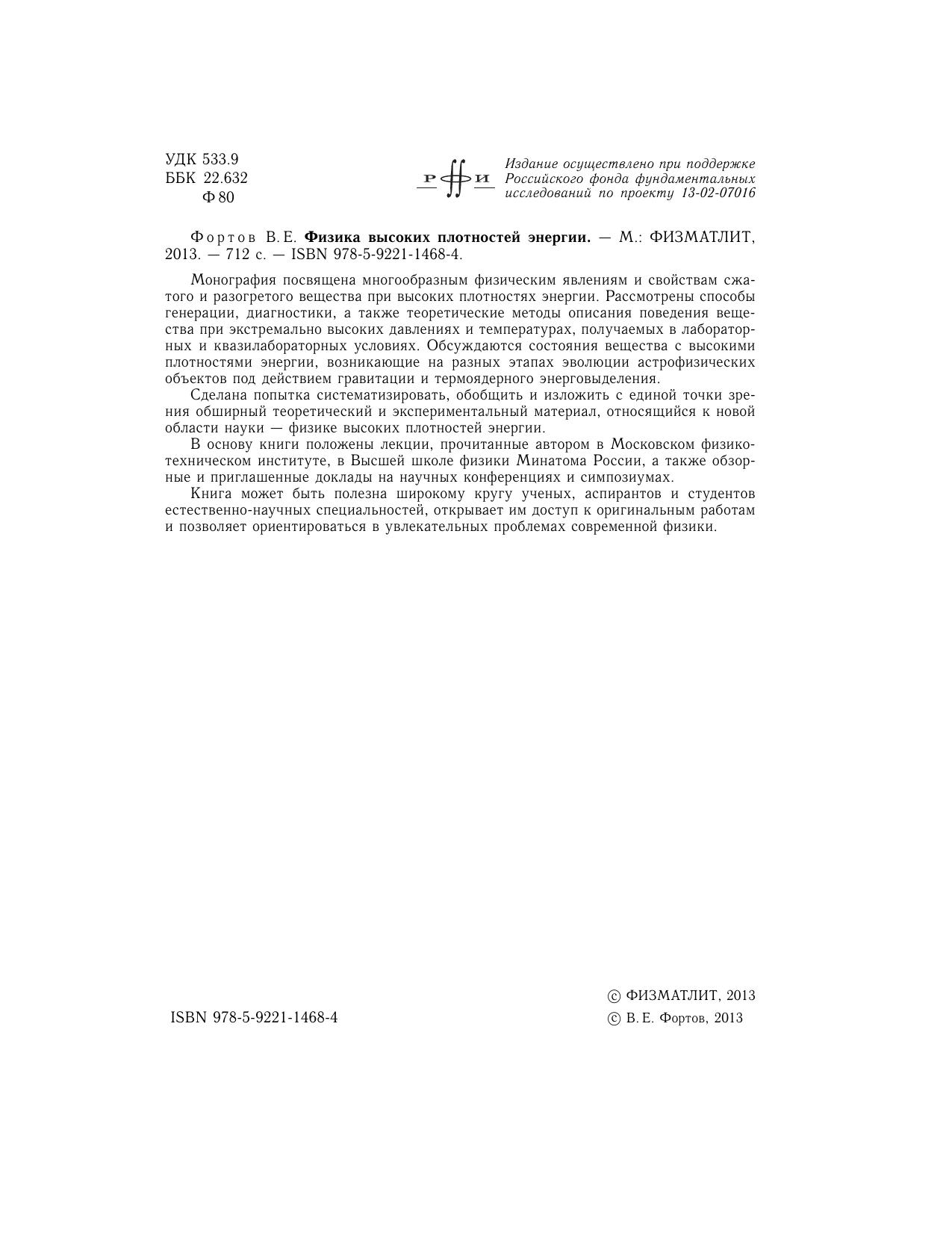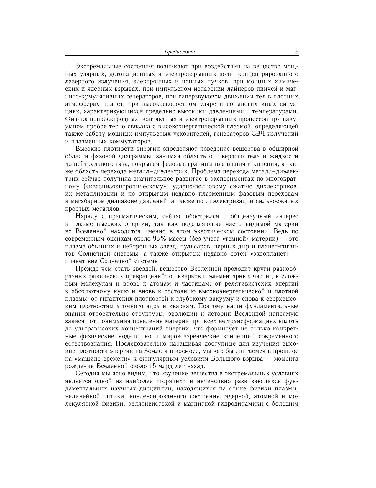 Монография посвящена многообразным физическим явлениям и свойствам сжатого и разогретого вещества при высоких плотностях энергии. Рассмотрены способы генерации, диагностики, а также теоретические методы описания поведения вещества при экстремально высоких давлениях и температурах, получаемых в лабораторных и квазилабораторных условиях. Обсуждаются состояния вещества с высокими плотностями энергии, возникающие на разных этапах эволюции астрофизическихобъектов под действием гравитации и термоядерного энерговыделения. Сделана попытка систематизировать, обобщить и изложить с единой точки зрения обширный теоретический и экспериментальный материал, относящийся к новой области науки — физике высоких плотностей энергии. В основу книги положены лекции, прочитанные автором в Московском физико-техническом институте, в Высшей школе физики Минатома России, а также обзорные и приглашенные доклады на научных конференциях и симпозиумах. Книга может быть полезна широкому кругу ученых, аспирантов и студентов естественно-научных специальностей, открывает им доступ к оригинальным работам и позволяет ориентироваться в увлекательных проблемах современной физики.