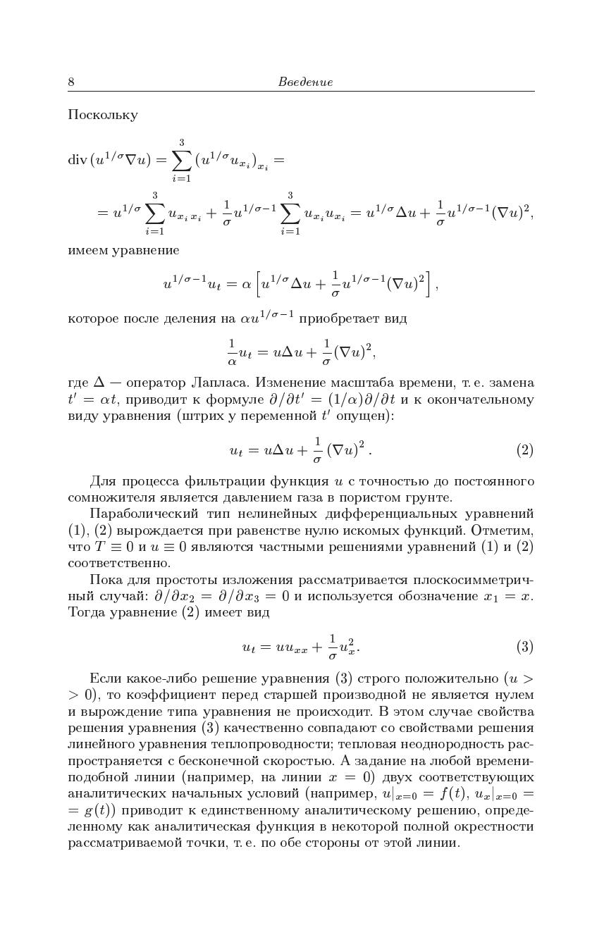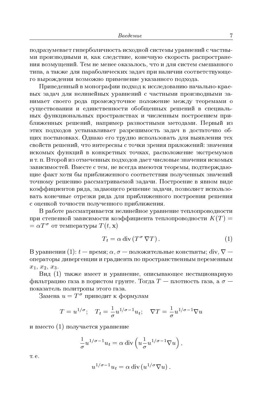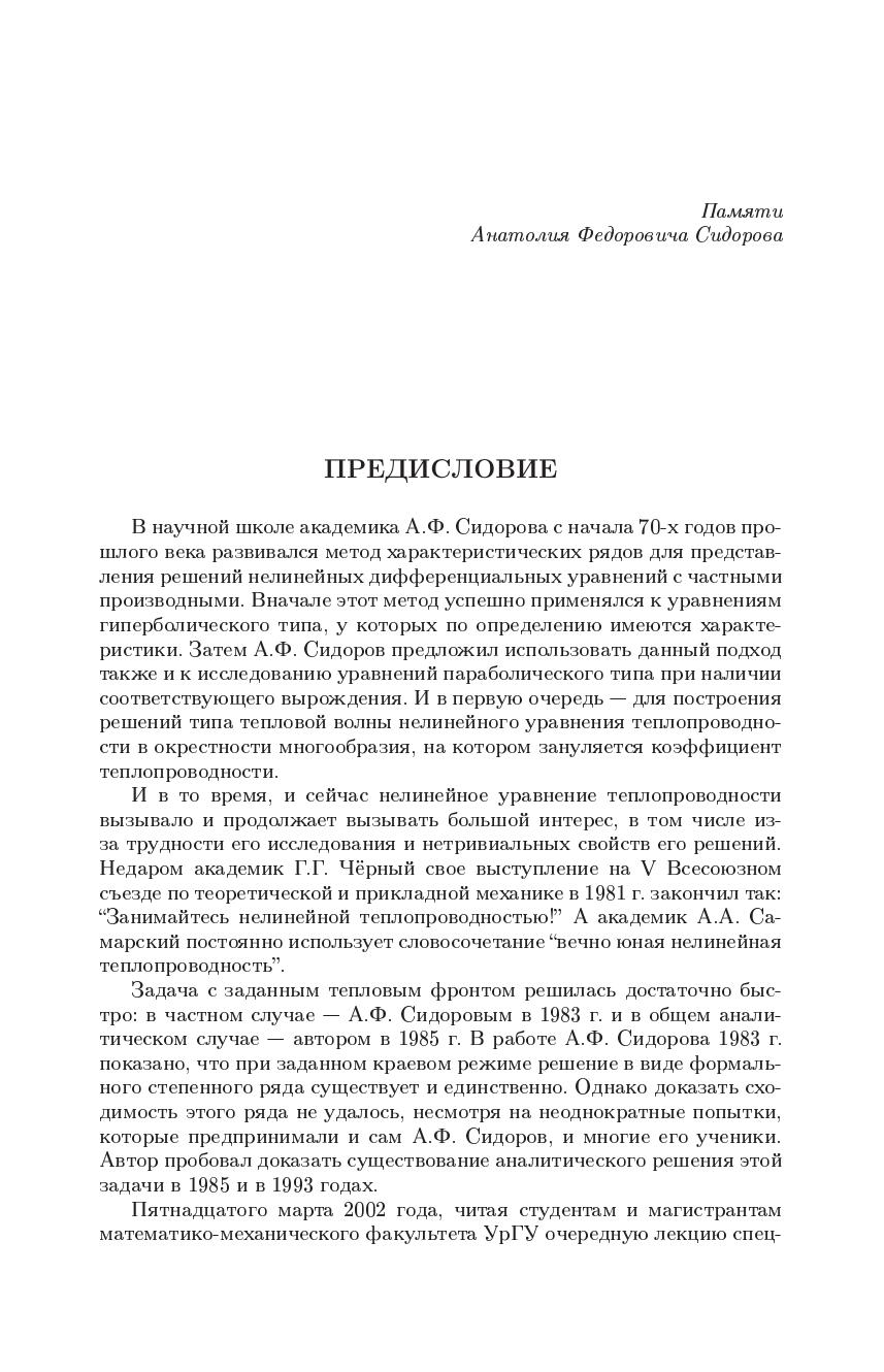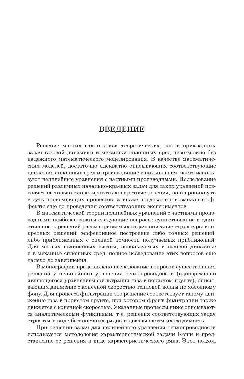 В монографии приведены доказательства теорем о существовании и единственности аналитических решений нелинейного уравнения теплопроводности (одновременно являющегося уравнением нестационарной фильтрации газа в пористом грунте), котоые описываю распространение тепловой волны с конечной скоростью по холодному фону. Рассмотрены две задачи: 1) тепловая волна определяется по ее заданному фронту 2) заданный краевой режим порождает тепловую волну. Для процесса фильтрации газа краевой режим задает давление в фиксированной точке пласта, от которой фронт фильтрации распростроняется с конечной скоростью.Книга преднзначена научным работникам, преподавателям, аспирантам и студентам, интересующимся нелинейными уравнениями с частыми производными и их приложениями в механике сплошной среды.