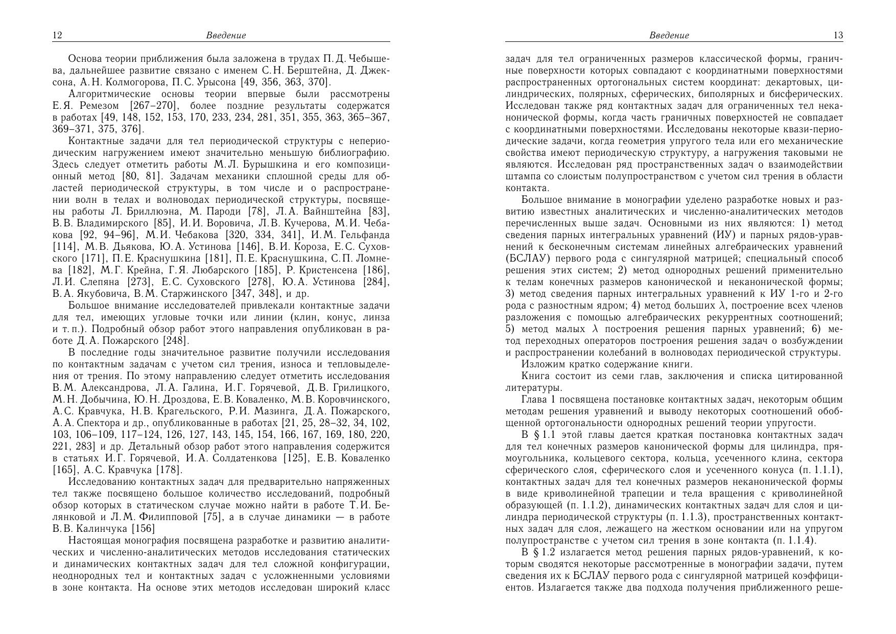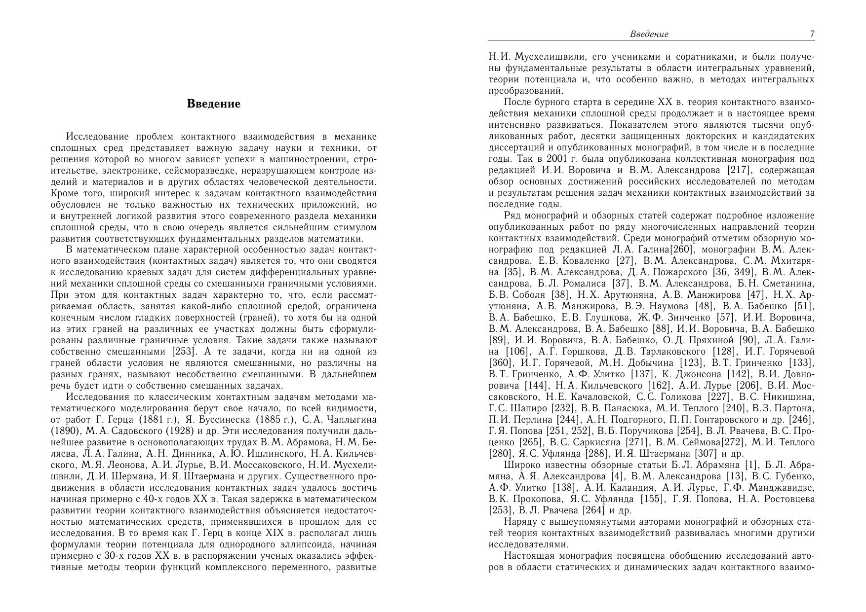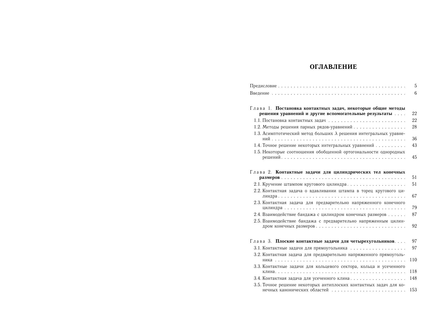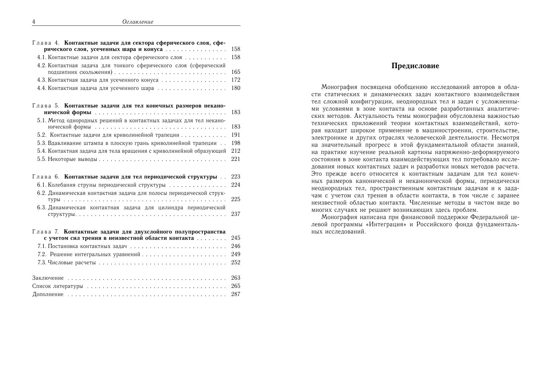 Излагаются аналитические методы и результаты решения большого круга неклассических задач механики контактных взаимодействий упругих тел. Рассмотрены статические и динамические контактные задачи теории упругости для тел сложной конфигурации, неоднородных тел и контактные задачи с усложненными условиями в зоне контакта. Для решения указанных задач разработаны эффективные аналитические методы решения парных рядов-уравнений, интегральных уравнений и бесконечных систем линейных алгебраических уравнений. Получен ряд качественно новых и важных результатов, касающихся зависимости контактных напряжений, жесткости системы штамп--упругое тело, размеров области контакта и деформации свободной поверхности от параметров задач. Практическая значимость результатов связана с возможностью использования их для создания методик расчетов контакта элементов конструкций и деталей в машиностроении, строительстве иэлектронной промышленности с учетом различных факторов, а также для тестирования пакетов программ, реализующих прямые численные методы. Приведенные методы найдут применение также в механике разрушения, гидроаэромеханике, электростатике, термодинамике и теории диффузии, радиофизике и акустике. Для специалистов в области механики контактных взаимодействий, механики сплошных сред и математической физики, инженеров, а также аспирантов и студентов механико-математических и физических факультетов университетов.