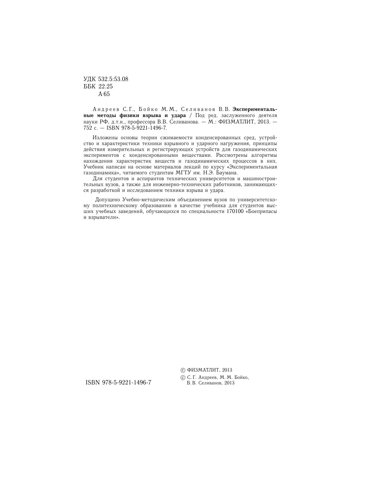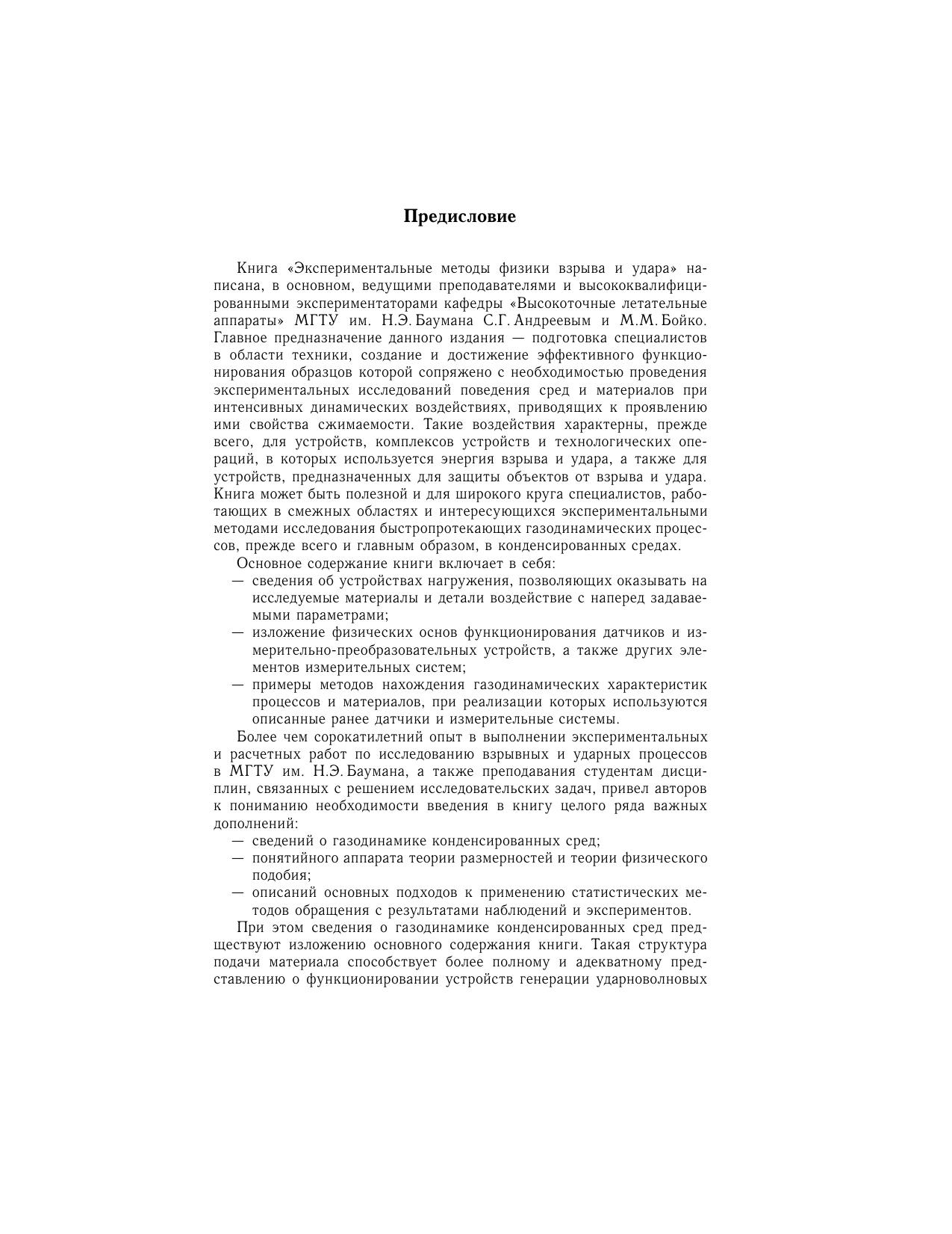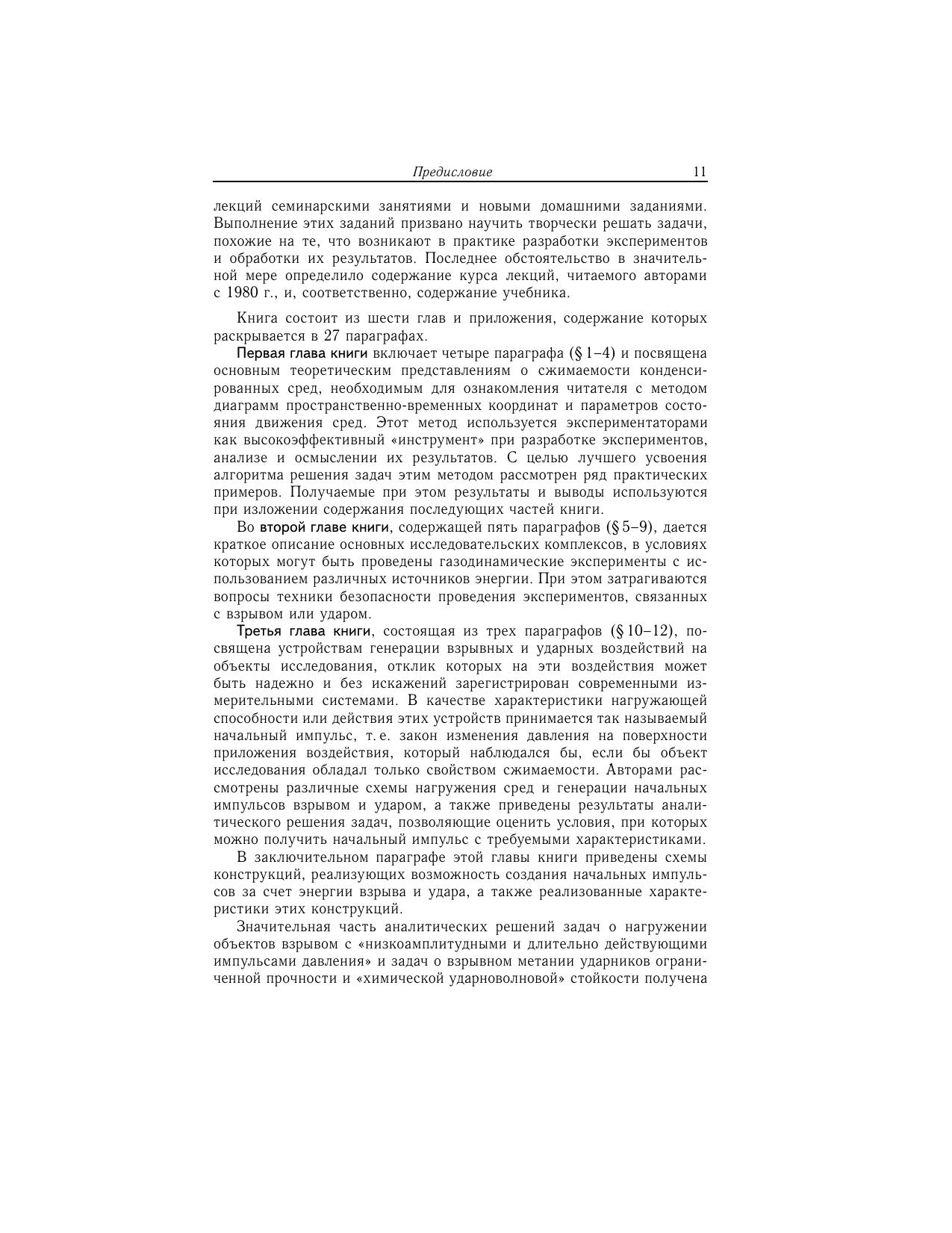 Изложены основы теории сжимаемости конденсированных сред, устройство и характеристики техники взрывного и ударного нагружения, принципы действия измерительных и регистрирующих устройств для газодинамических экспериментов с конденсированными веществами. Рассмотрены алгоритмы нахождения характеристик веществ и газодинамических процессов в них. Учебник написан на основе материалов лекций по курсу «Экспериментальная газодинамика», читаемого студентам МГТУ им. Н.Э. Баумана. Для студентов и аспирантов технических университетов и машиностроительных вузов, а также для инженерно-технических работников, занимающихся разработкой и исследованием техники взрыва и удара.