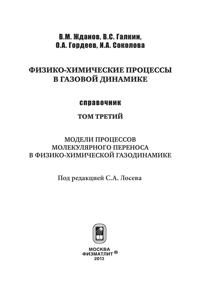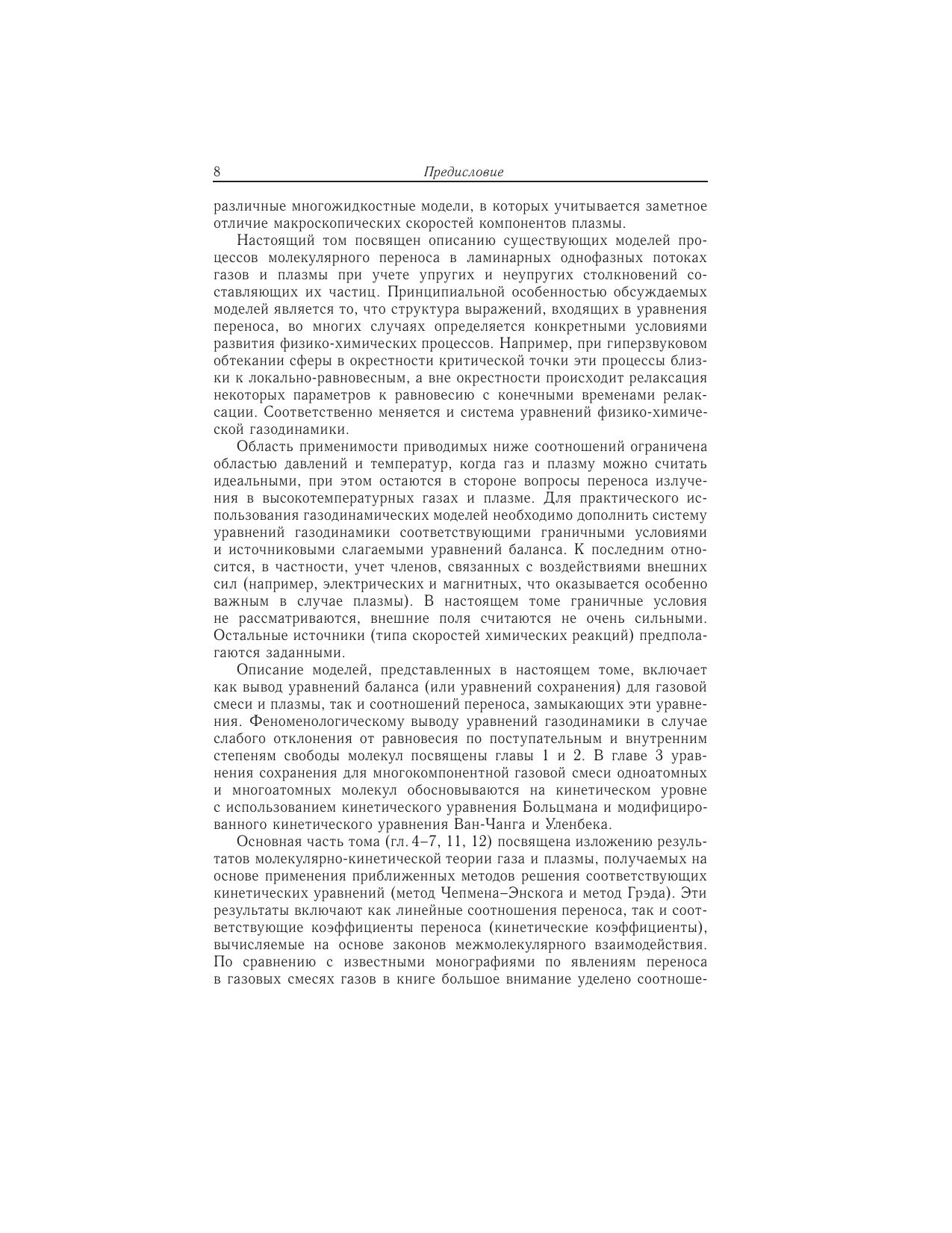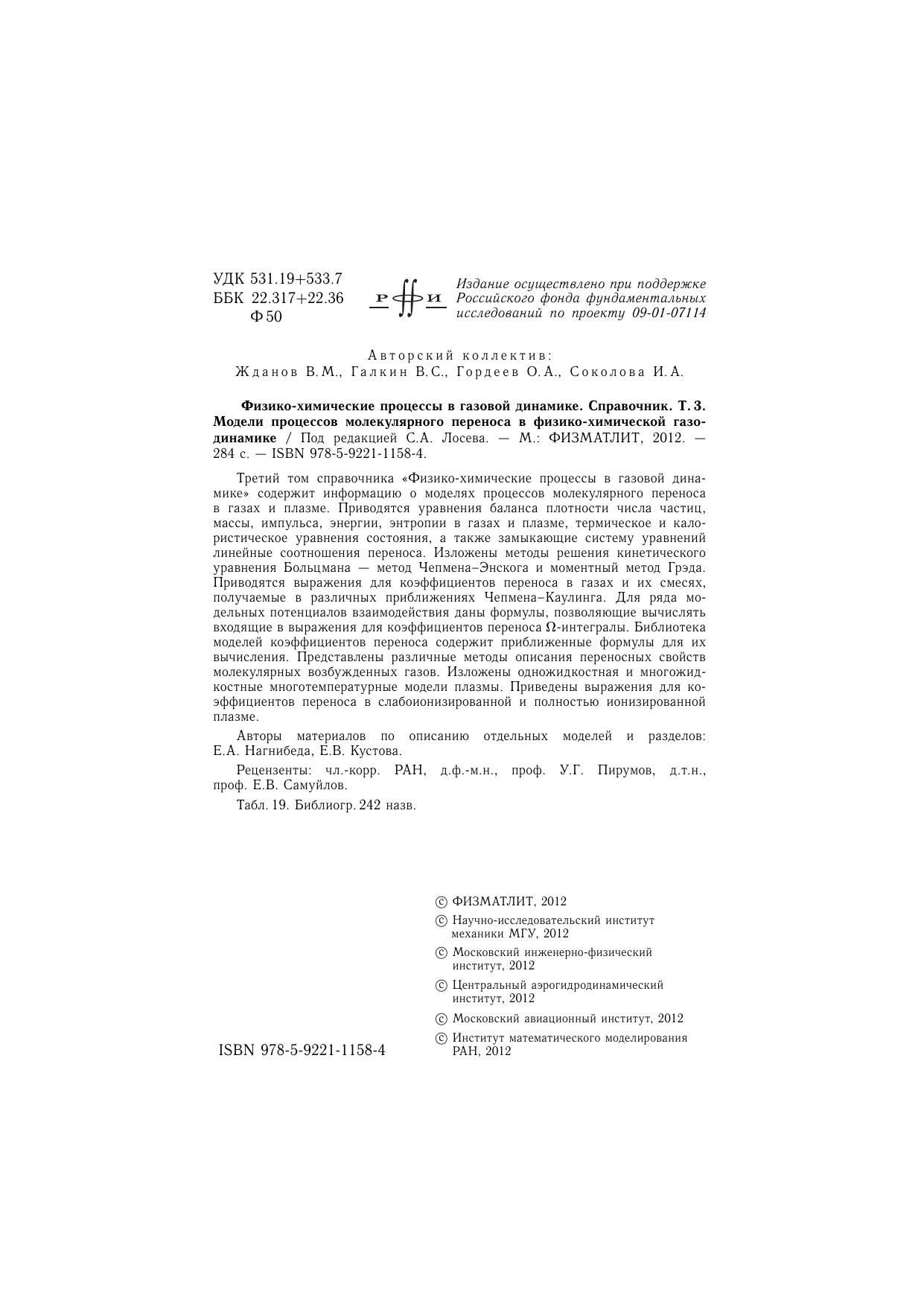 Третий том справочника «Физико-химические процессы в газовой динамике» содержит информацию о моделях процессов молекулярного переноса в газах и плазме. Приводяться уравнения баланса плотности числа частиц, массы, импульса, энергии, энтропии в газах и плазме, термическое и калористическое уравнения состояния, а также замыкающие систему уравненний линейные соотношения переноса. Изложены методы решения кинетического уравнения Больцмана - метод Чепмена-Энскога и моментный метод Грэда. Приводятся выражения для коэффициентов перенноса в газах и их смесях, получаемые в различных приближениях Чепмена-Каулинга. Для ряда модельных потенциалов взаимодействия даны формулы, позволяющие вычислять входящие в выражения для коэффициентов переноса Omega-интегралы. Библиотека моделей коэффициентов переноса содержит приближеннные формулы для их вычисления. Представлены различные методы описания переносных свойств молекулярных возбужденных газов. Изложены одножидкостная и многожидкостные многотемпературные модели плазмы. Приведены выражения для коэффициентов переноса в слабоионизированной и полностью ионизированной плазме.