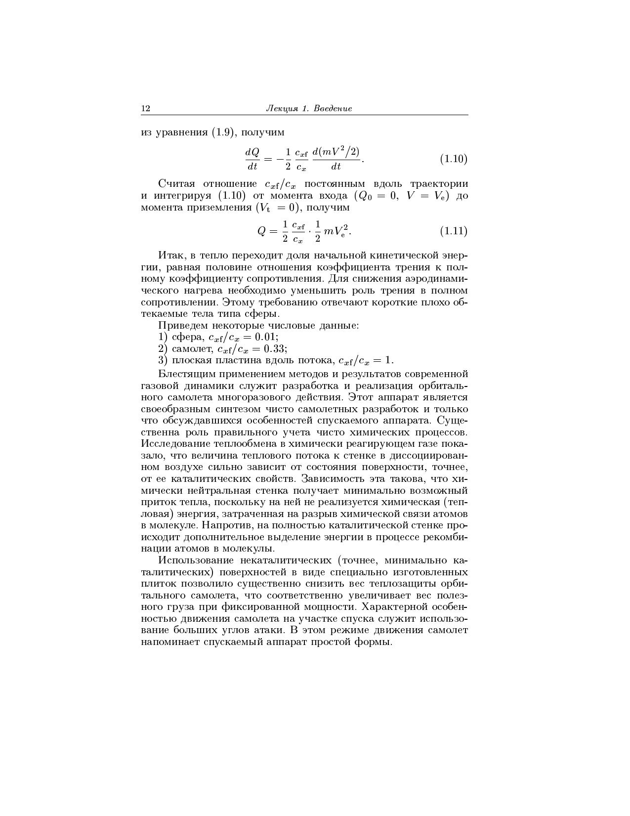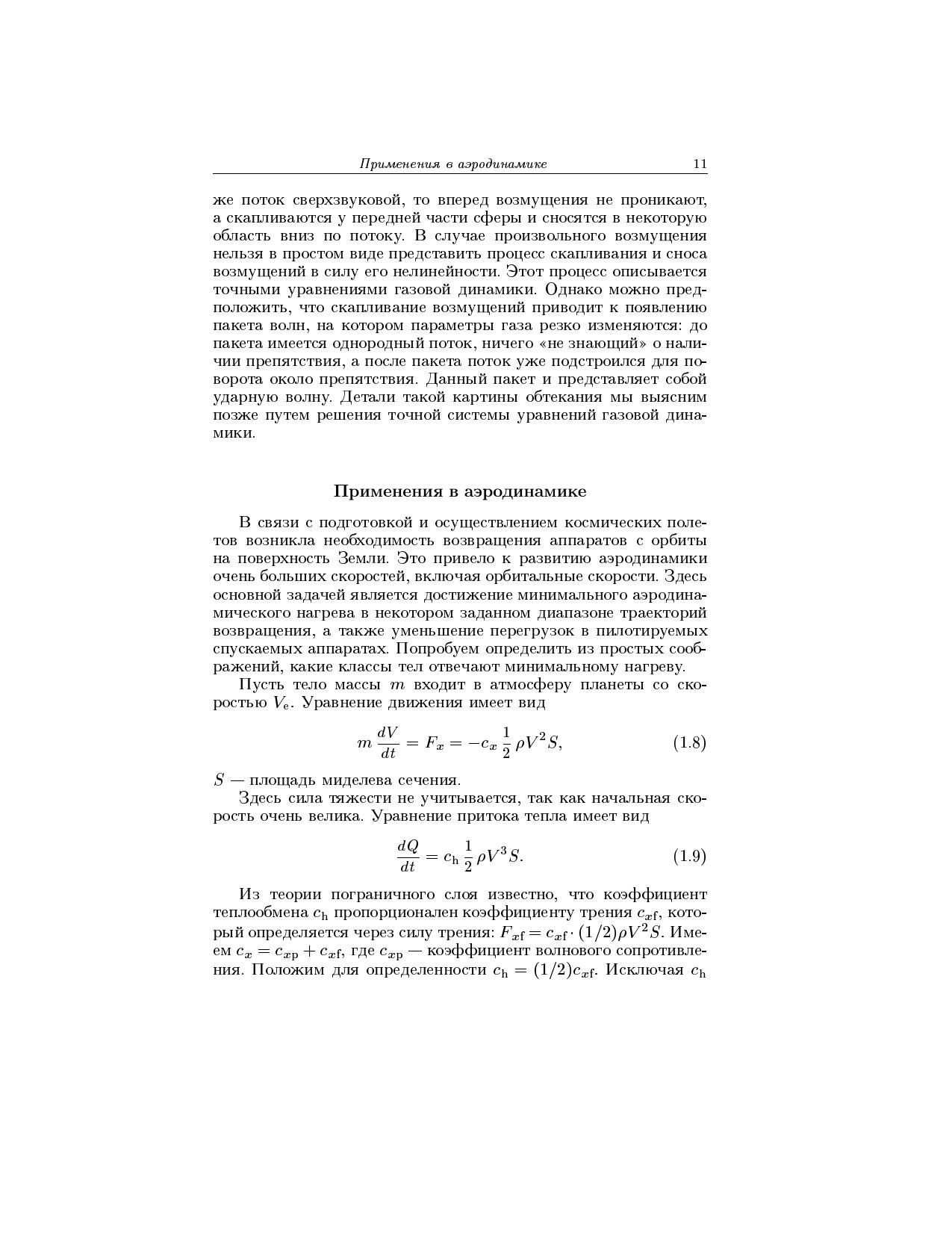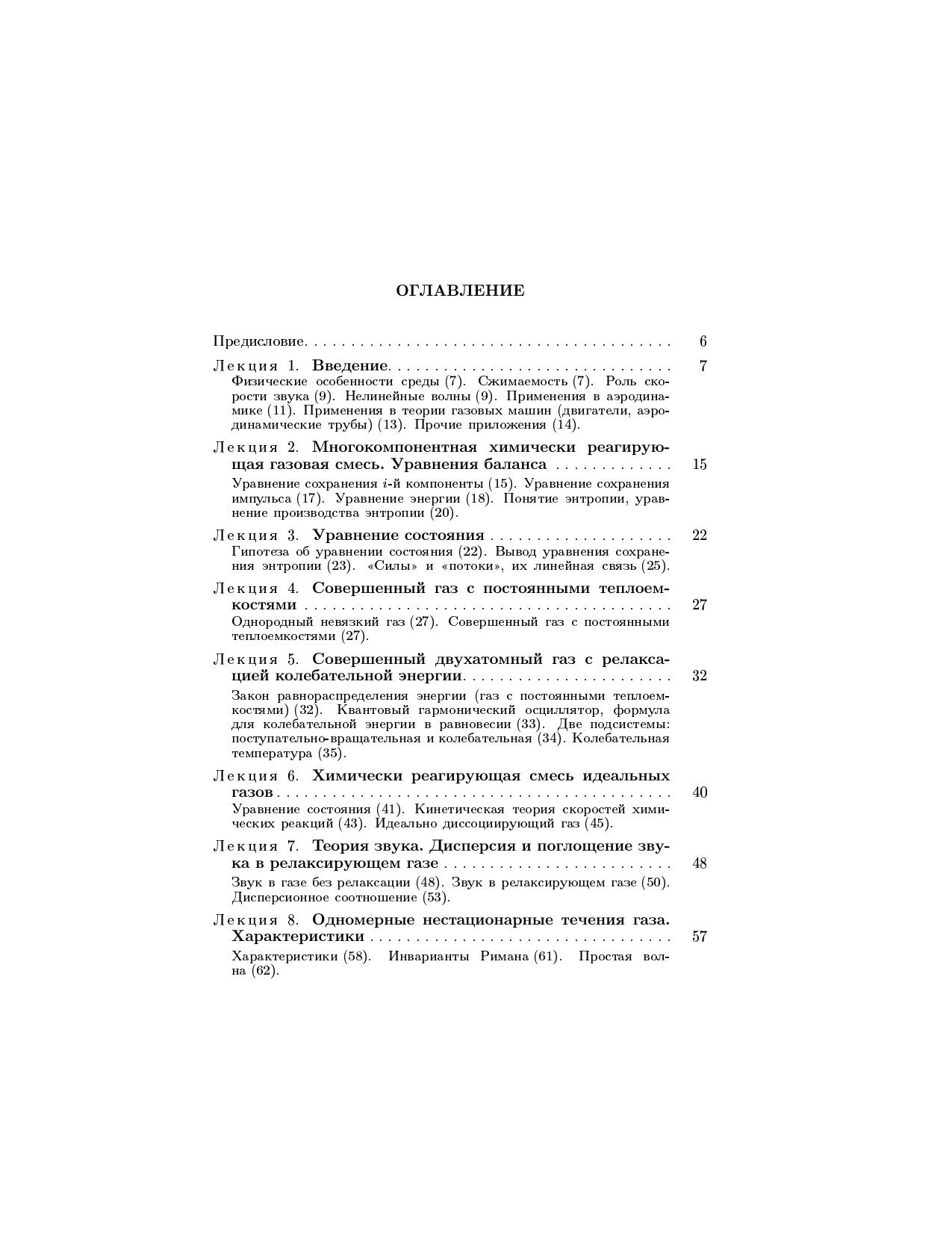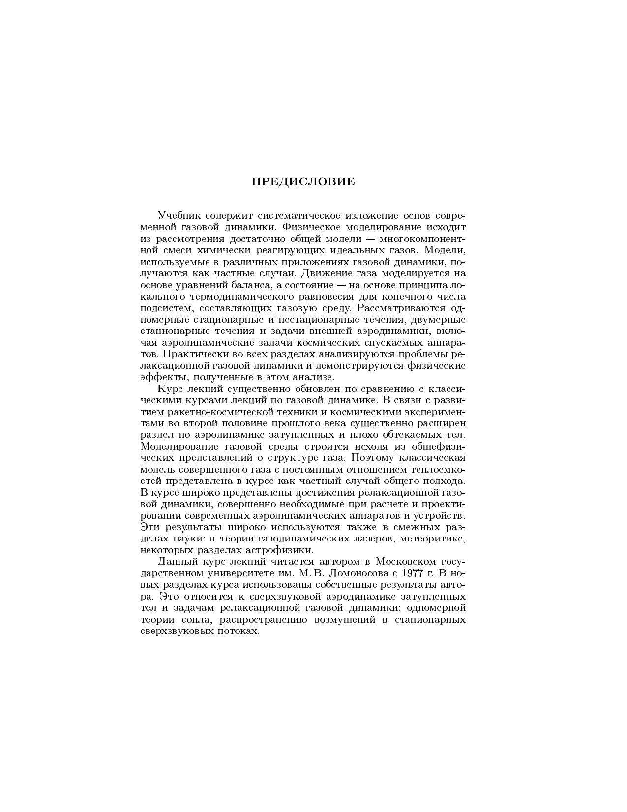 Книга содержит систематическое изложение основных вопросов современной газовой динамики. Математическое моделирование газодинамических процессов строится на базе двух независимых блоков, включающих уравнения баланса и уравнения состояния. Блок уравнений состояния формулируется на основе гипотезы о локальном термодинамическом равновесии. Рассматриваются три основные модели газовой среды: совершенный газ с постоянными теплоемкостями двухатомный газ с релаксацией колебательной энергии молекул химически реагирующая смесь идеальных газов. Для студентов и аспирантов университетов, обучающихся по специальности <<Механика>>, студентов технических вузов аэромеханического профиля, а также для астрономов и геофизиков.