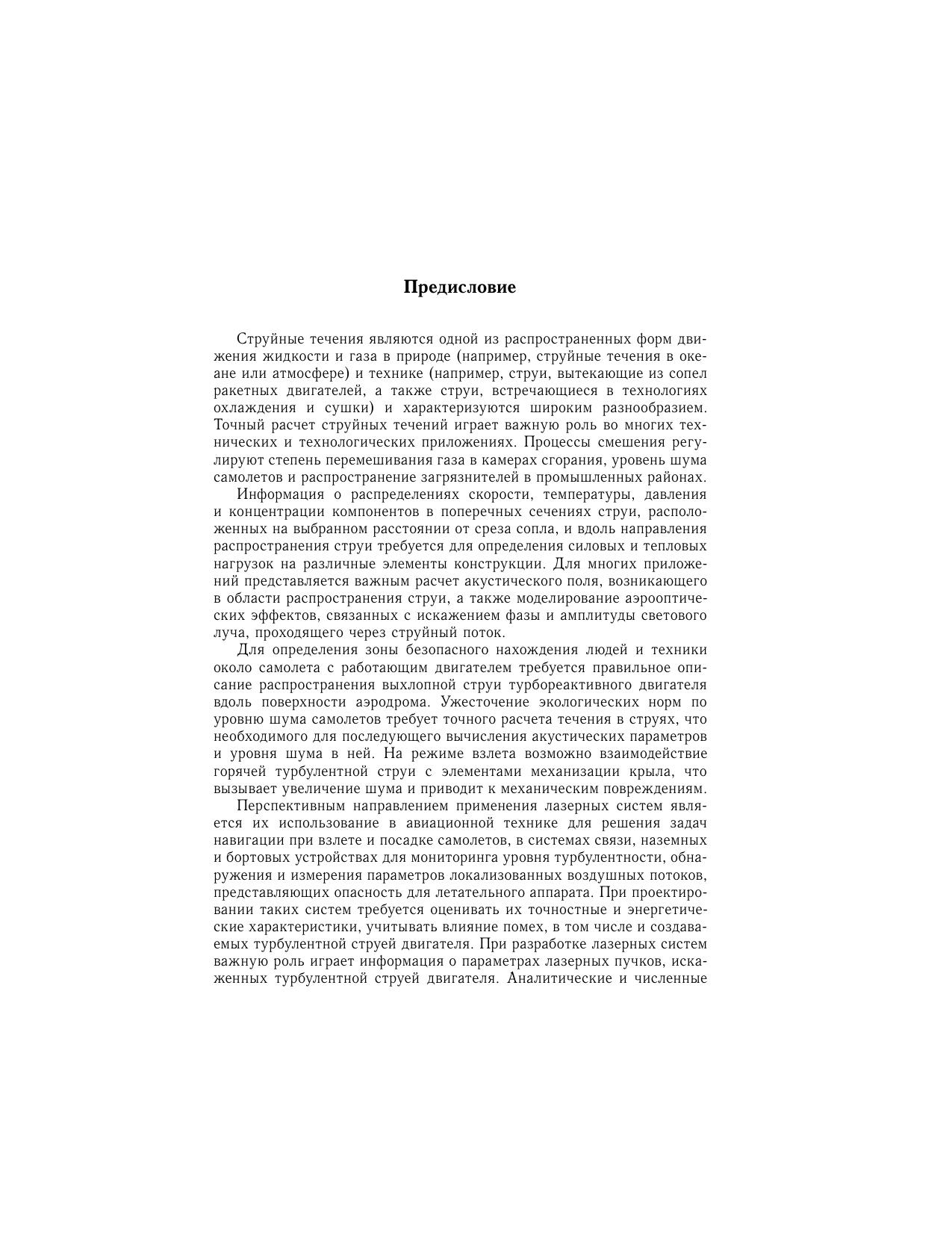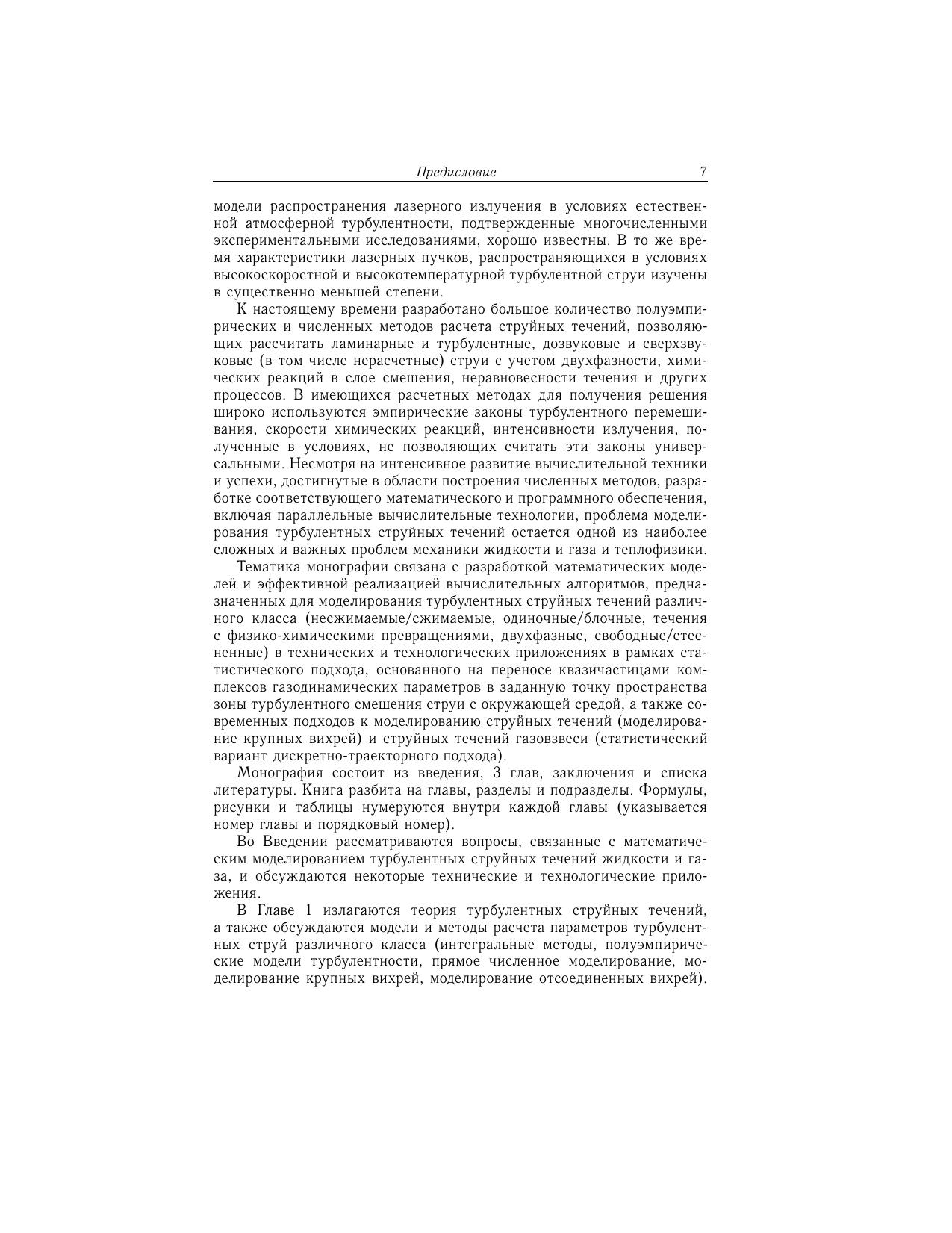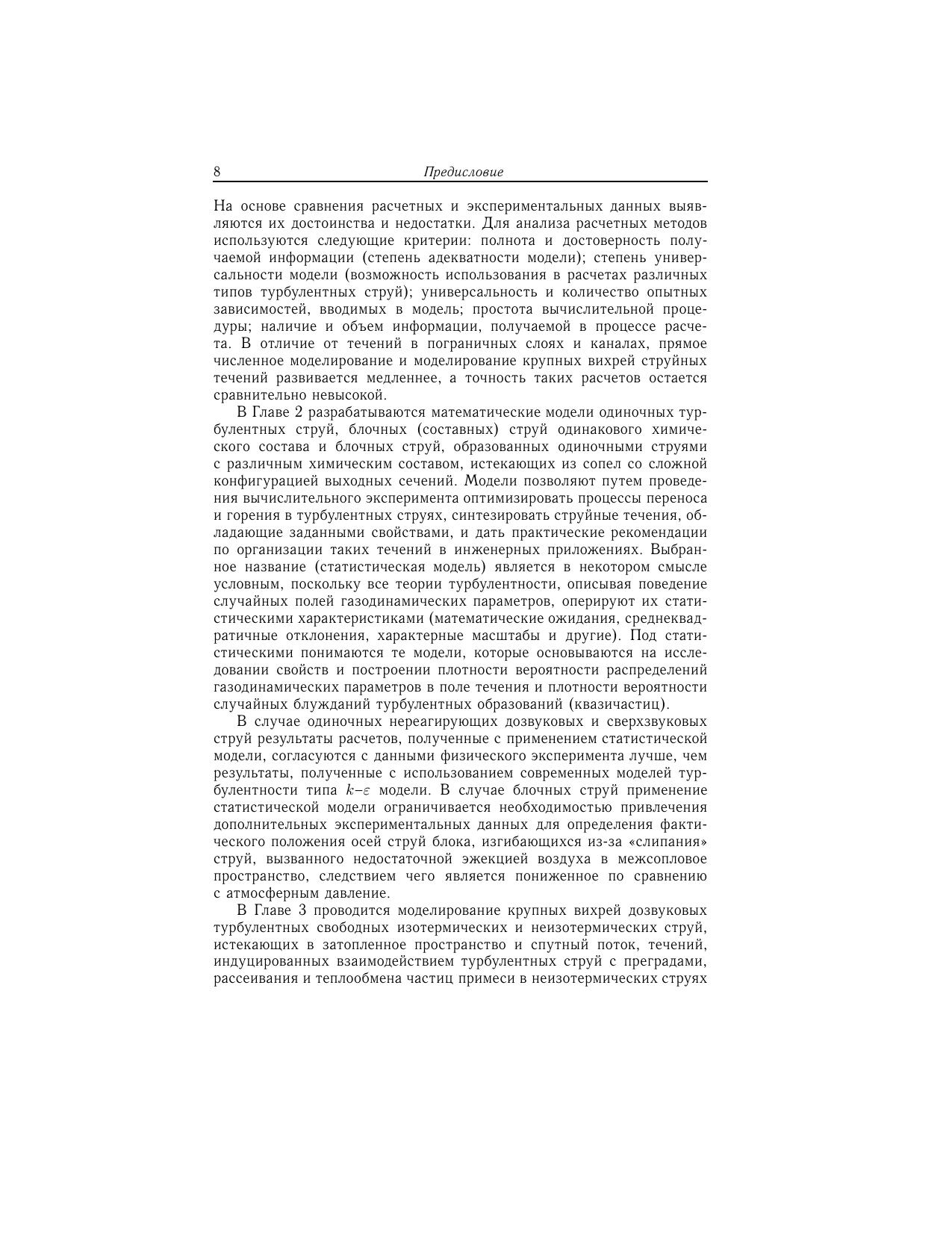 Обобщается опыт моделирования турбулентных струйных течений на основе подходов различной степени сложности: статистические модели, основанные на представлении о переносе квазичастицами комплексов газодинамических параметров в заданную точку пространства зоны турбулентного смешения струи с окружающей средой модели, основанные на решении осредненных по Рейнольдсу уравнений Навье–Стокса современные подходы к моделированию турбулентных течений, такие как моделирование крупных вихрей. Разработанные модели позволяют путем проведения вычислительного эксперимента оптимизировать процессы переноса и горения в турбулентных струях, синтезировать струйные течения, обладающие заданными свойствами, а также дать практические рекомендации по организации струйных течений в технических и технологических приложениях. Монография предназначена научным работникам, специализирующимся в области вычислительной газодинамики струйных течений, инженерно-техническим работникам, занимающимся проектированием устройств и процессов, ориентированных на струйные технологии, а также аспирантам и магистрантам соответствующих направлений подготовки.