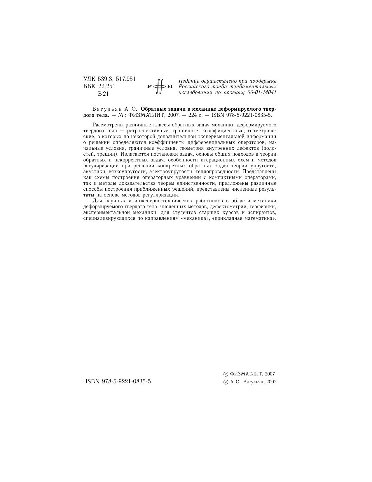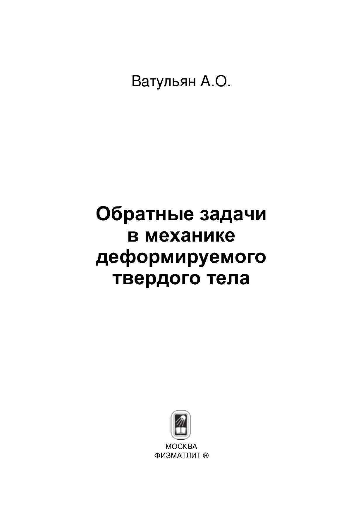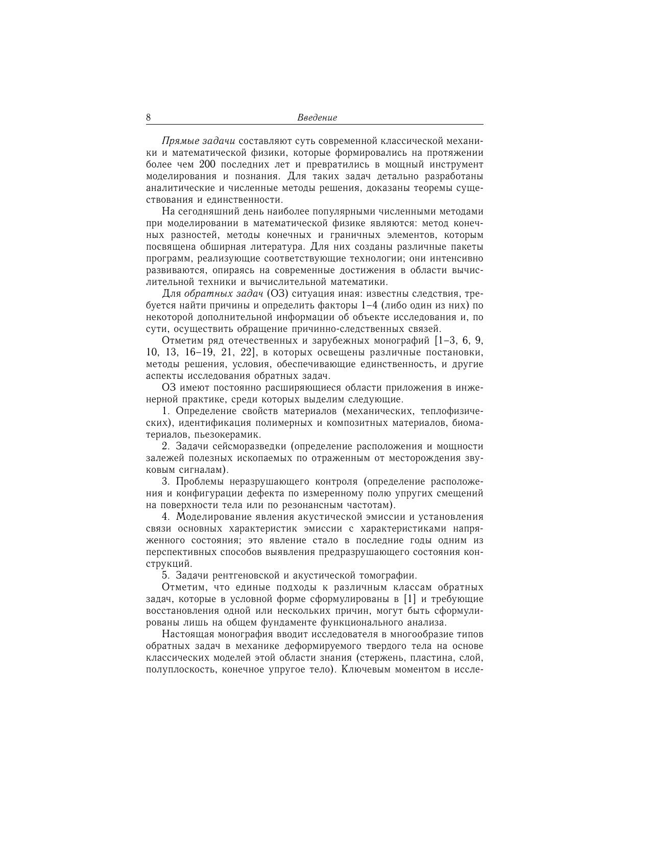 Рассмотрены различные классы обратных задач механики деформируемого твердого тела - ретроспективные, граничные, коэффициентные, геометрические, в которых по некоторой дополнительной экспериментальной информации о решении определяются коэффициенты дифференциальных операторов, начальные условия, граничные условия, геометрия внутренних дефектов (полостей, трещин). Излагаются постановки задач, основы общих подходов в теории обратных и некорректных задач, особенности итерационных схем и методов регуляризации при решении конкретных обратных задач теории упругости, акустики, вязкоупругости, электроупругости, теплопроводности. Представлены как схемы построения операторных уравнений с компактными операторами, так и методы доказательства теорем единственности, предложены различные способы построения приближенных решений, представлены численные результаты на основе методов регуляризации. Для научных и инженерно-технических работников в области механики деформируемого твердого тела, численных методов, дефектометрии, геофизики, экспериментальной механики, для студентов старших курсов и аспирантов, специализирующихся по направлениям «механика», «прикладная математика».