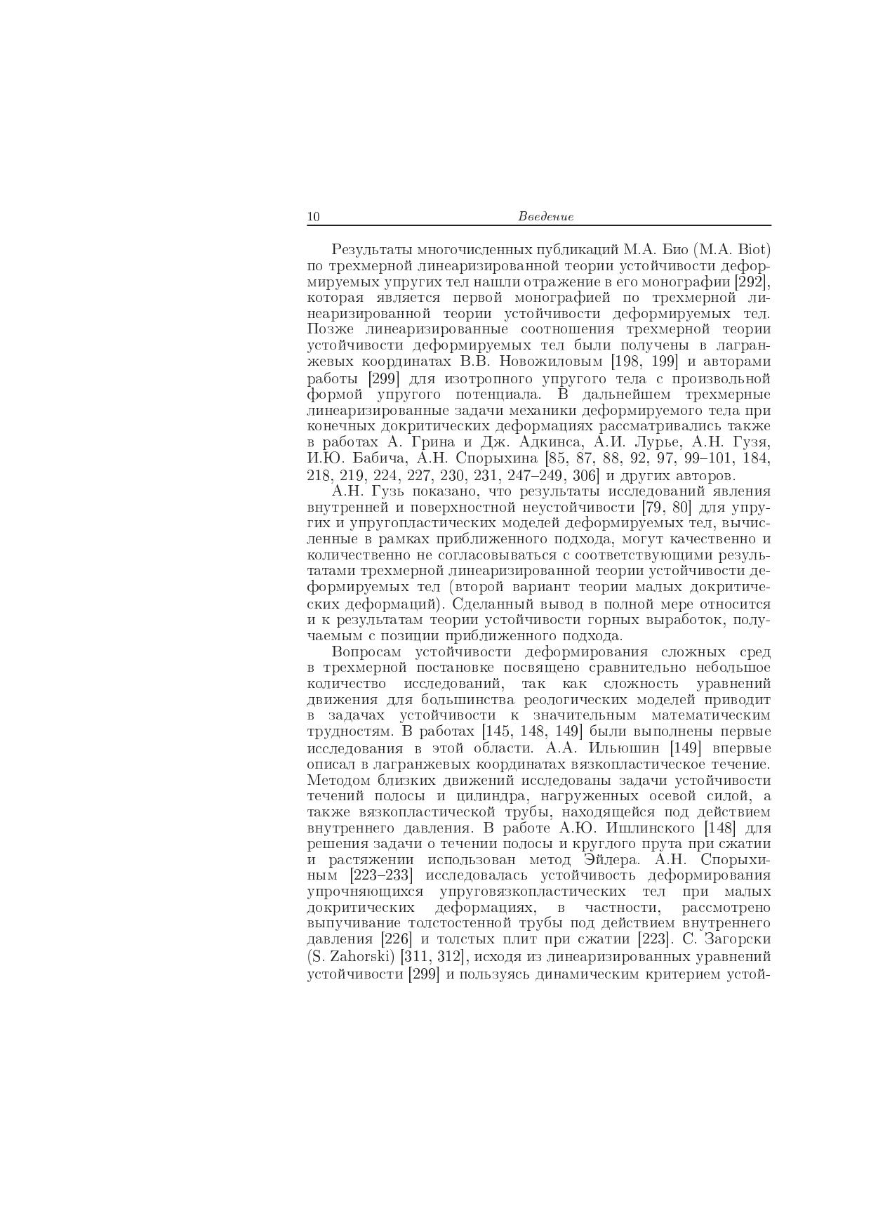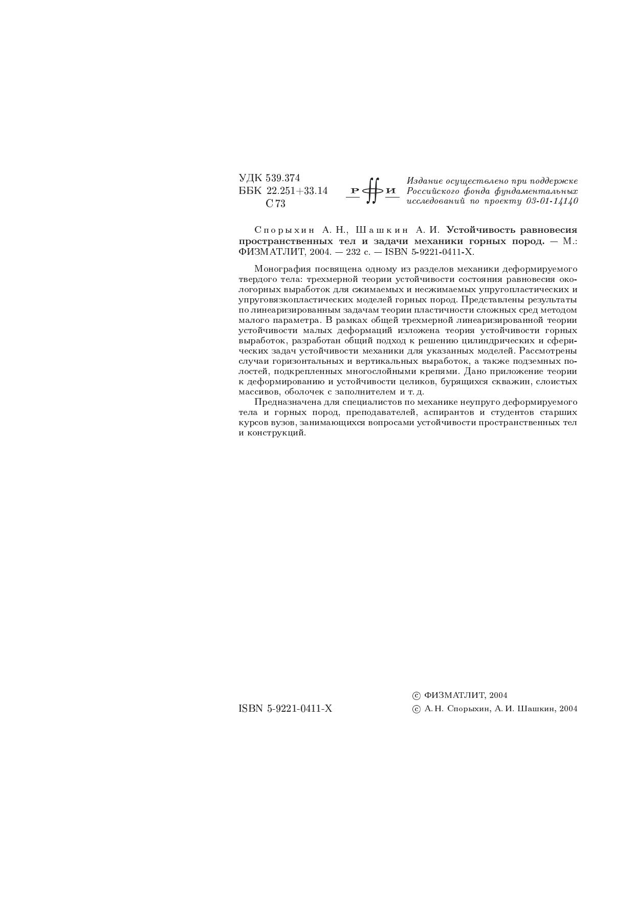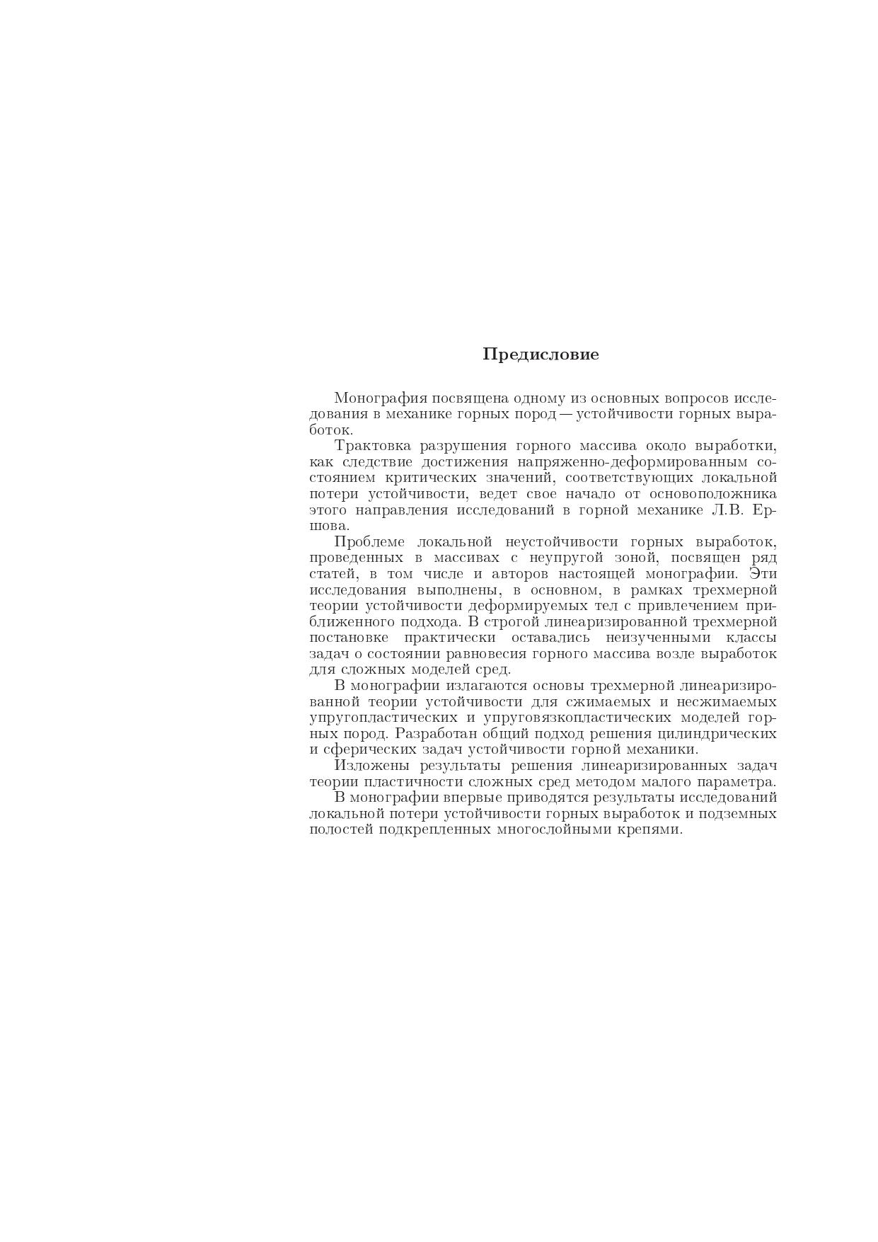 Монография посвящена одному из разделов механики деформируемого твердого тела: трехмерной теории устойчивости состояния равновесия окологорных выработок для сжимаемых и несжимаемых упругопластических и упруговязкопластических моделей горных пород. Представлены результаты по линеаризированным задачам теории пластичности сложных сред методом малого параметра. В рамках общей трехмерной линеаризированной теории устойчивости малых деформаций изложена теория устойчивости горных выработок, разработан общий подход к решению цилиндрических и сферических задач устойчивости механики для указанных моделей. Рассмотрены случаи горизонтальных и вертикальных выработок, а также подземных полостей, подкрепленных многослойными крепями. Дано приложение теории к деформированию и устойчивости целиков, бурящихся скважин, слоистых массивов, оболочек с заполнителем и т.д. Предназначена для специалистов по механике неупруго деформируемого тела и горных пород, преподавателей, аспирантов и студентов старших курсов вузов, занимающихся вопросами устойчивости пространственных тел и конструкций.