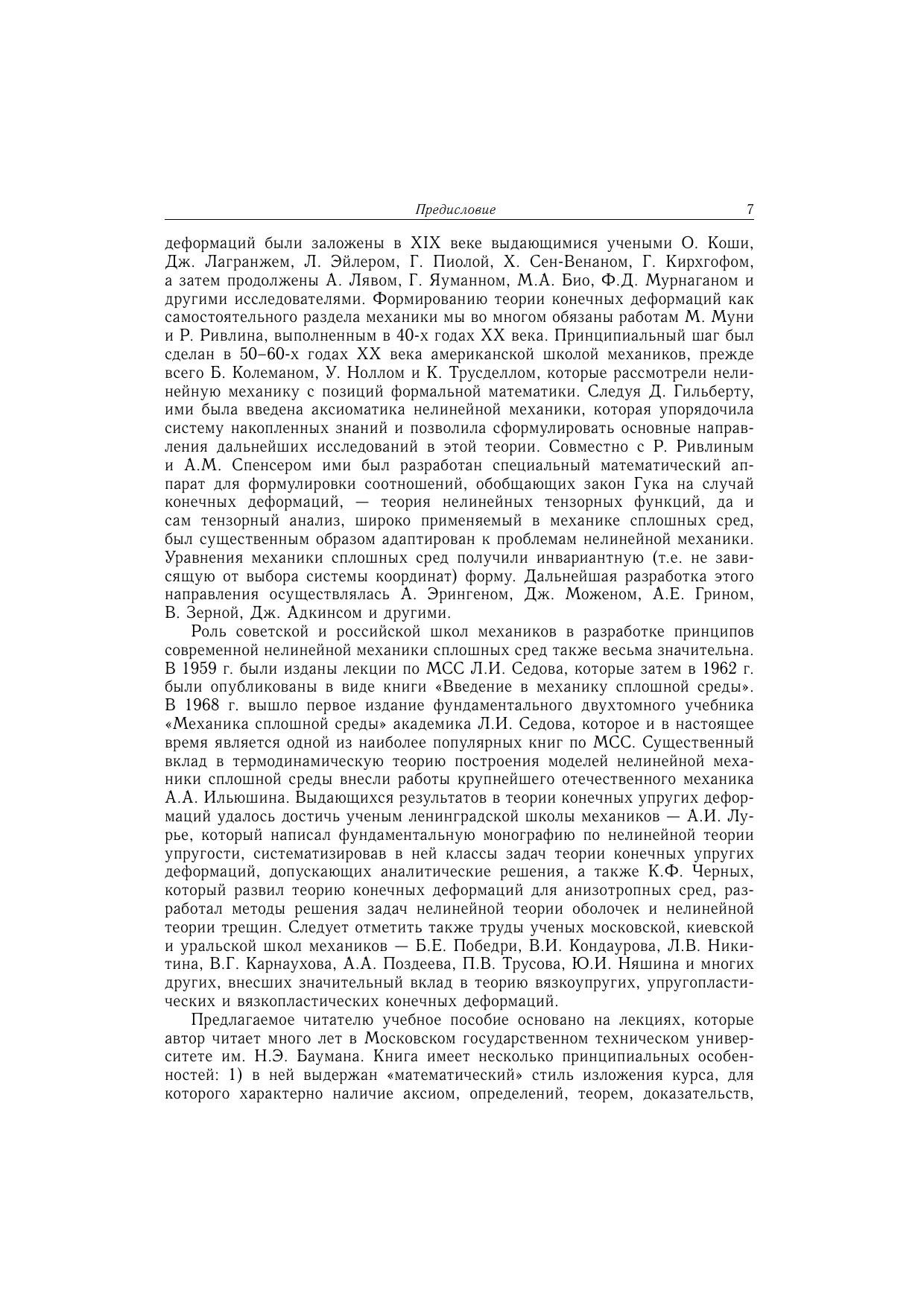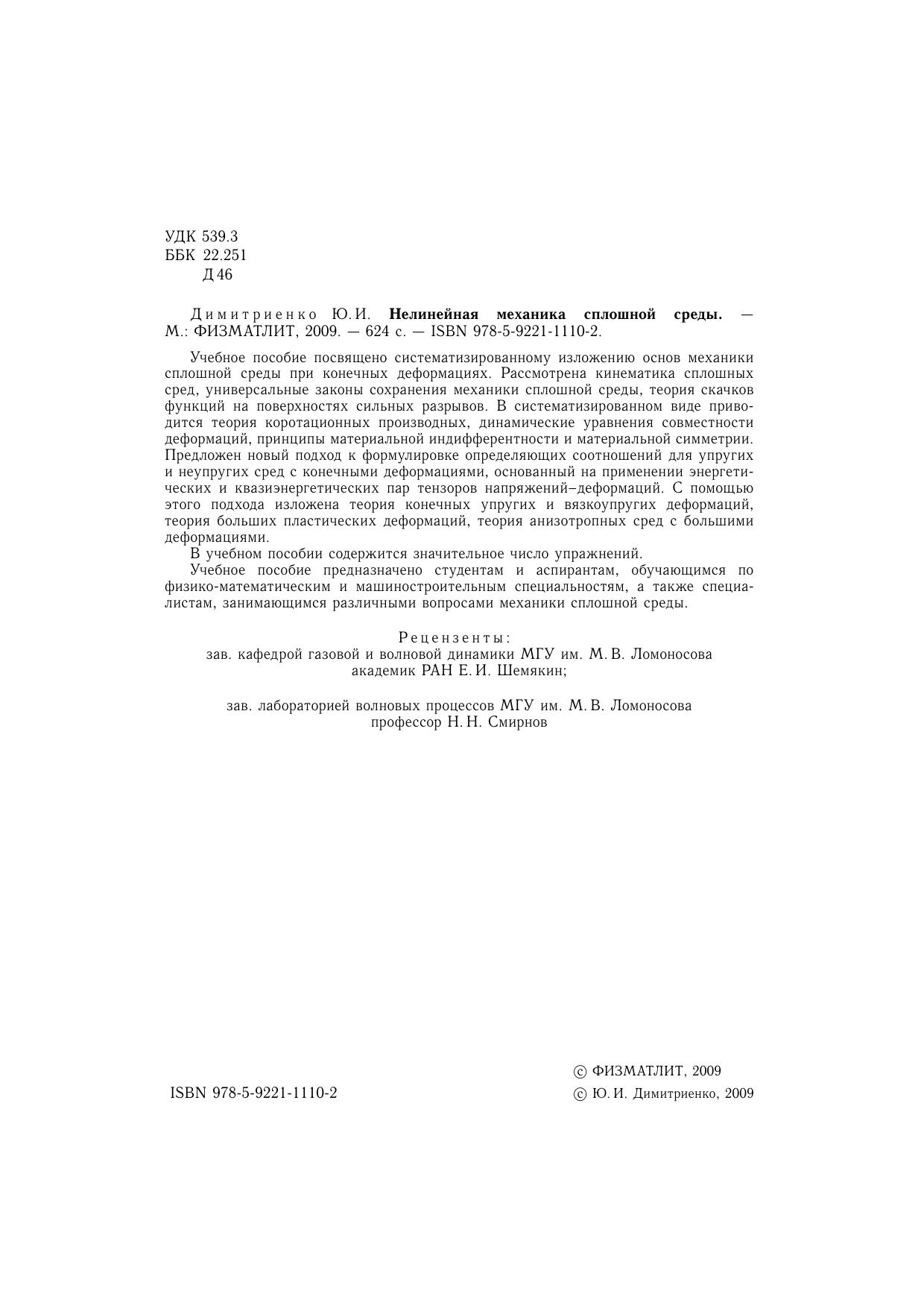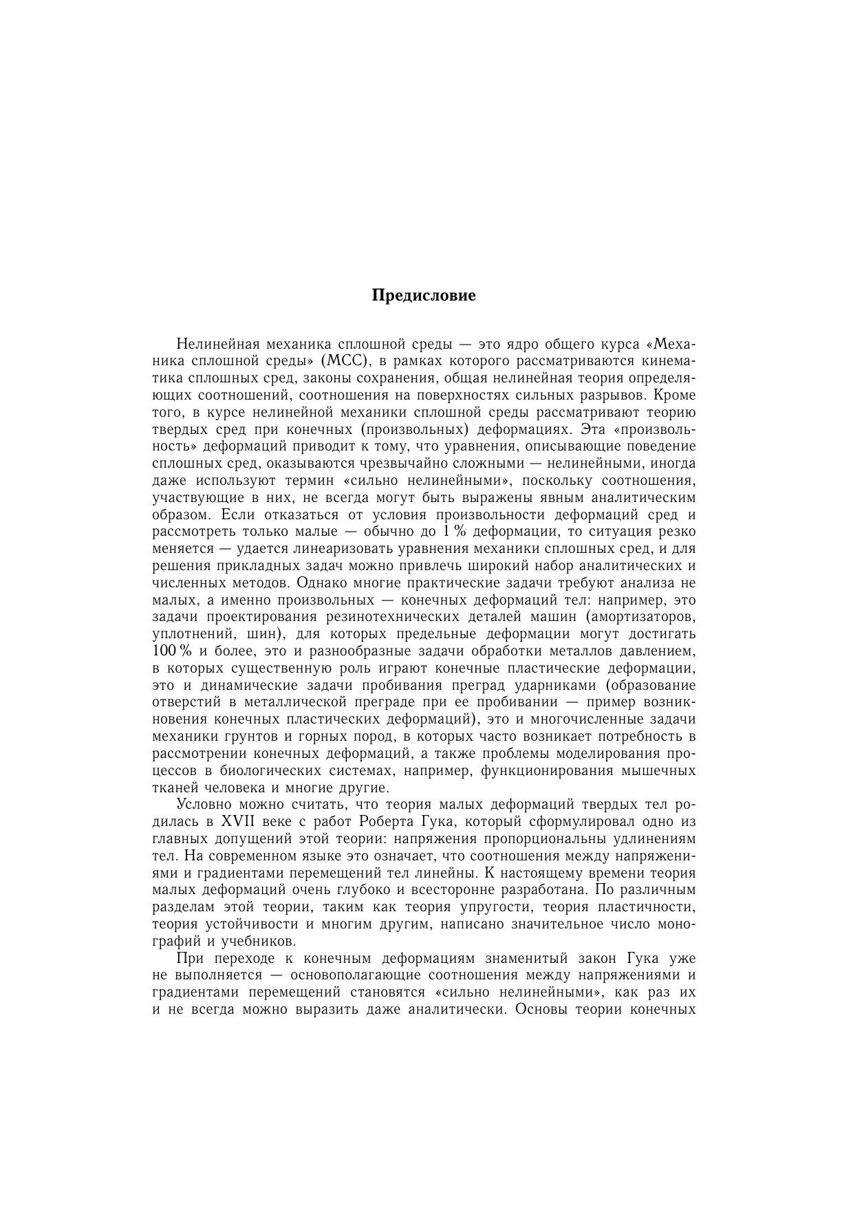 Учебное пособие посвящено систематизированному изложению основ механики сплошной среды при конечных деформациях. Рассмотрена кинематика сплошных сред, универсальные законы сохранения механики сплошной среды, теория скачковфункций на поверхностях сильных разрывов. В систематизированном виде приводится теория коротационных производных, динамические уравнения совместности деформаций, принципы материальной индифферентности и материальной симметрии.Предложен новый подход к формулировке определяющих соотношений для упругих и неупругих сред с конечными деформациями, основанный на применении энергетических и квазиэнергетических пар тензоров напряжений–деформаций. С помощью этого подхода изложена теория конечных упругих и вязкоупругих деформаций, теория больших пластических деформаций, теория анизотропных сред с большими деформациями. В учебном пособии содержится значительное число упражнений. Учебное пособие предназначено студентам и аспирантам, обучающимся по физико-математическим и машиностроительным специальностям, а также специалистам, занимающимся различными вопросами механики сплошной среды.