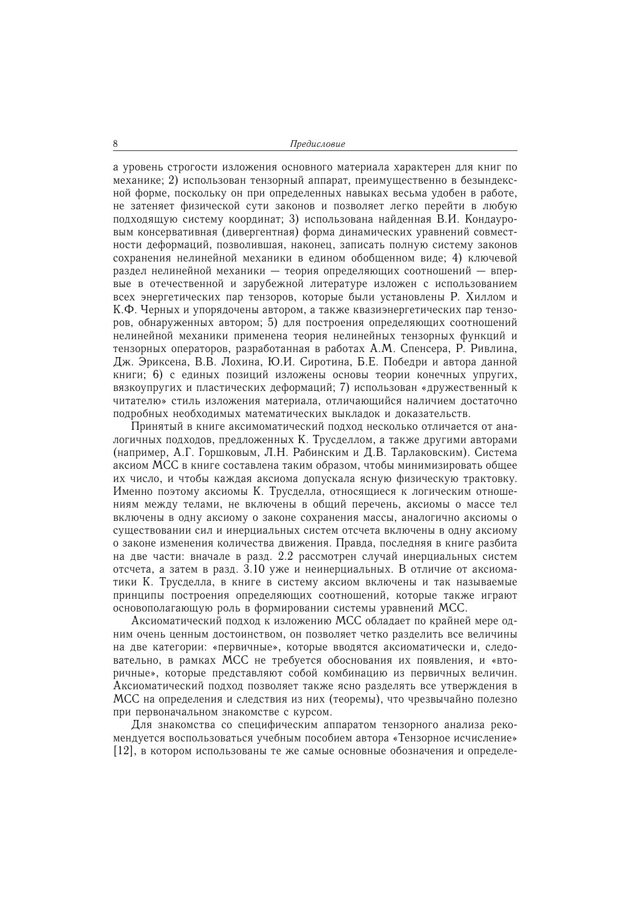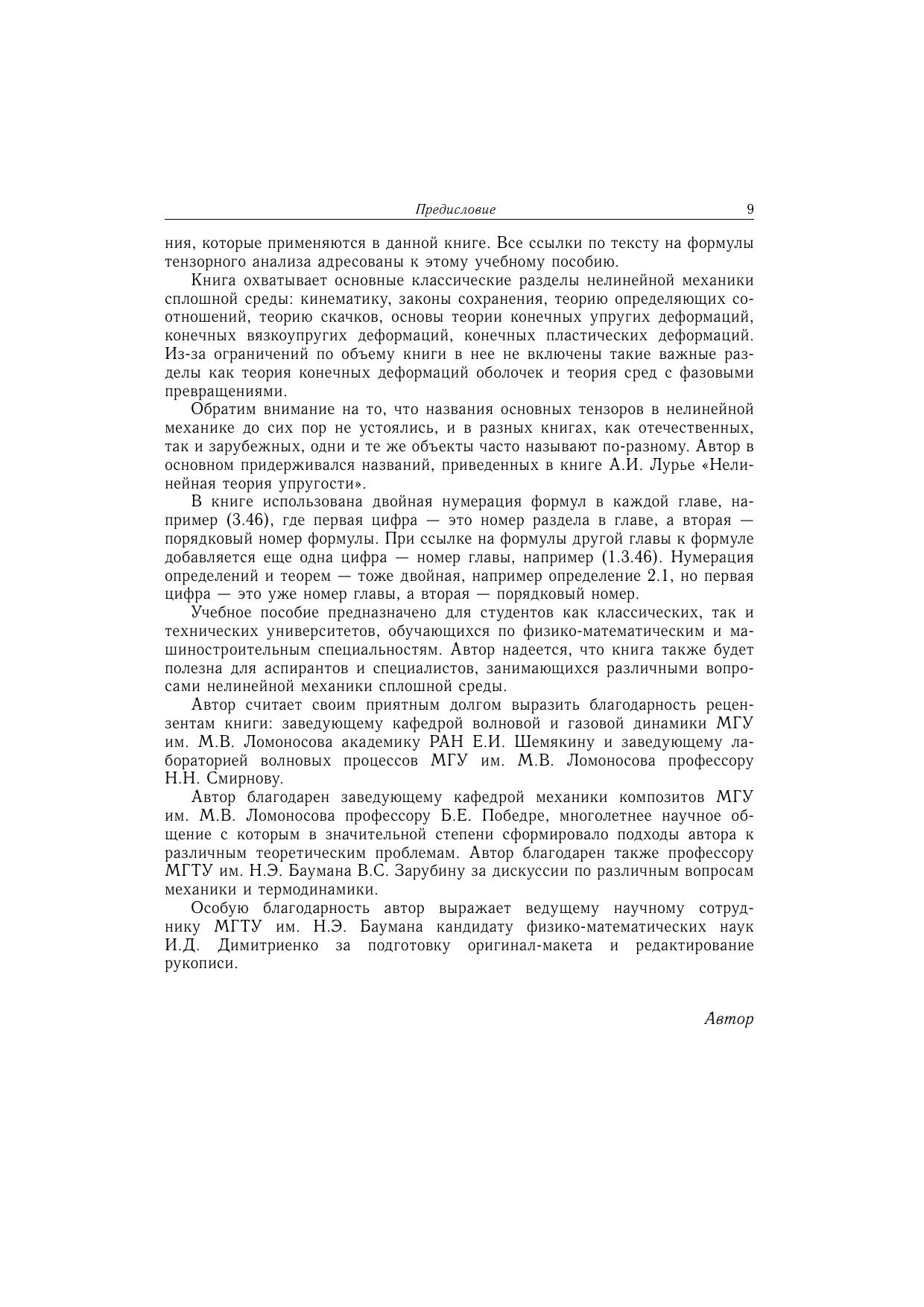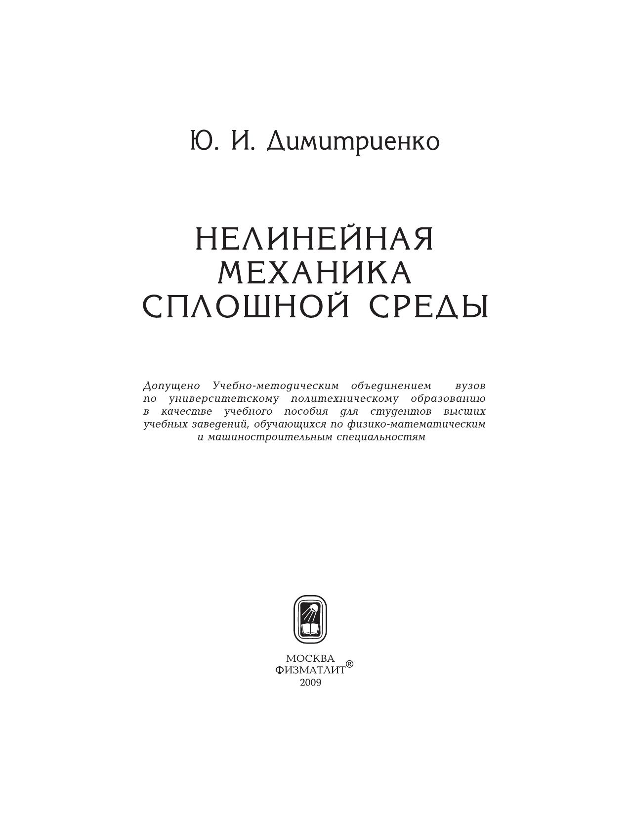 Учебное пособие посвящено систематизированному изложению основ механики сплошной среды при конечных деформациях. Рассмотрена кинематика сплошных сред, универсальные законы сохранения механики сплошной среды, теория скачковфункций на поверхностях сильных разрывов. В систематизированном виде приводится теория коротационных производных, динамические уравнения совместности деформаций, принципы материальной индифферентности и материальной симметрии.Предложен новый подход к формулировке определяющих соотношений для упругих и неупругих сред с конечными деформациями, основанный на применении энергетических и квазиэнергетических пар тензоров напряжений–деформаций. С помощью этого подхода изложена теория конечных упругих и вязкоупругих деформаций, теория больших пластических деформаций, теория анизотропных сред с большими деформациями. В учебном пособии содержится значительное число упражнений. Учебное пособие предназначено студентам и аспирантам, обучающимся по физико-математическим и машиностроительным специальностям, а также специалистам, занимающимся различными вопросами механики сплошной среды.