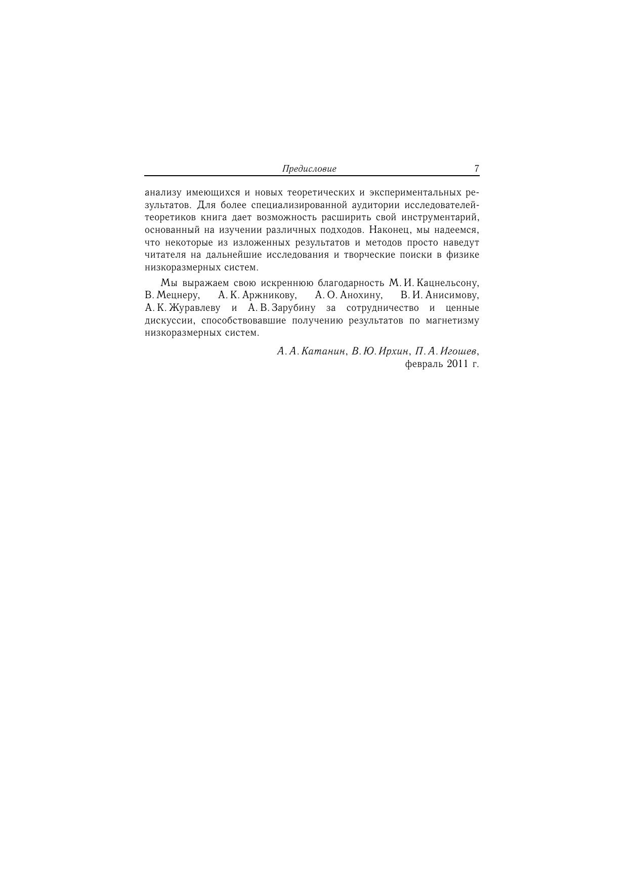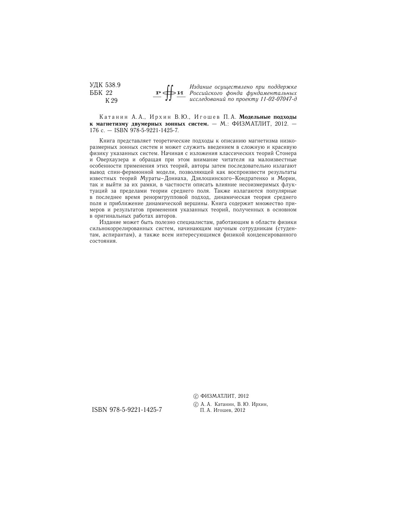 Книга представляет теоретические подходы к описанию магнетизма низкоразмерных зонных систем и может служить введением в сложную и красивую физику указанных систем. Начиная с изложения классических теорий Стонера и Оверхаузера и обращая при этом внимание читателя на малоизвестные особенности применения этих теорий, авторы затем последовательно излагают вывод спин-фермионной модели, позволяющей как воспроизвести результаты известных теорий Мураты–Дониаха, Дзялошинского–Кондратенко и Мории, так и выйти за их рамки, в частности описать влияние несоизмеримых флуктуаций за пределами теории среднего поля. Также излагаются популярные в последнее время ренормгрупповой подход, динамическая теория среднего поля и приближение динамической вершины. Книга содержит множество примеров и результатов применения указанных теорий, полученных в основном в оригинальных работах авторов. Издание может быть полезно специалистам, работающим в области физики сильнокоррелированных систем, начинающим научным сотрудникам (студентам, аспирантам), а также всем интересующимся физикой конденсированного состояния.